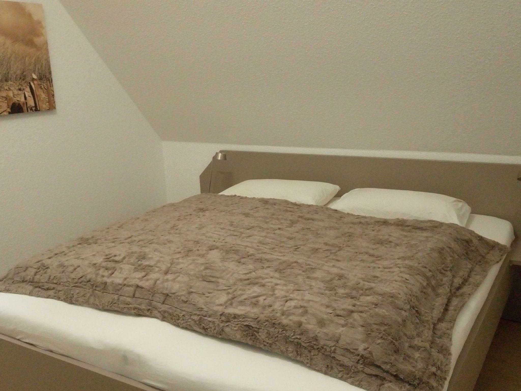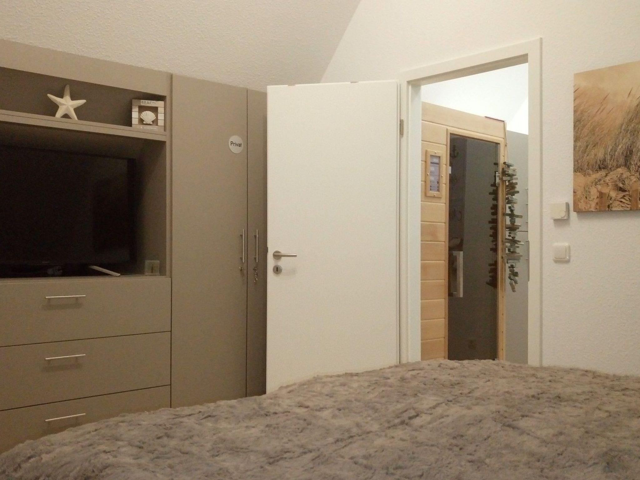 Das im Obergeschoss liegende Schlafzimmer ist mit einem Doppelbett, modernem Wandschrank und TV ausgestattet.