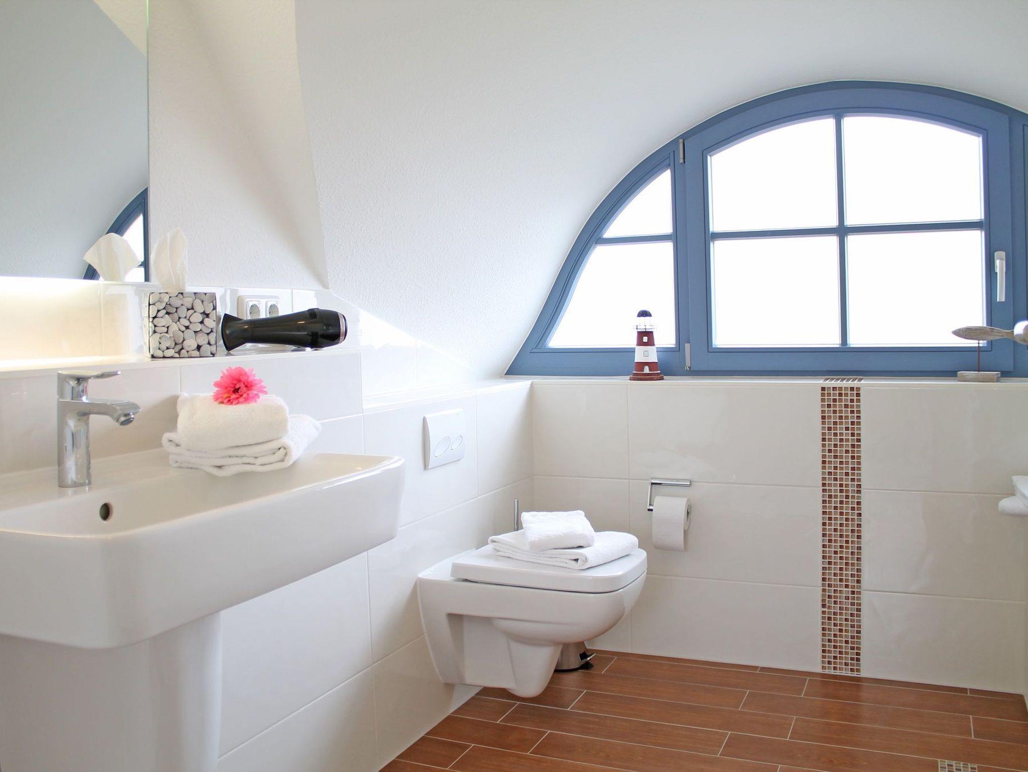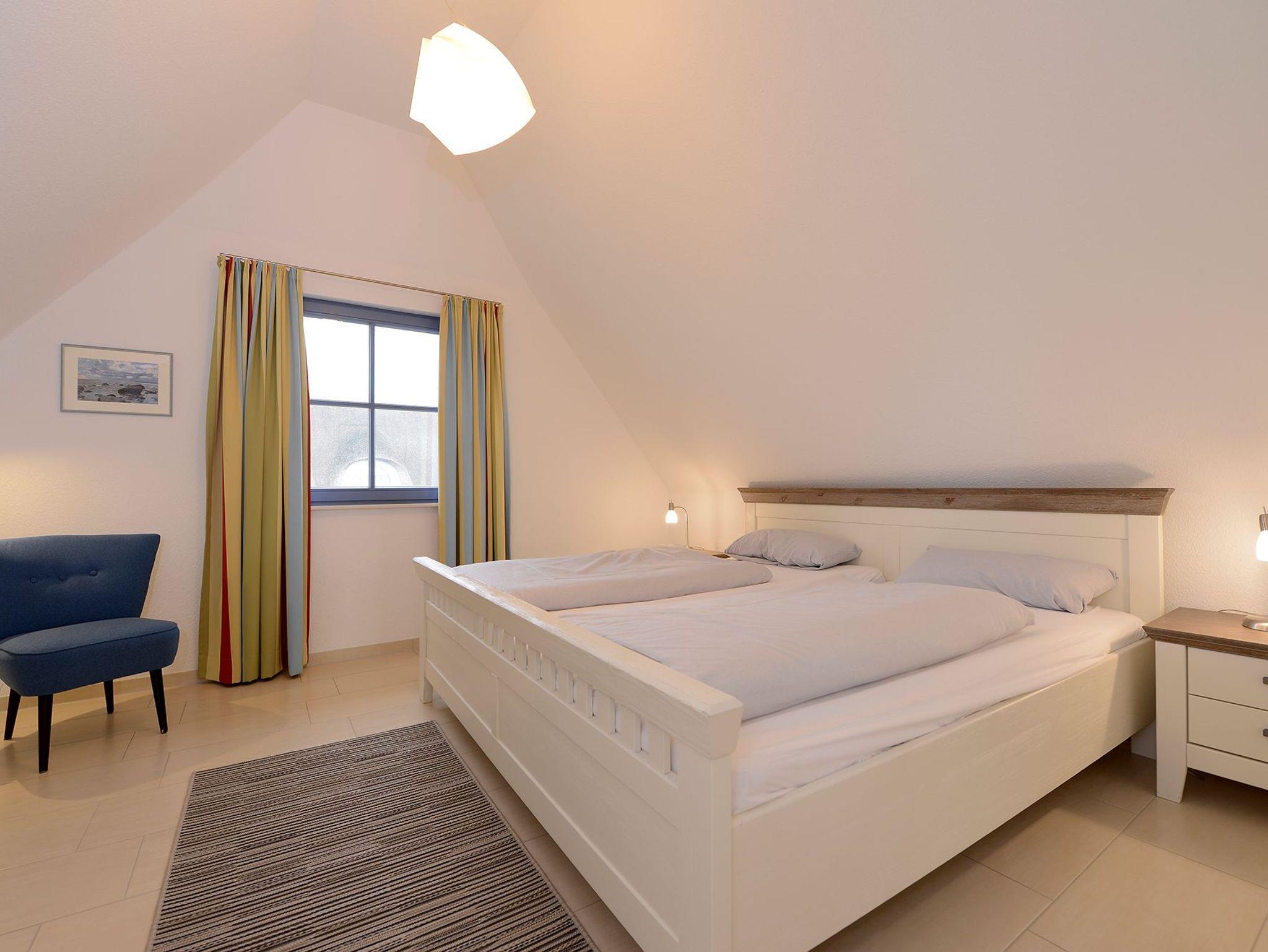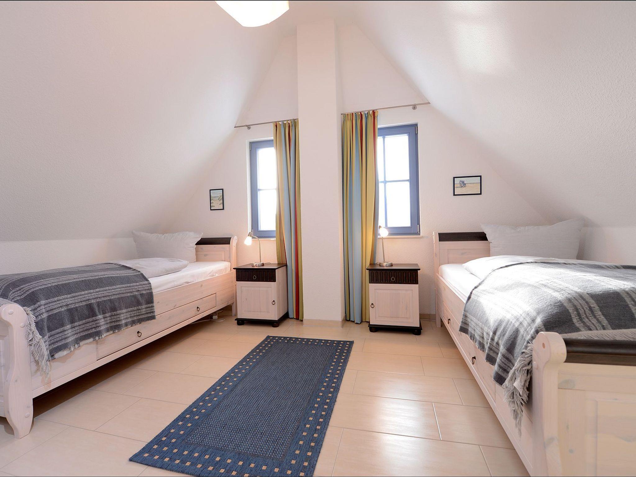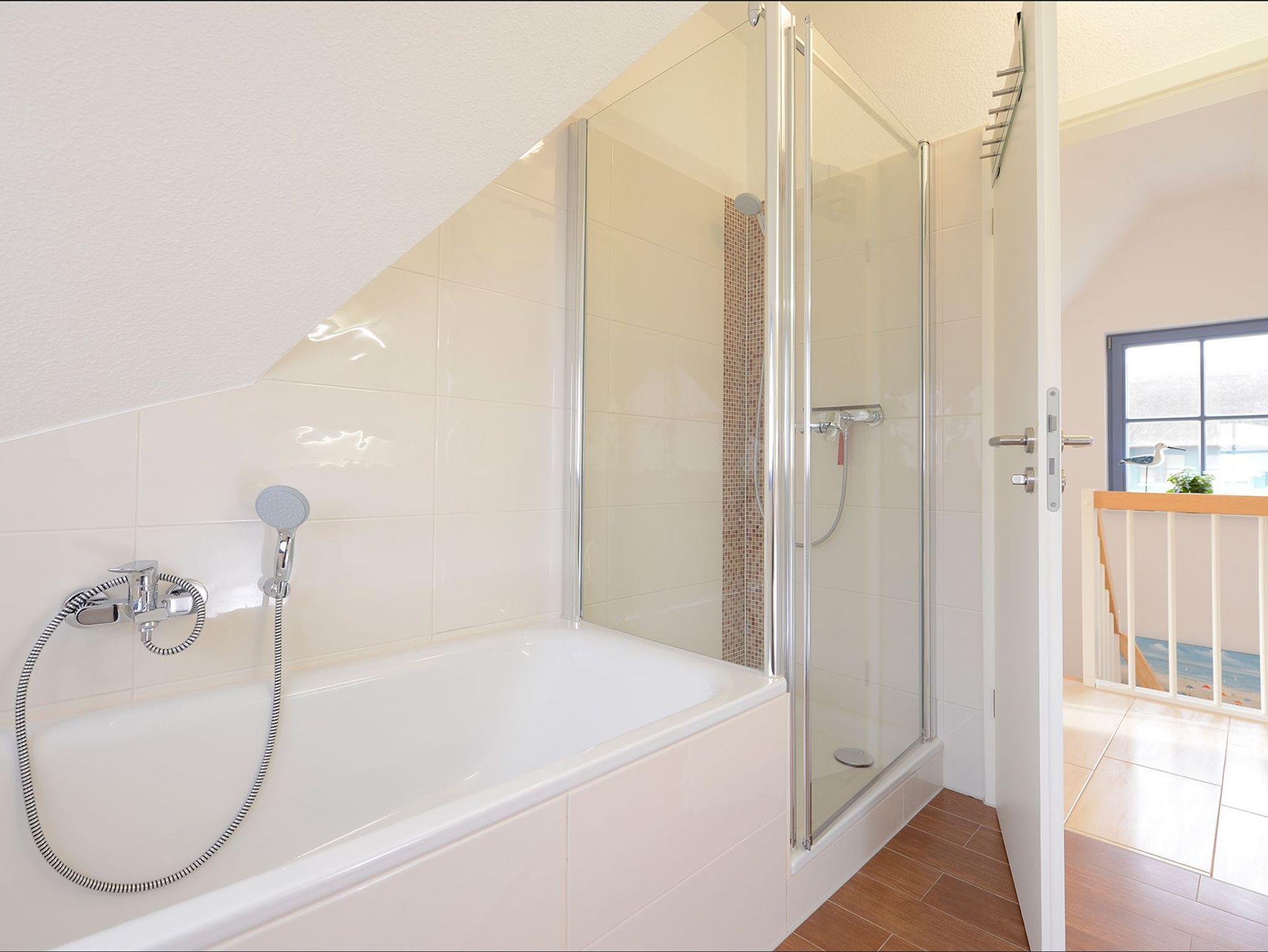 Im Obergeschoss befinden sich zwei Schlafzimmer (1 x Doppelbett, 1 x zwei Einzelbetten). Sowie das Tageslichtbad (Fön) mit Dusche und Badewanne in einer sehr hochwertigen Bauausführung.