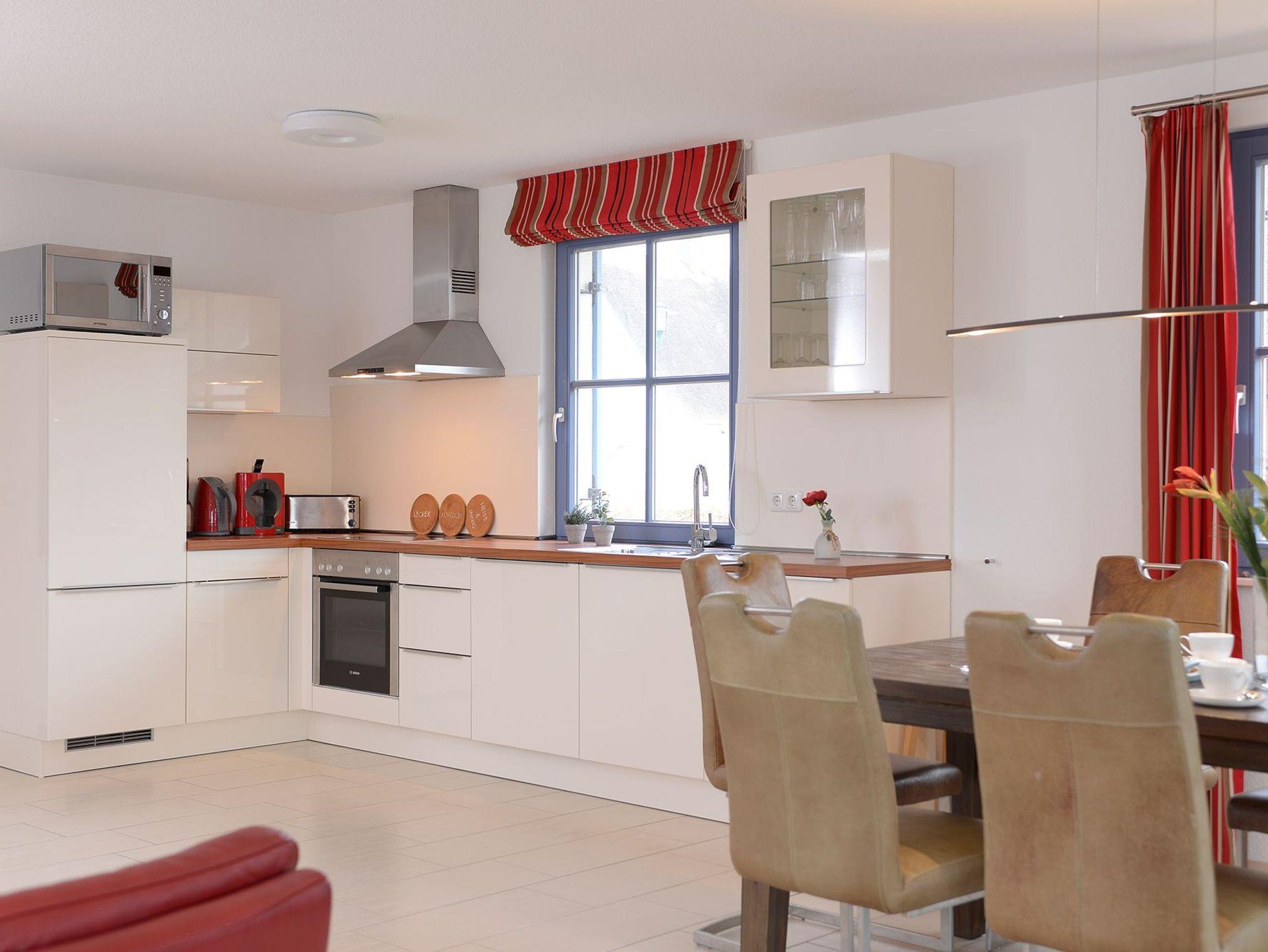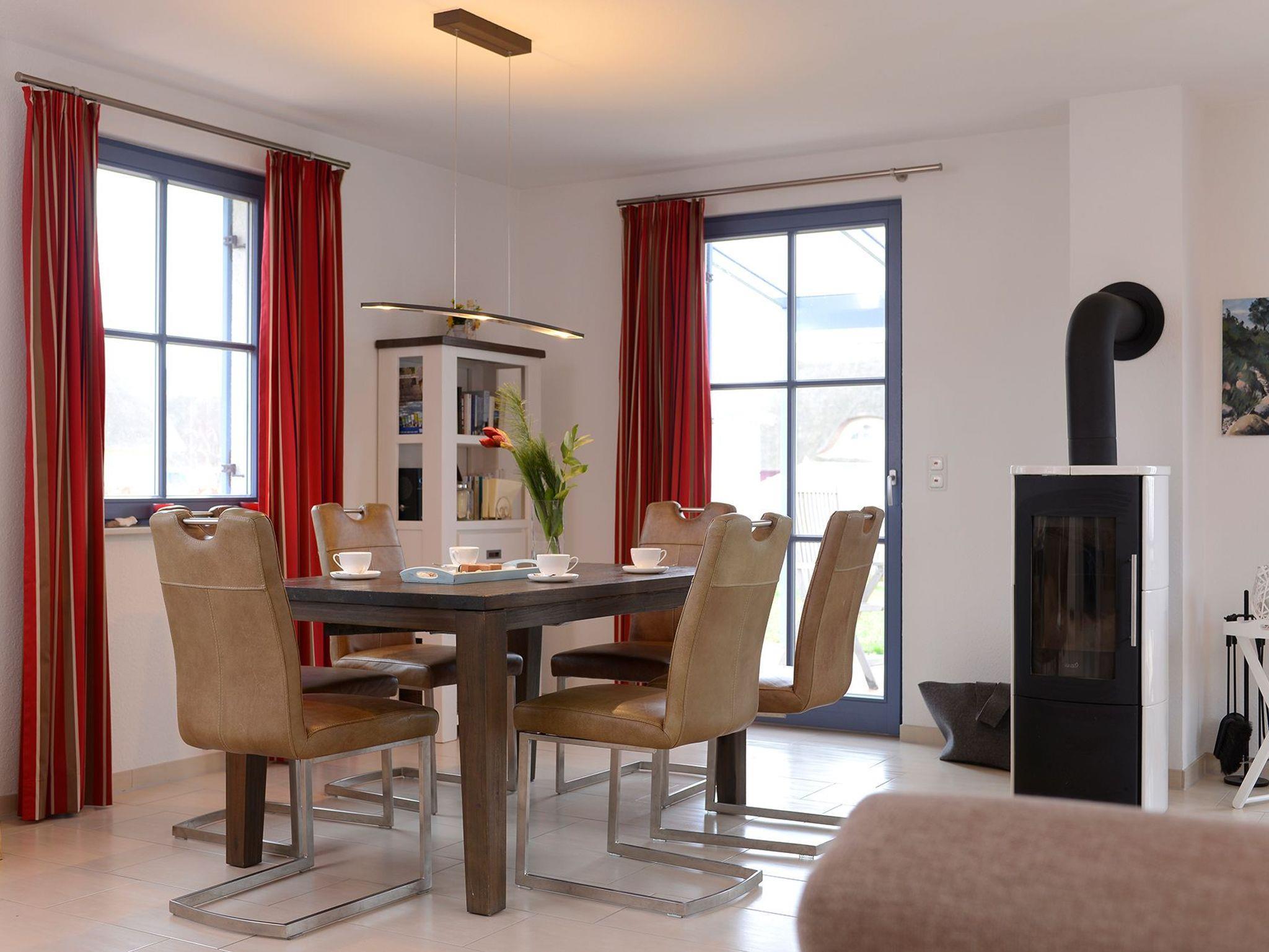 Im Erdgeschoss des Hauses empfängt Sie ein heller und offener Wohn-/ Essbereich (Schlafsofa, Stereo-Anlage mit Bluetoothfunktion, Blue-Ray-Player), inkl. Kaminofen und integrierter Küche (Geschirrspüler, Herd, Kühlschrank mit Gefrierfach, Mikrowelle, Dolce Gusto Kapselautomat, u.v.m.) sowie die Sauna mit zusätzlicher Dusche, das Gäste-WC und der Hauswirtschaftsraum mit Wasch-/ und Trockenautomat. Für Ihre Information und Unterhaltung im Ferienhaus sorgen zahlreiche Reiseführer [&] Karten, Bücher sowie DVDs und Spiele für drinnen und draußen!