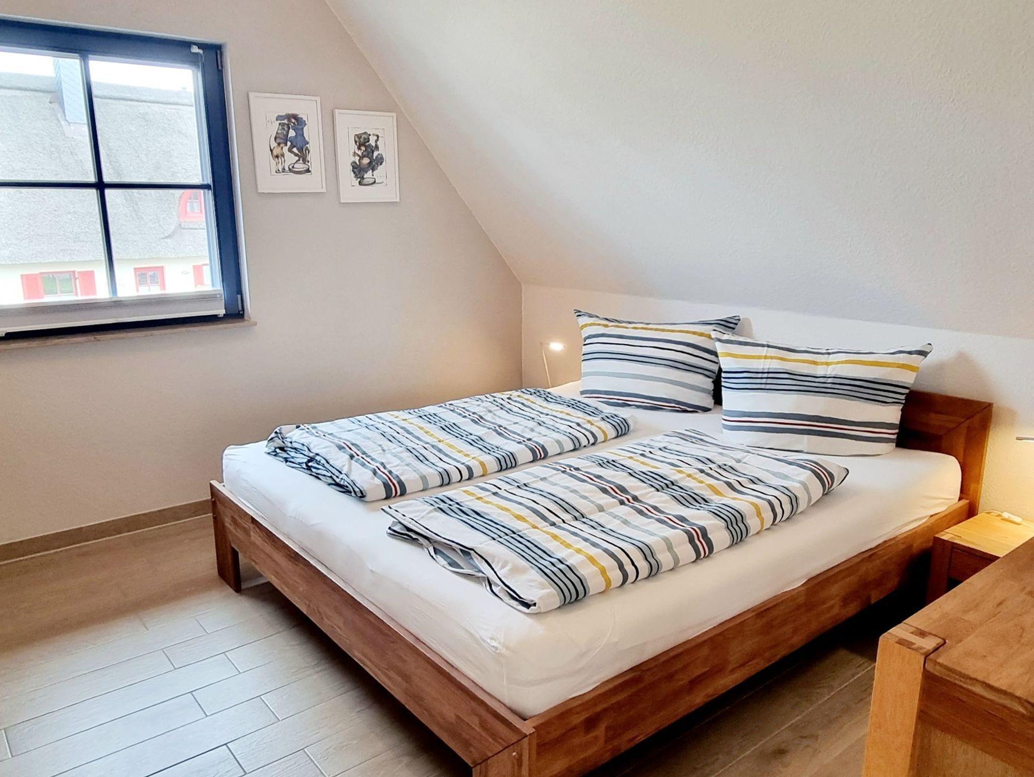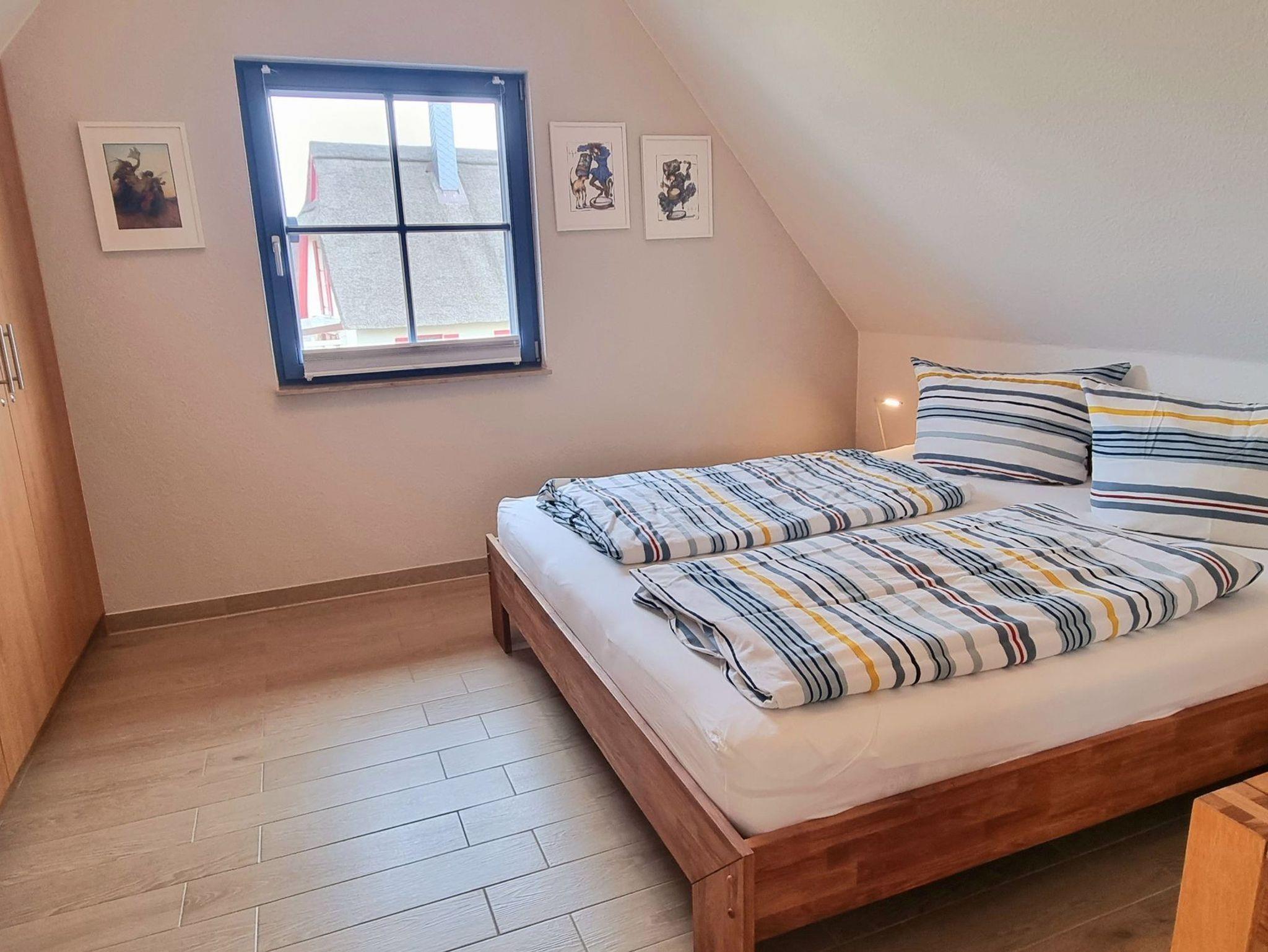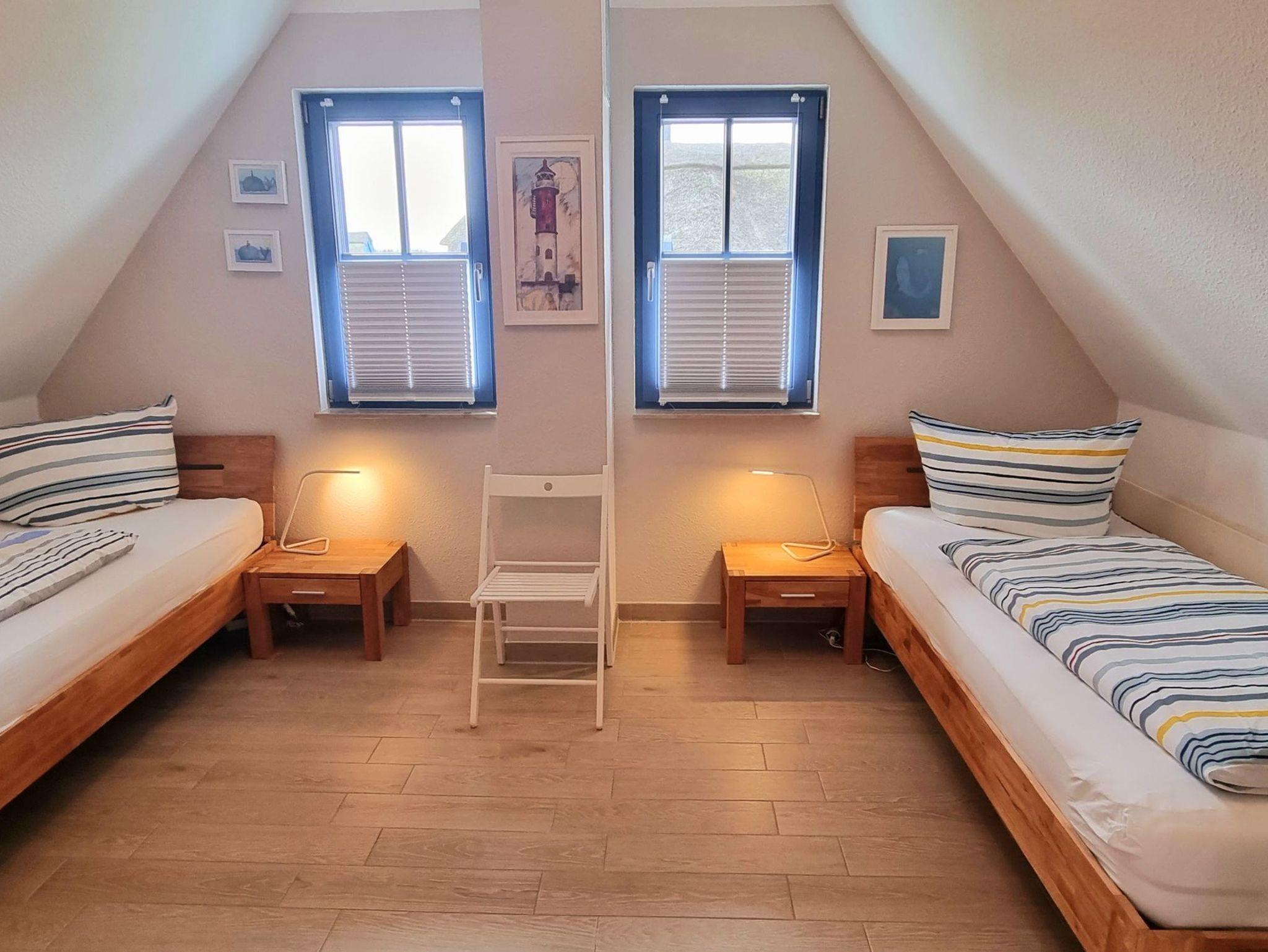 Im Obergeschoss finden Sie zwei großzügige Schlafzimmer (je 15 qm) und ein Bad vor. Das Schlafzimmer mit Seeblick ist mit einem Doppelbett (180x200), einem eingebauten Schlafzimme, einer Kommode, zwei Nachttischen und einem zweiten TV ausgestattet. Ein Kinderreisebett findet hier ebenfalls Platz und kann auf Anfrage zur Verfügung gestellt werden. Im Kinderzimmer befinden sich zwei Einzelbetten (90x200), ein Schrank, eine Kommode und zwei Nachttische. Fliegenschutzgitter zum Lüften sind angebracht. Zum Verdunkeln dienen die Klappläden des Reethauses. Ihr Urlaub beginnt sofort - die Bettwäsche ist inklusive und am Anreisetag bereits frisch bezogen. Das moderne Vollbad unter der charakteristischen Fledermausgaube sorgt für ein behagliches Wohngefühl. Es ist mit hochwertigen Sanitärelementen (eine[nbsp]Badewanne und einer Dusche) ausgestattet. Ein Fön ist ebenfalls vorhanden. Die überdachte Südterrasse ist mit Gartenmöbeln[nbsp]möbliert und der große Garten mit Außengrill lädt zum Entspannen und Spielen ein. Das Gartenhäuschen zum Unterstellen von mitgebrachten Fahrrädern steht im eingefriedetem Garten. Ein Fahrradständer und Parkplatz befinden sich direkt auf dem Grundstück. Der Naturstrand ist in ca. 500 m zu erreichen.