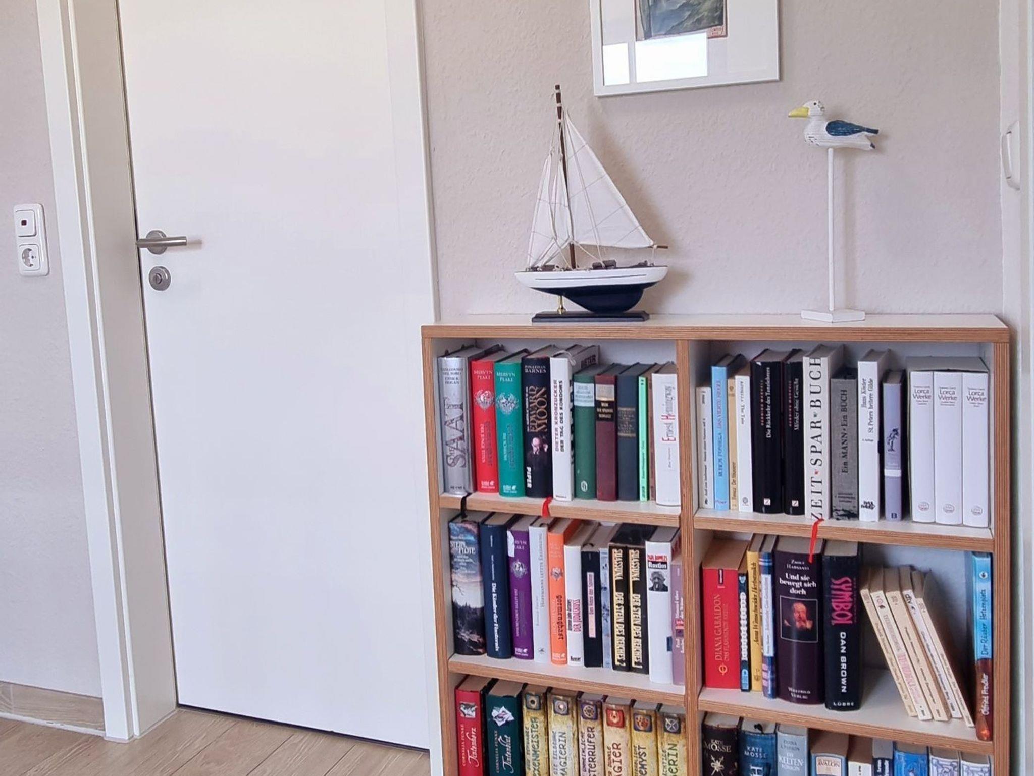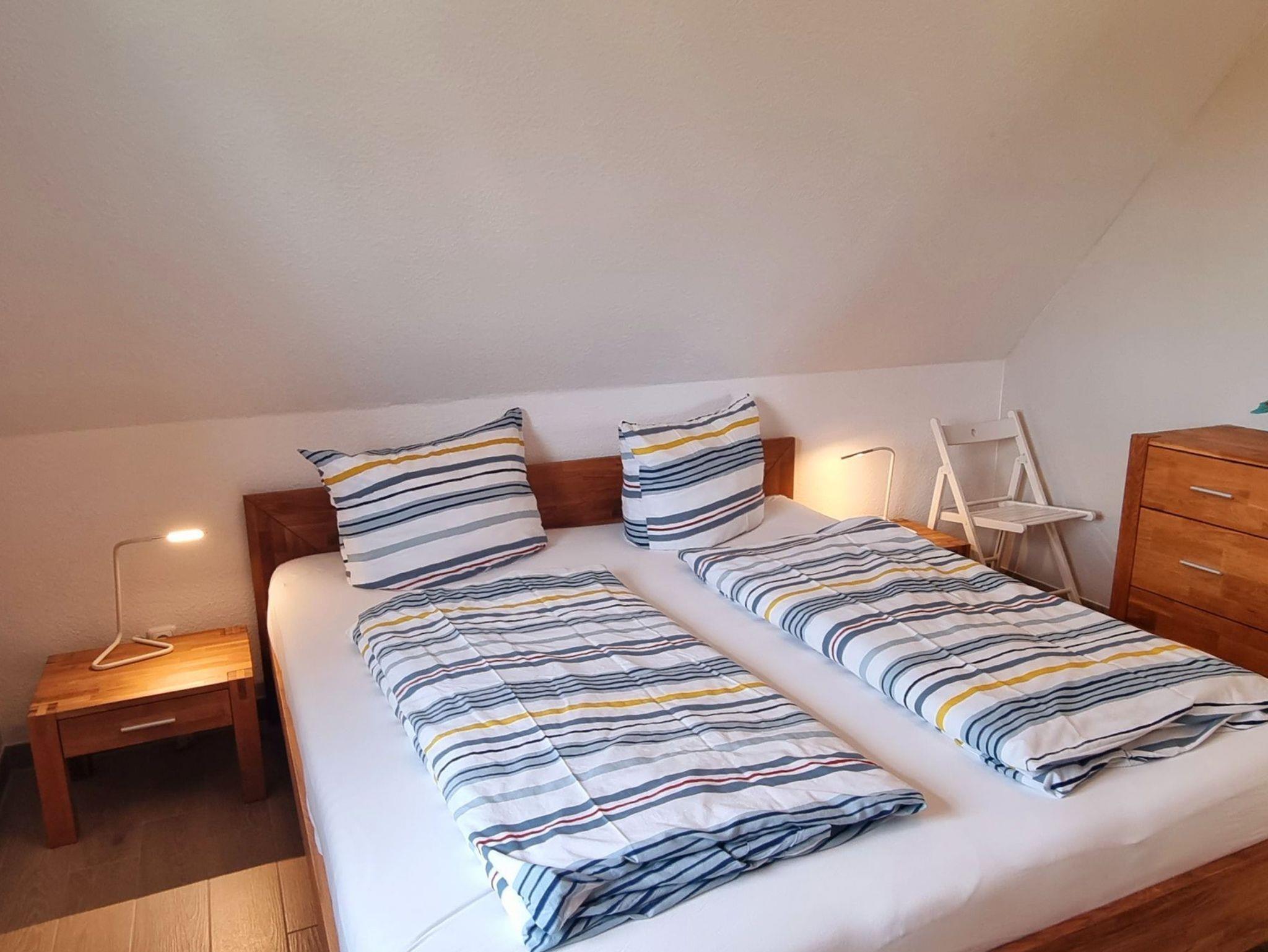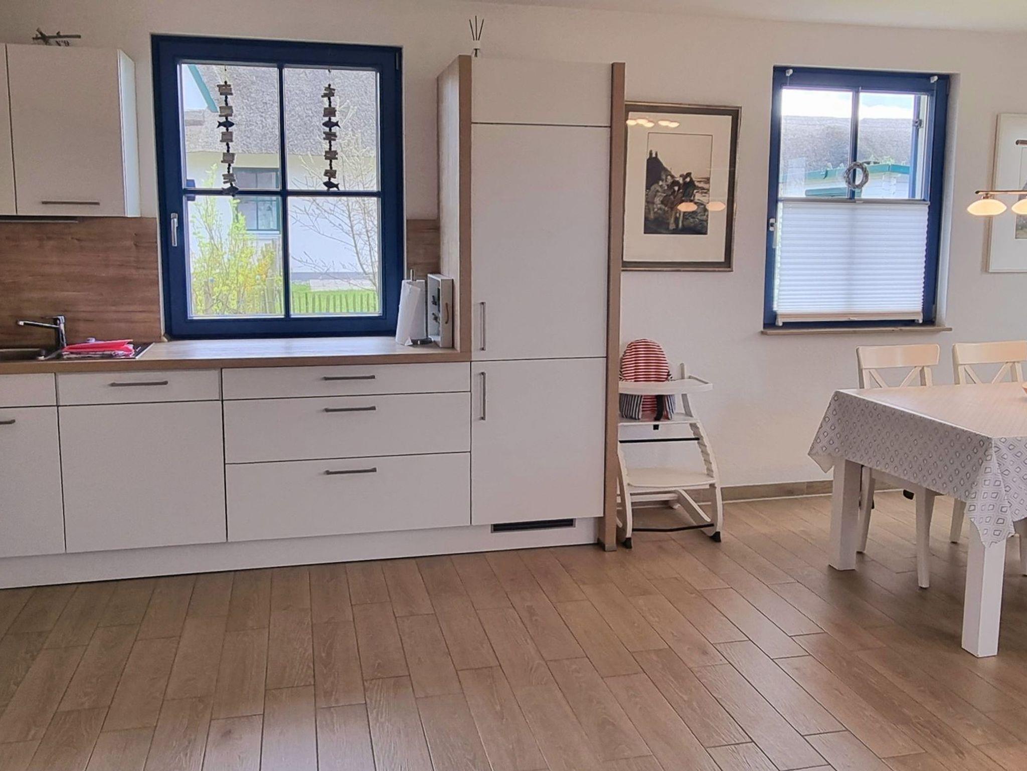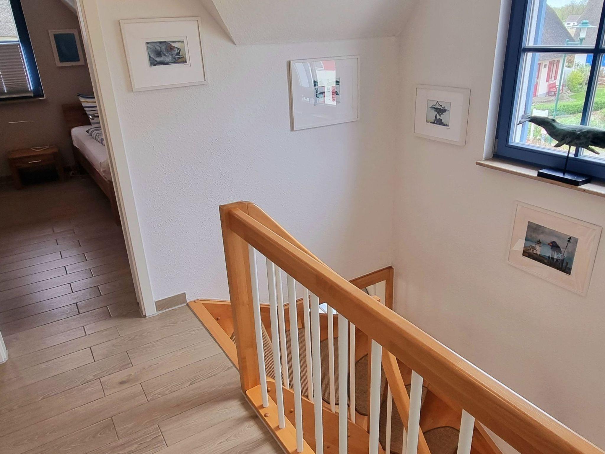 Im Obergeschoss finden Sie zwei großzügige Schlafzimmer (je 15 qm) und ein Bad vor. Das Schlafzimmer mit Seeblick ist mit einem Doppelbett (180x200), einem eingebauten Schlafzimme, einer Kommode, zwei Nachttischen und einem zweiten TV ausgestattet. Ein Kinderreisebett findet hier ebenfalls Platz und kann auf Anfrage zur Verfügung gestellt werden. Im Kinderzimmer befinden sich zwei Einzelbetten (90x200), ein Schrank, eine Kommode und zwei Nachttische. Fliegenschutzgitter zum Lüften sind angebracht. Zum Verdunkeln dienen die Klappläden des Reethauses. Ihr Urlaub beginnt sofort - die Bettwäsche ist inklusive und am Anreisetag bereits frisch bezogen. Das moderne Vollbad unter der charakteristischen Fledermausgaube sorgt für ein behagliches Wohngefühl. Es ist mit hochwertigen Sanitärelementen (eine[nbsp]Badewanne und einer Dusche) ausgestattet. Ein Fön ist ebenfalls vorhanden. Die überdachte Südterrasse ist mit Gartenmöbeln[nbsp]möbliert und der große Garten mit Außengrill lädt zum Entspannen und Spielen ein. Das Gartenhäuschen zum Unterstellen von mitgebrachten Fahrrädern steht im eingefriedetem Garten. Ein Fahrradständer und Parkplatz befinden sich direkt auf dem Grundstück. Der Naturstrand ist in ca. 500 m zu erreichen.