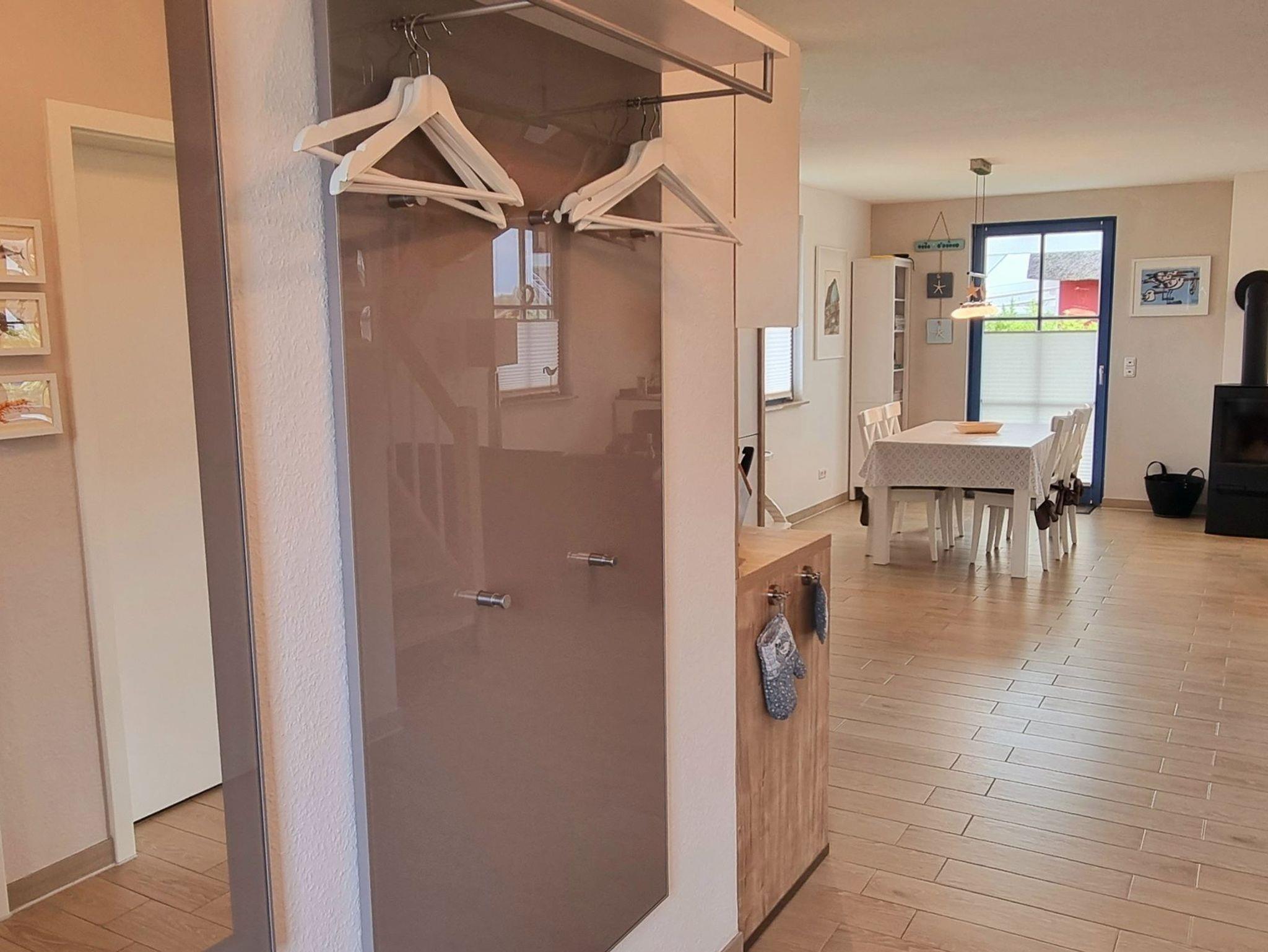 Das in 2014 errichtete Reetdachhaus mit einer Wohnfläche von 97 qm befindet sich in der neuen Ferienhaussiedlung ?De Poeler Drift? in Zierow. Das mit Echtholzmöbeln, Sprossenfenstern und Fensterläden ausgestattete Feriendomizil lädt zu jeder Jahreszeit an die mecklenburgische Ostsee ein. Ob im schönen Sommer, denn der Strand ist nicht weit, zudem gibt es einen umlaufenden Garten, aber auch in der kälteren oder auch schmuddeligen Jahreszeit, denn sowohl eine Sauna als auch ein Kaminofen sind vorhanden. Es erwartet Sie ein komplett gefliestes, mit Fußbodenheizung ausgestattetes Reetdachhaus. Eine hochwertige Innenausstattung lässt keine Wünsche offen. Das Erdgeschoss empfängt Sie mit einem großen Wohn-/Essbereich mit offener Küche und bietet ausreichend Platz für die ganze Familie. Die integrierte Küche ist voll ausgestattet mit einem hochwertigen Backofen mit Induktionskochfeld, einem Kühlschrank mit Gefrierfach, einem Geschirrspüler, Kaffeemaschine, Toaster und Wasserkocher, aber auch ein Eierkocher und Mixer sind vorhanden. Eine Ledercouchgarnitur und Sessel laden zu einem gemütlichen Abend ein. Ein Flach-TV, Blue-Ray-Player und Bluetooth-Stereoanlage bieten Unterhaltung, zudem stehen einige Bücher, Reiseführer und Spiele zur Verfügung. Im Wohnbereich steht der Kaminofen, der wohlige Wärme in der kalten Jahreszeit schenkt. Kaminholz ist mitzubringen. Der Essbereich bietet Platz für 4 Personen, ein Kinderhochstuhl ist zusätzlich vorhanden. Weiterhin befinden sich im EG ein Tageslicht-Gäste-WC, eine Sauna mit Komfortdusche und ein Hauswirtschaftsraum mit Waschmaschine, Wäscheständer, Staubsauger, Bügeleisen, Bügelbrett und Putzutensilien.