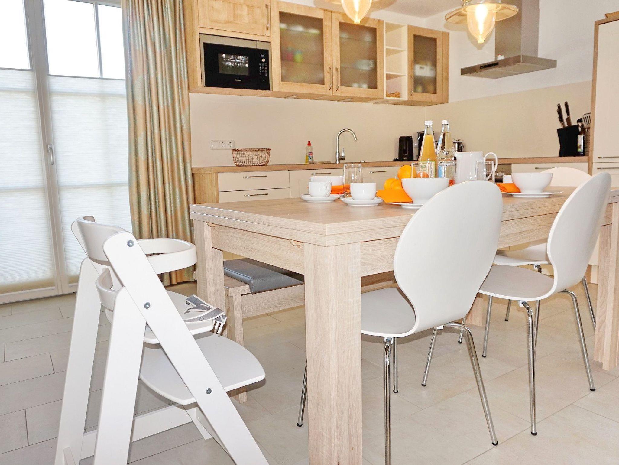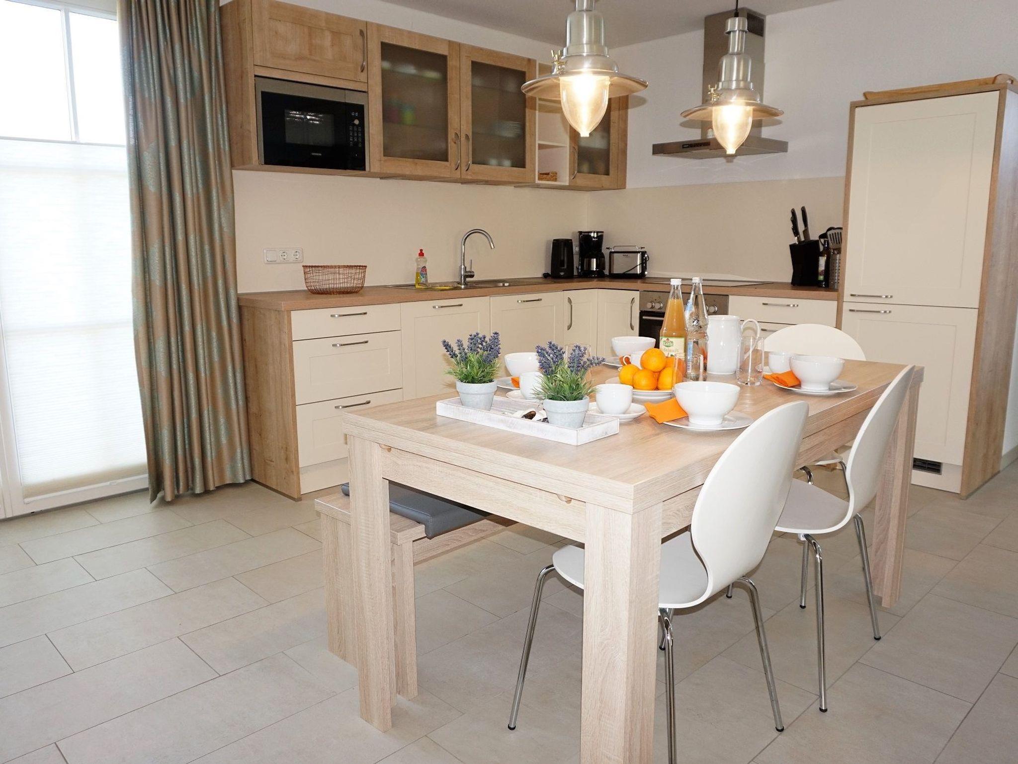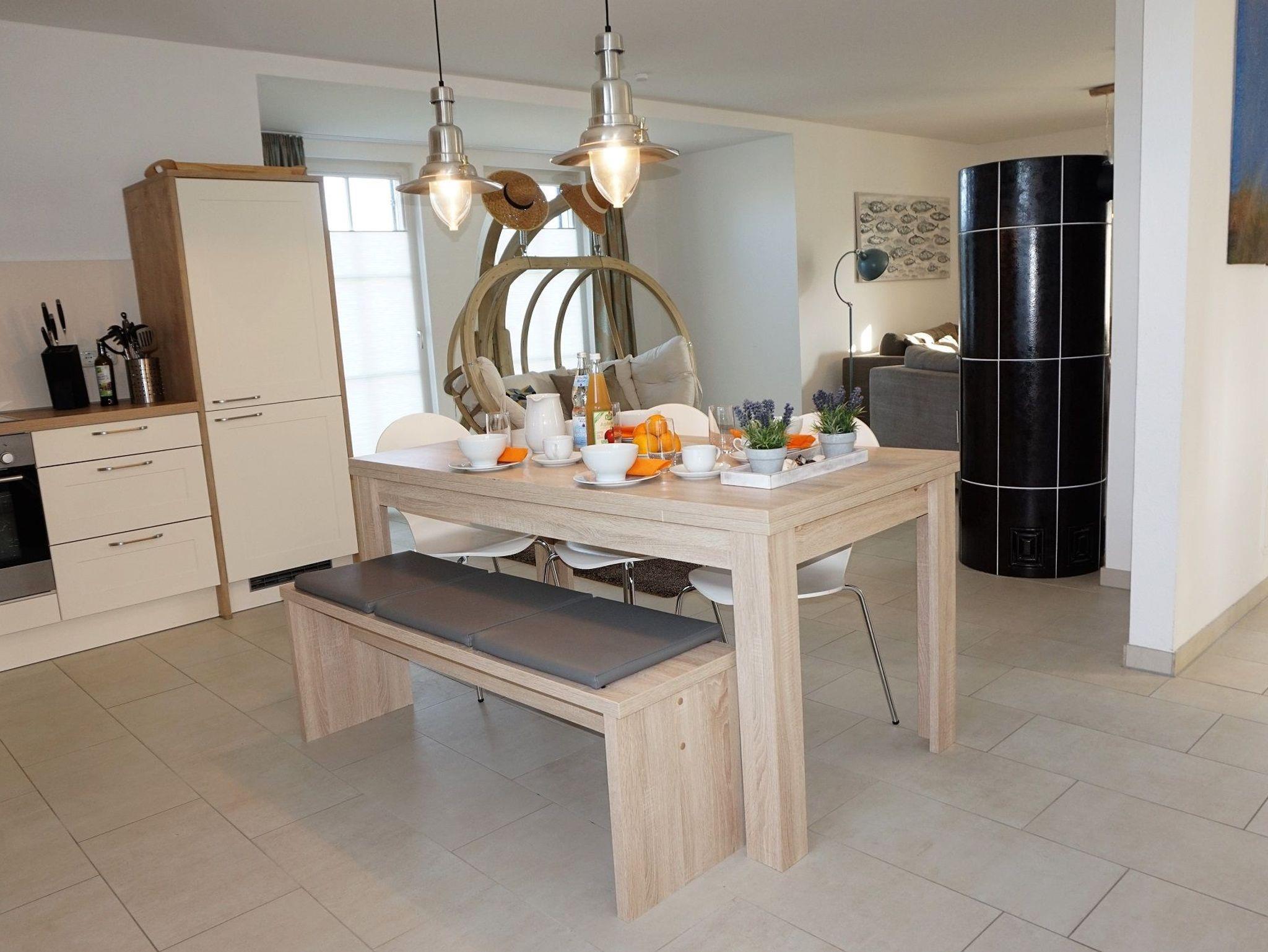 Im Erdgeschoss des Hauses empfängt Sie ein heller und offener Wohn-/ Essbereich mit integrierter moderner Küche. Die hochwertige Ausstattung(Geschirrspüler, Kühlschrank, Herd, Mikrowelle, u.v.m.) lässt keine Wünsche offen. Mit einem guten Buch oder etwas Musik können Sie in der Sitzlounge vor dem Kamin entspannen und Ihre Zeit an der Ostsee genießen. Die gemütliche Sofalandschaft lädt zum Verweilen und gemütlichen Spieleabenden ein.