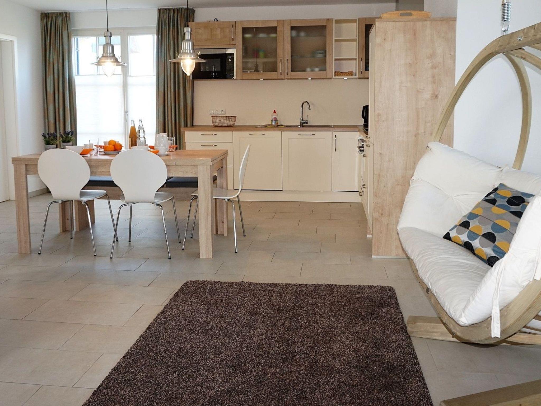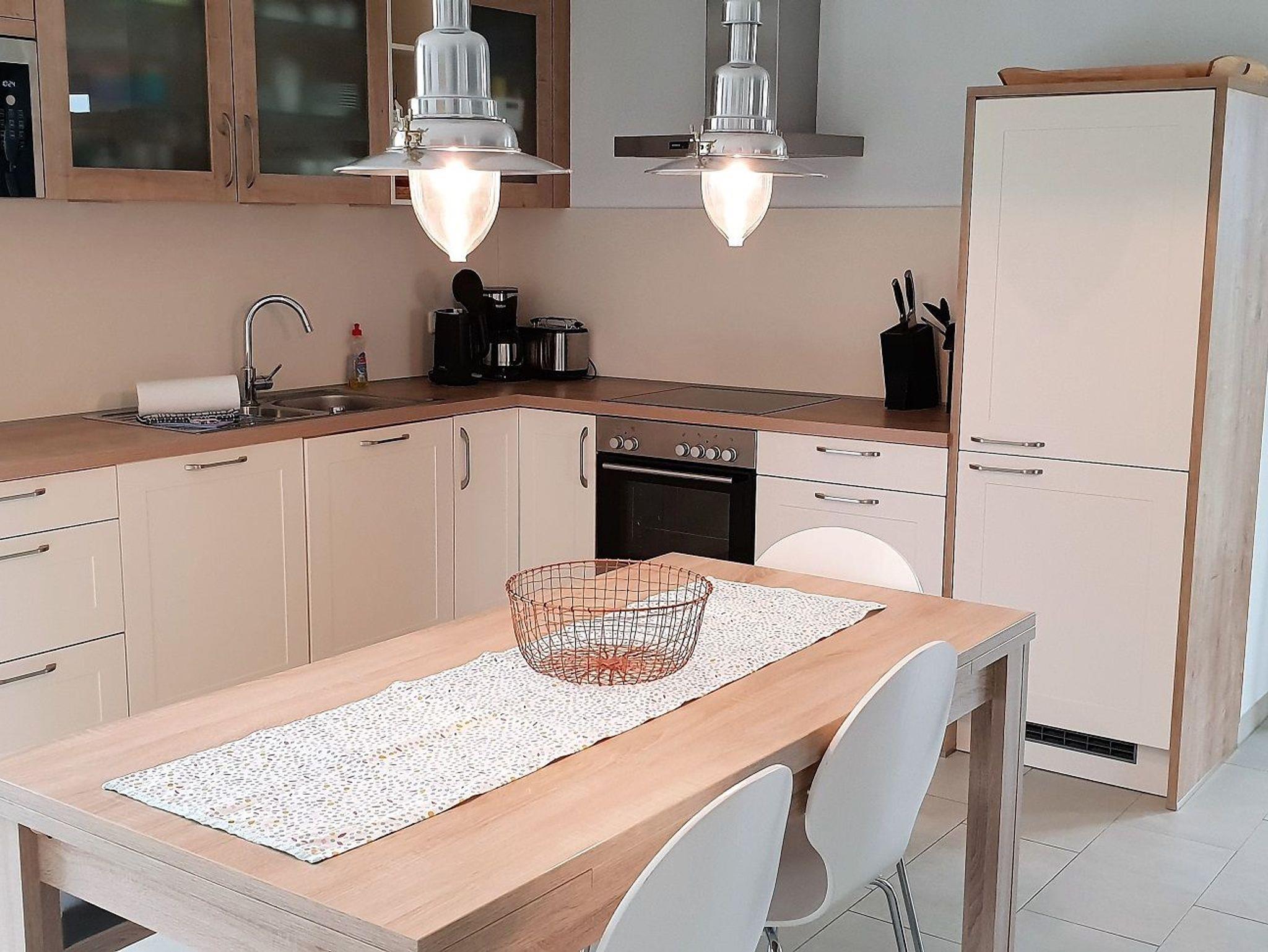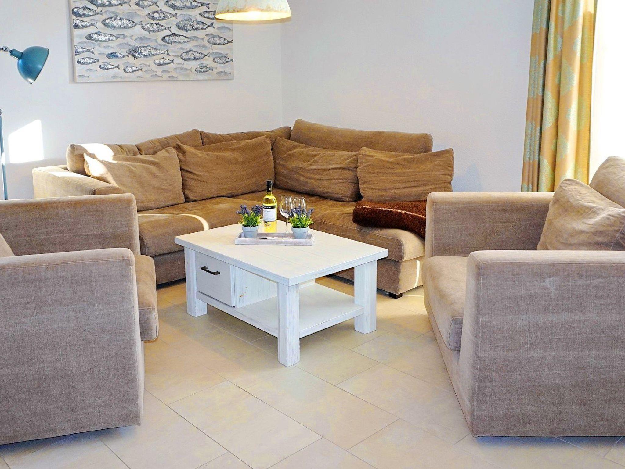 Im Erdgeschoss des Hauses empfängt Sie ein heller und offener Wohn-/ Essbereich mit integrierter moderner Küche. Die hochwertige Ausstattung(Geschirrspüler, Kühlschrank, Herd, Mikrowelle, u.v.m.) lässt keine Wünsche offen. Mit einem guten Buch oder etwas Musik können Sie in der Sitzlounge vor dem Kamin entspannen und Ihre Zeit an der Ostsee genießen. Die gemütliche Sofalandschaft lädt zum Verweilen und gemütlichen Spieleabenden ein.