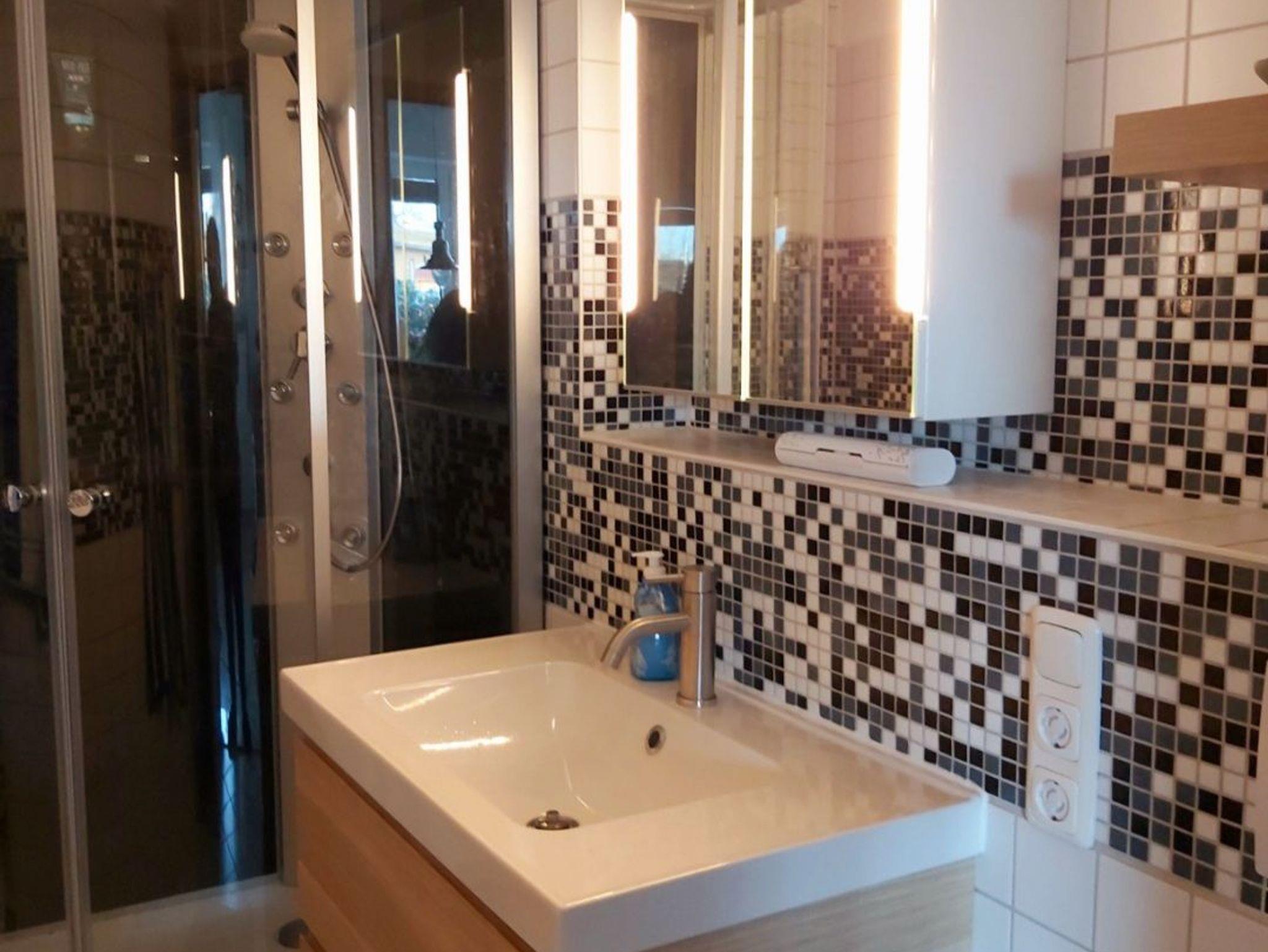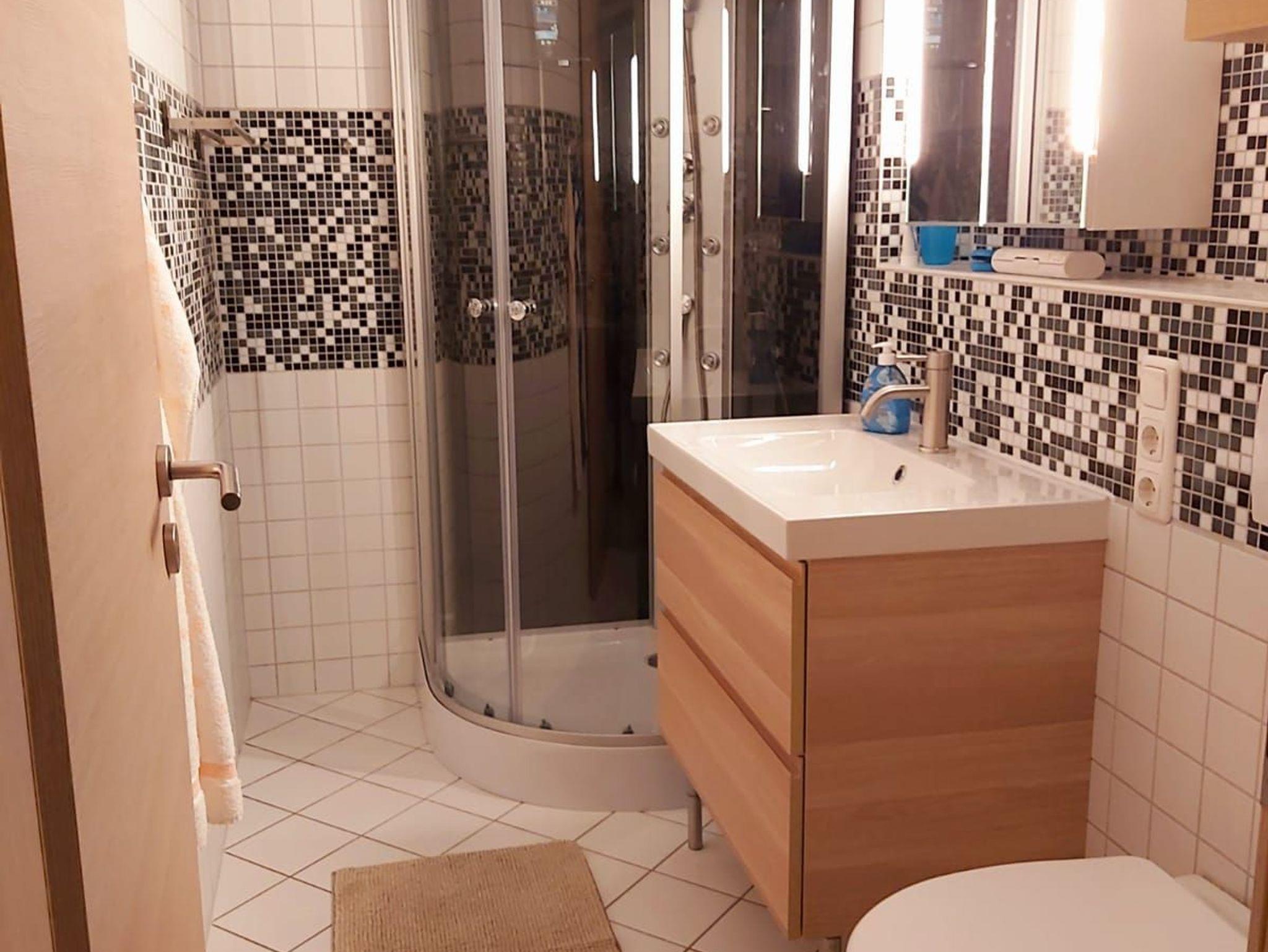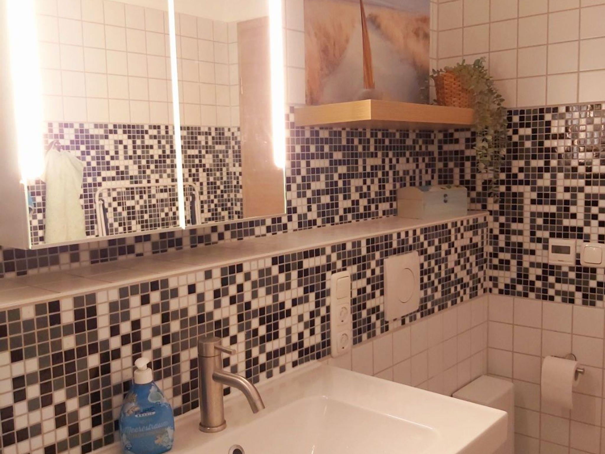 - Duschbad mit Dusche, WC, Waschbeckenschrank, Spiegelschrank, Fußbodenheizung und Föhn