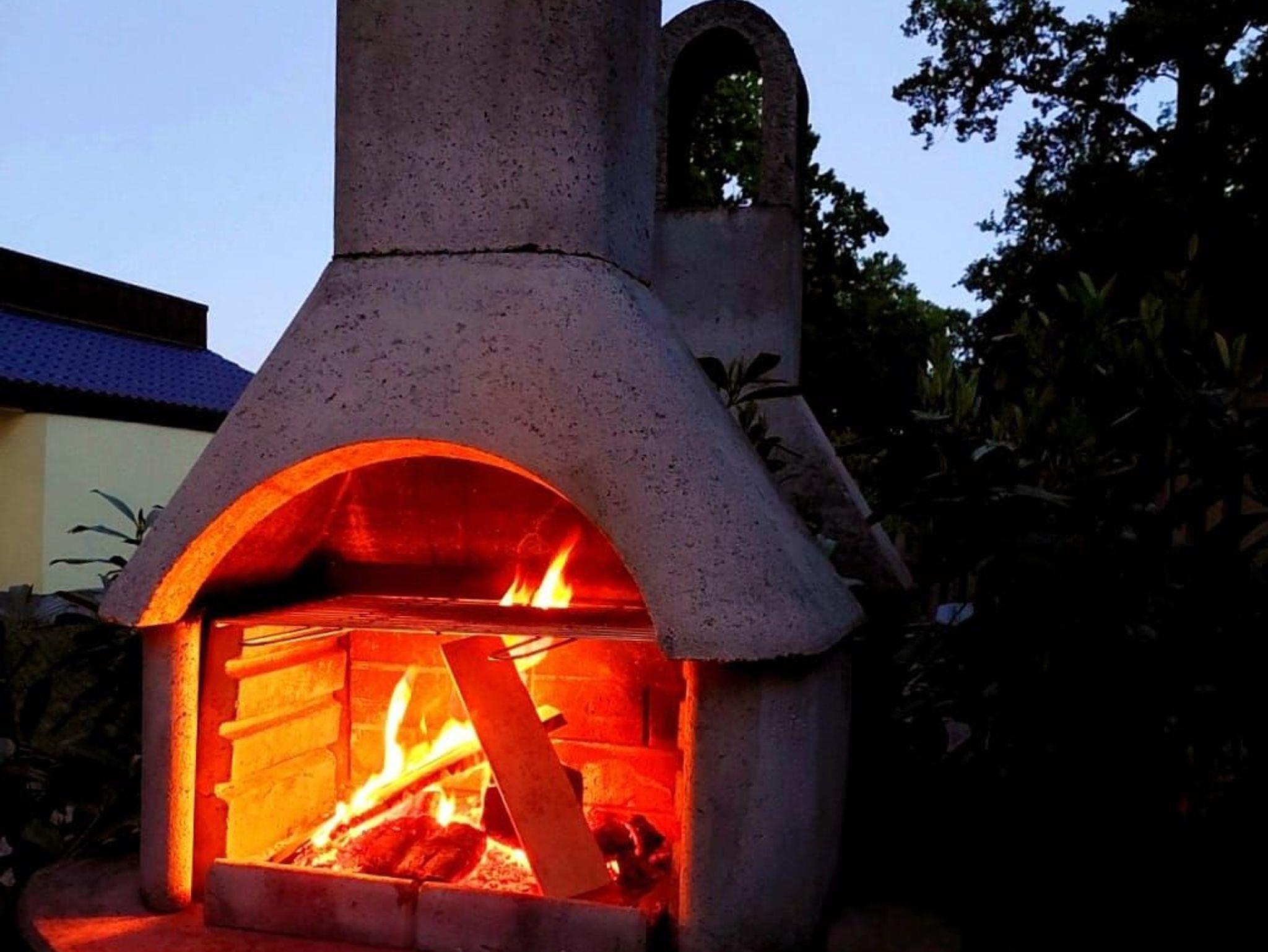 - Terrasse mit Gartenmöbel, Strandkorb und Kamingrill