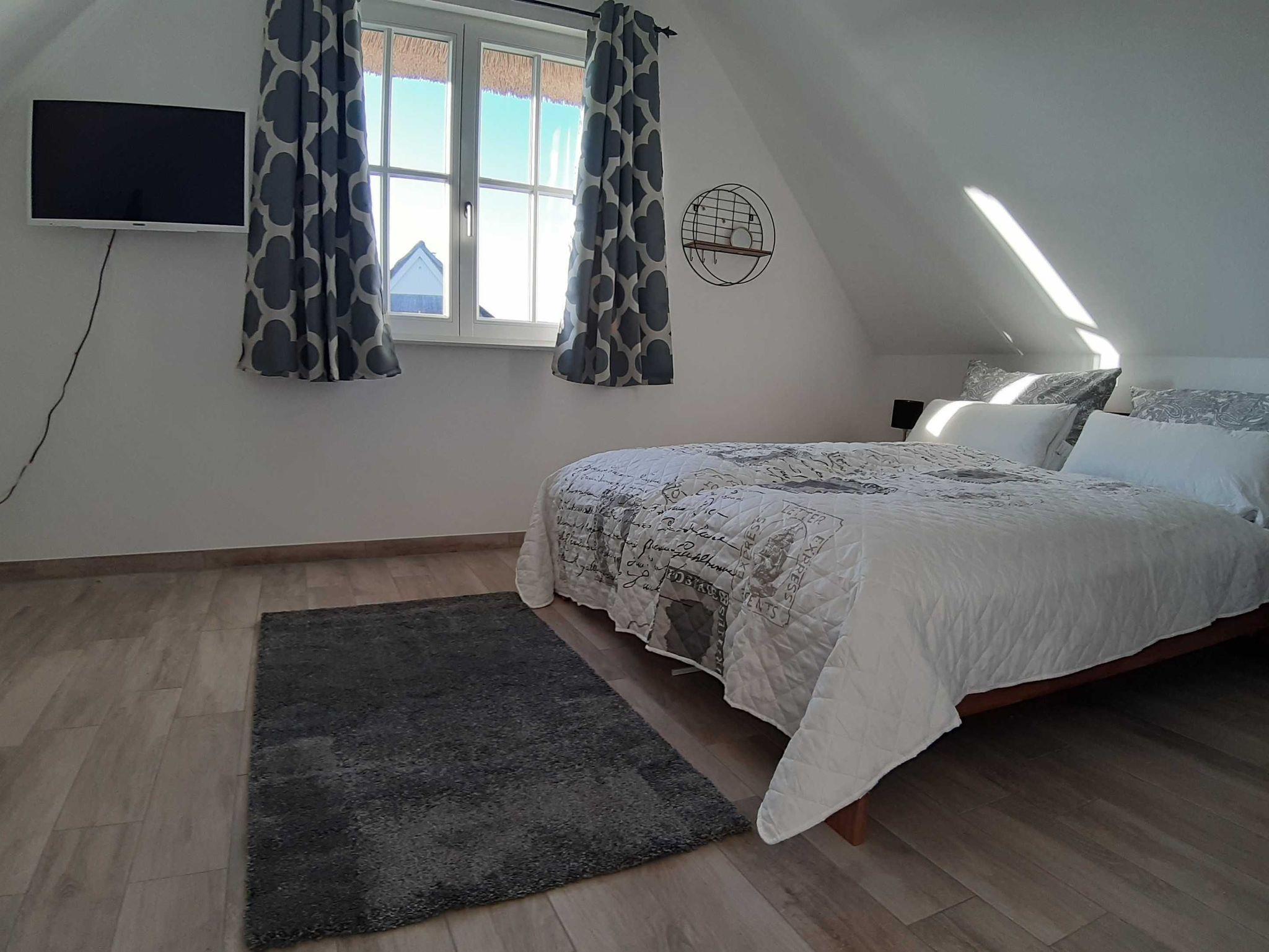 Obergeschoß: ein Schlafzimmer mit Doppelbett und Kommode und ein modernes Badezimmer mit Dusche / WC und eine private Sauna für die kalten Wintertage, im Wäschepaket ist auch ein Sauna-Handtuch vorhanden.