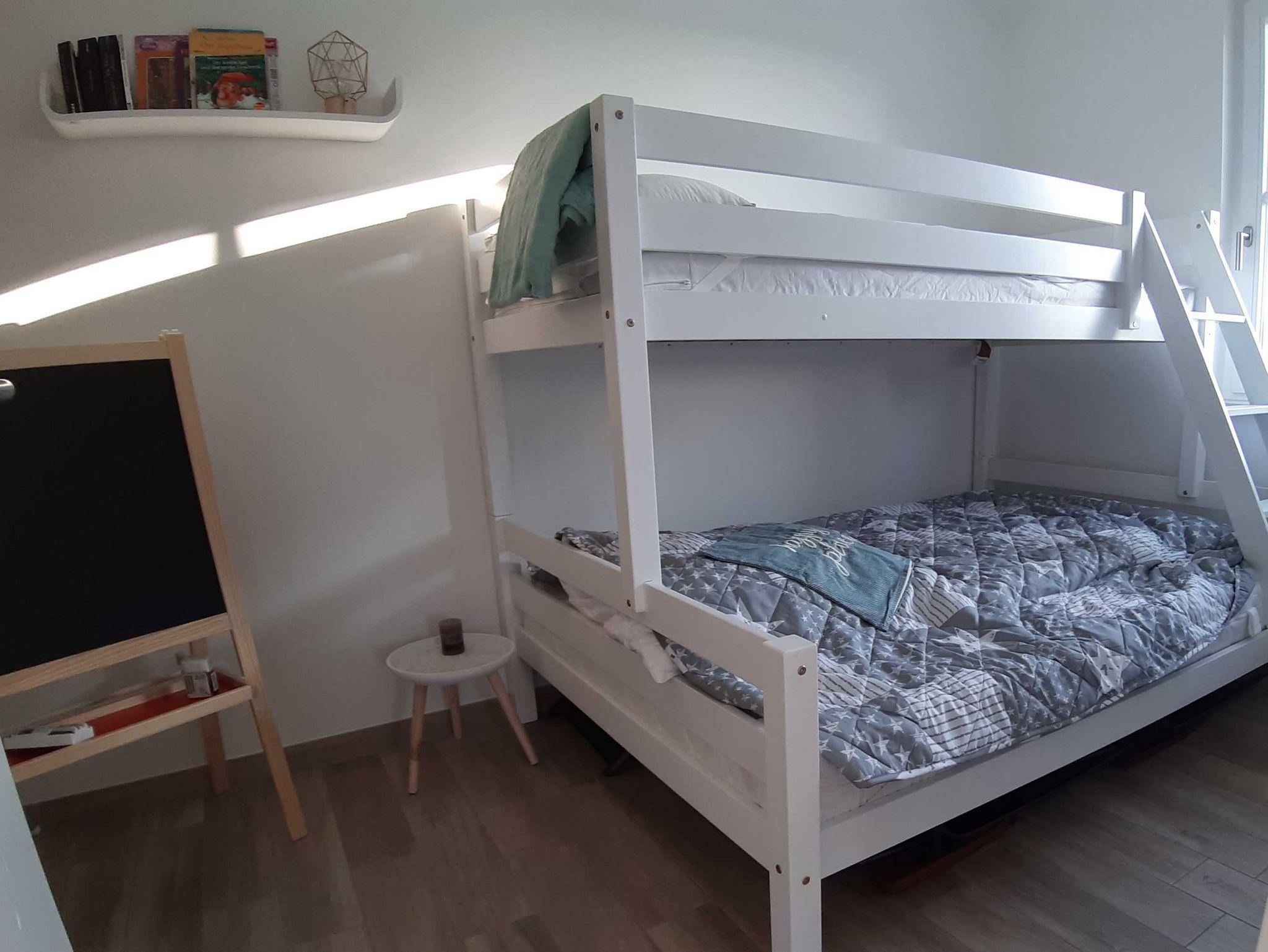 Ein Schlafzimmer mit Etagenbett für 3 Personen (untere Liegefläche 140 x 200 cm / obere Liegefläche 90 x 200 cm), ein Hauswirtschaftsraum mit Waschmachine und Waschständer. Das Schlafsofa im Wohnzimmer ist mit wenigen Handgriffen in ein komfortables Bett für 1-2 Personen zu verwandeln.
