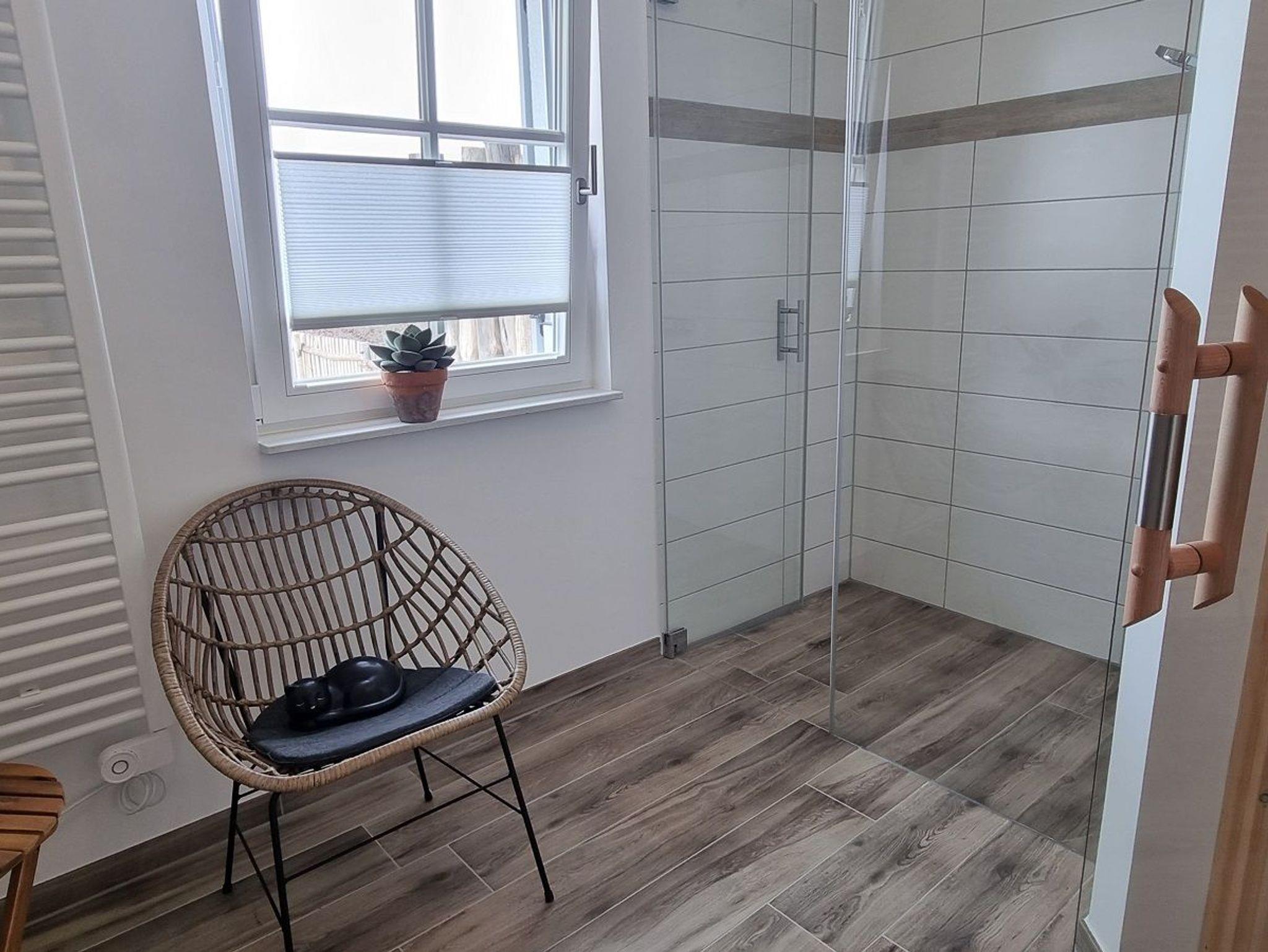 Das Gartenhäuschen im Garten bietet nicht nur Unterstellmöglichkeit für mitgebrachte Räder. Ein elektrischer Grill und Holzmöbel für die umlaufende Terrasse finden dort Ihren Platz. Genießen Sie den Wiesenblick vom hauseigenen Strandkorb.