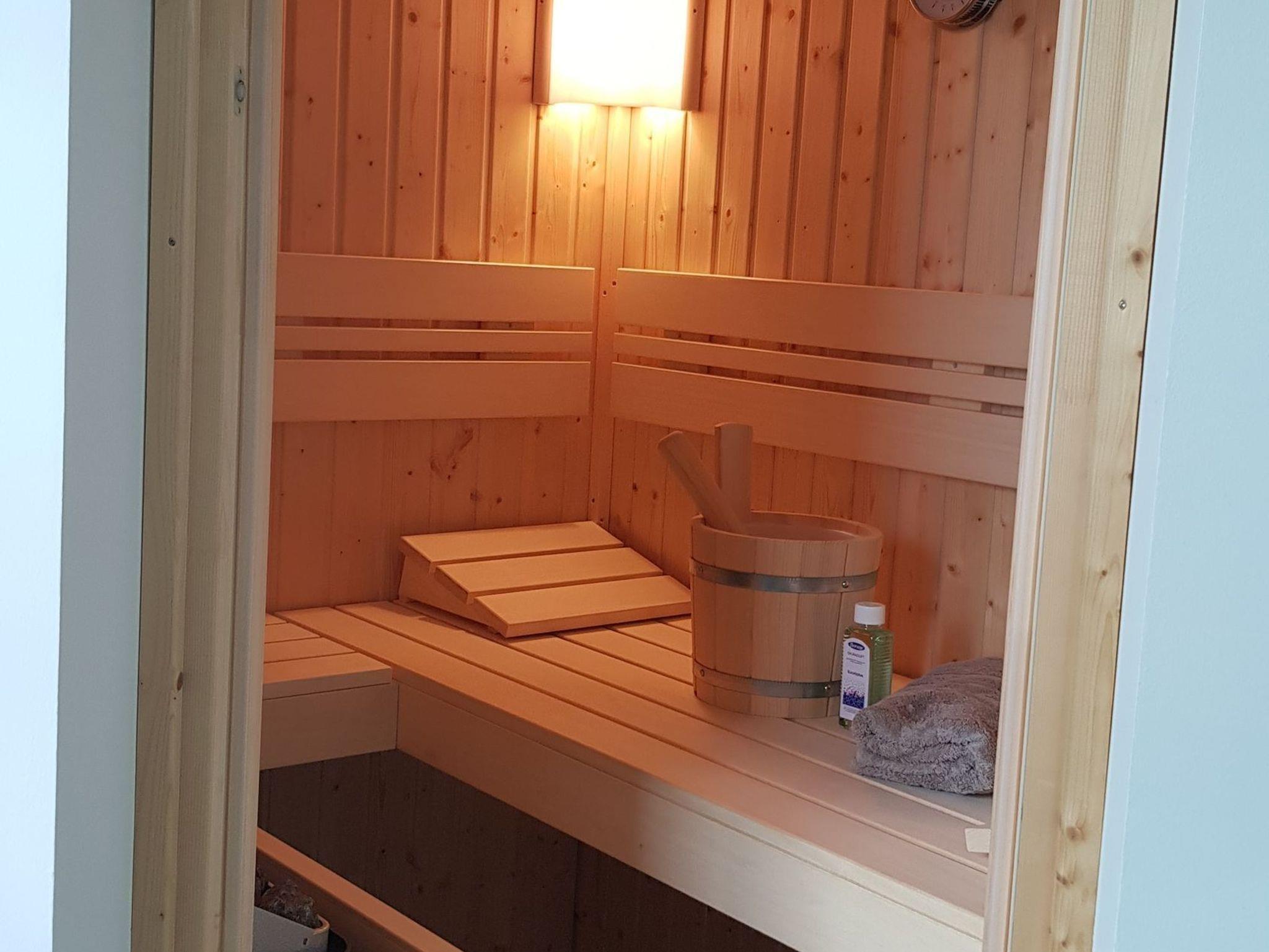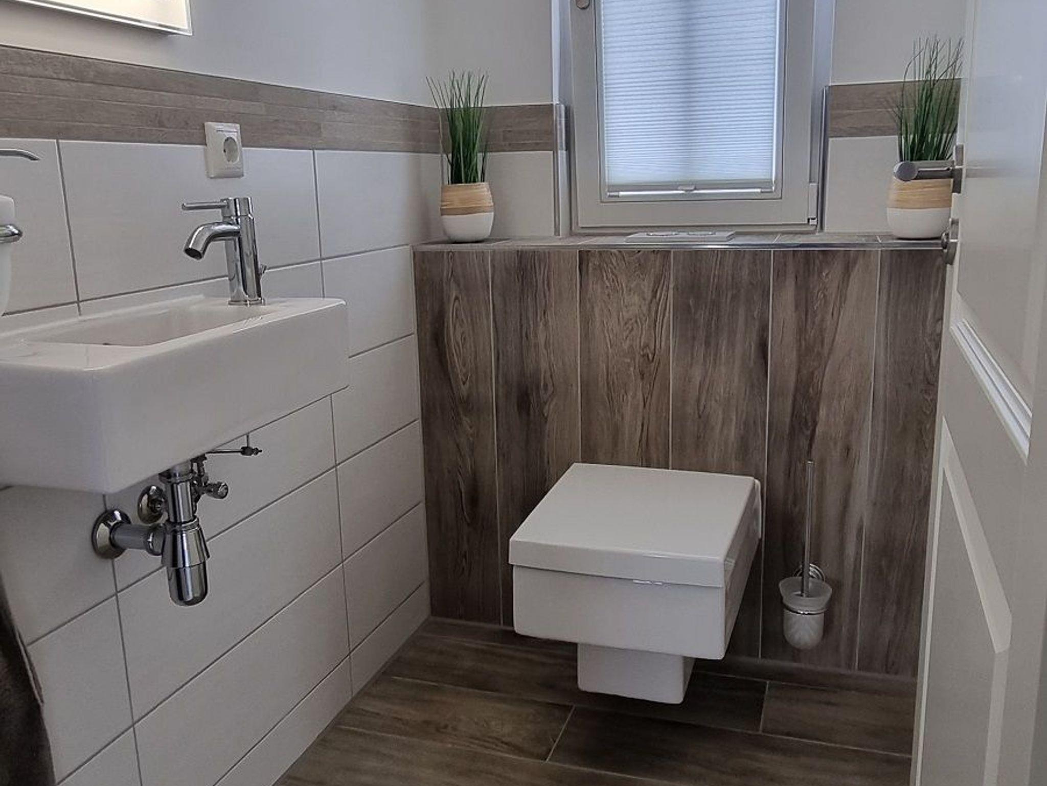 Die moderne Küchenzeile ist voll ausgestattet. Im Erdgeschoss befindet sich des Weiteren das Wellnessbad mit Sauna und bodengleicher Dusche. Hier können Sie von Ihrem Alltag entfliehen. Das Gäste-WC und der Hauswirtschaftsraum mit Waschmaschine[nbsp] runden das Erdgeschoss ab.