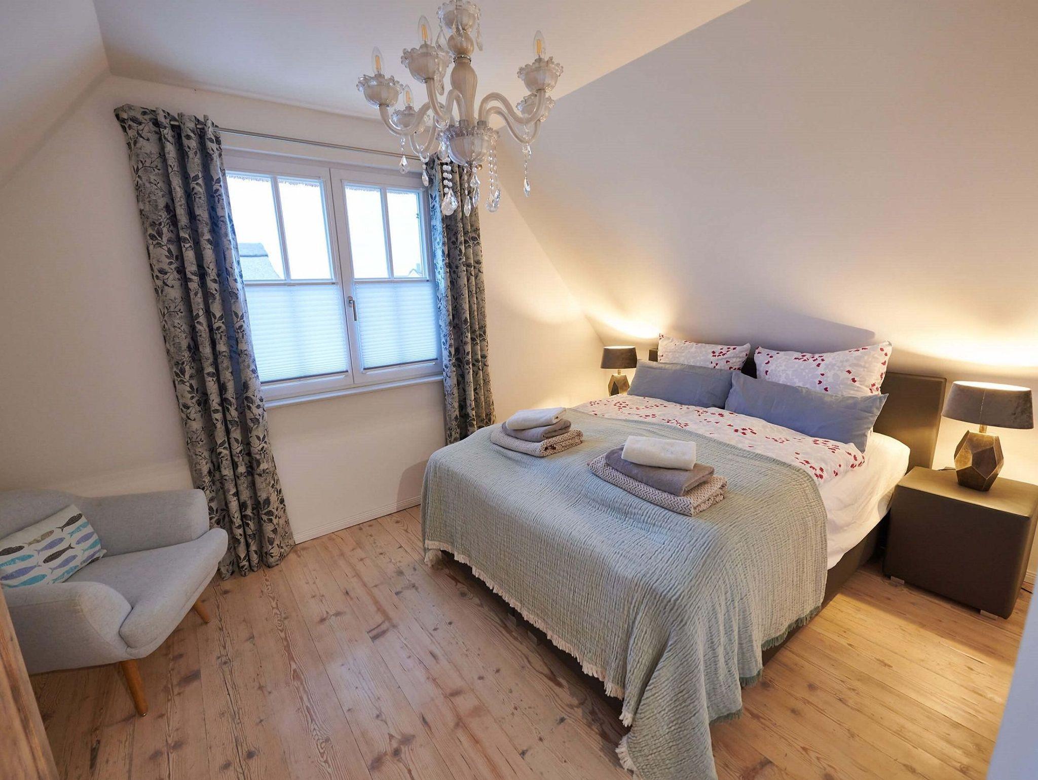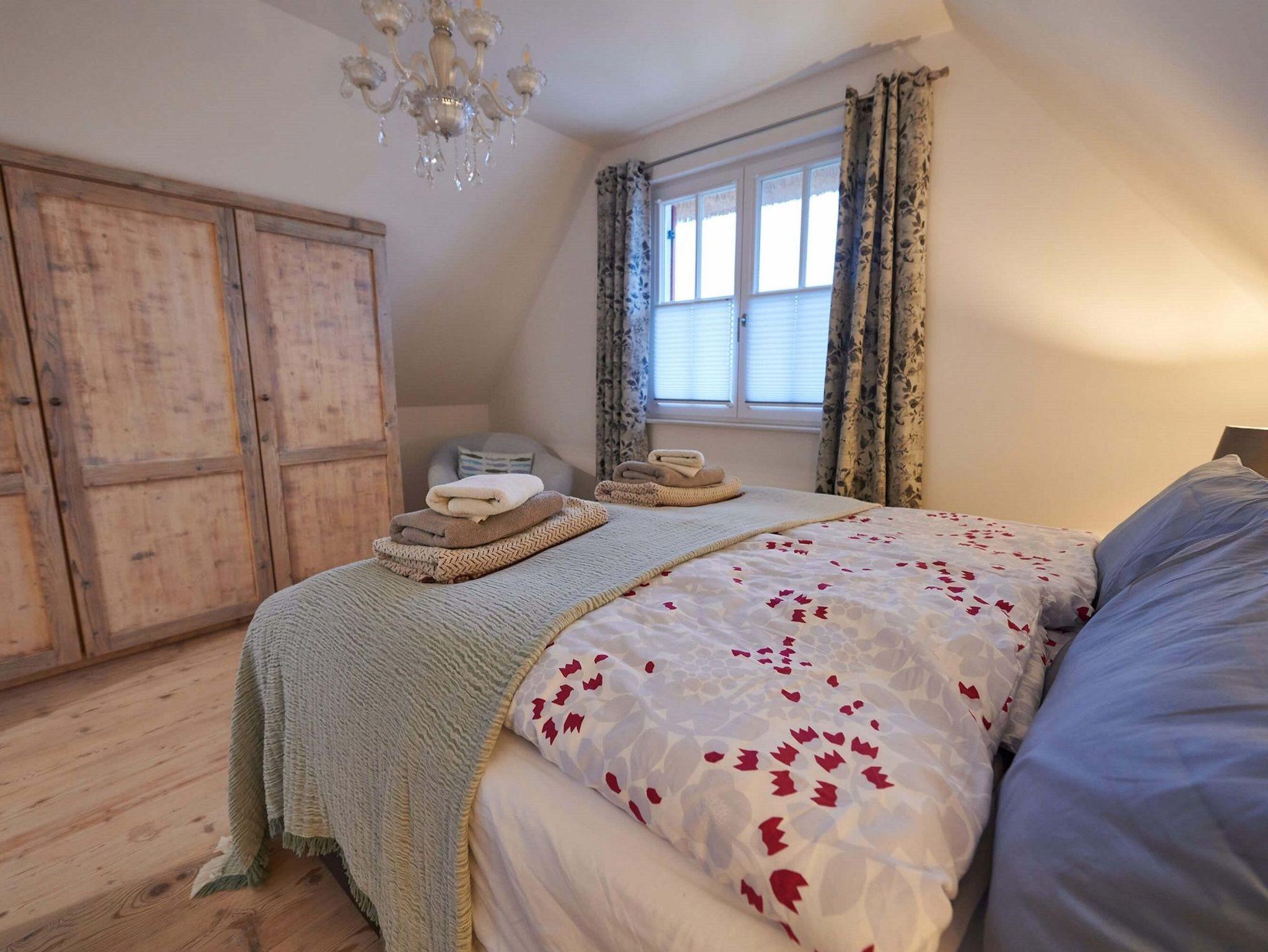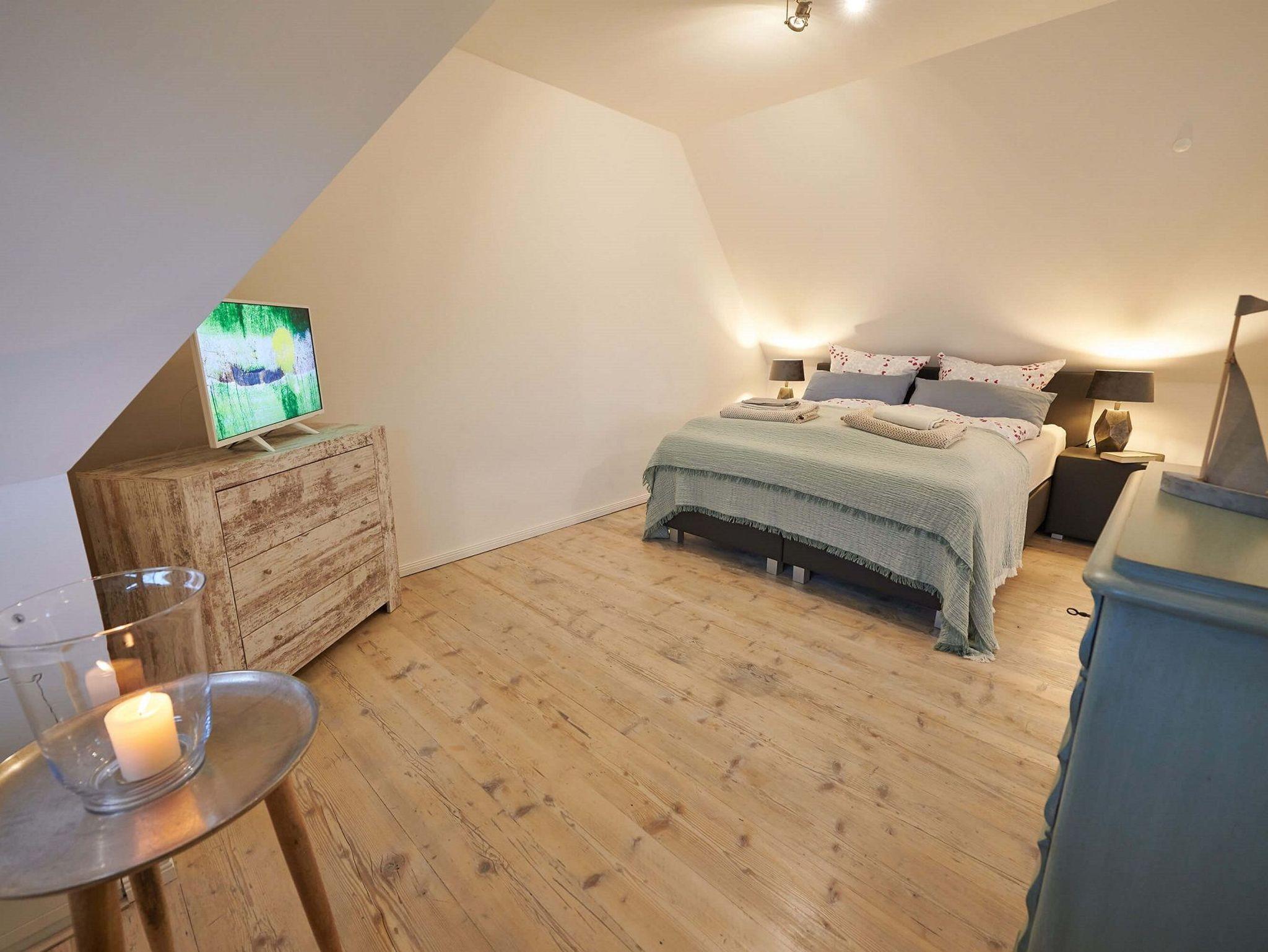 Im oberen Bereich stehen Ihnen zwei Schlafzimmer mit je einem Boxspringbett und Kommoden zur Verfügung.