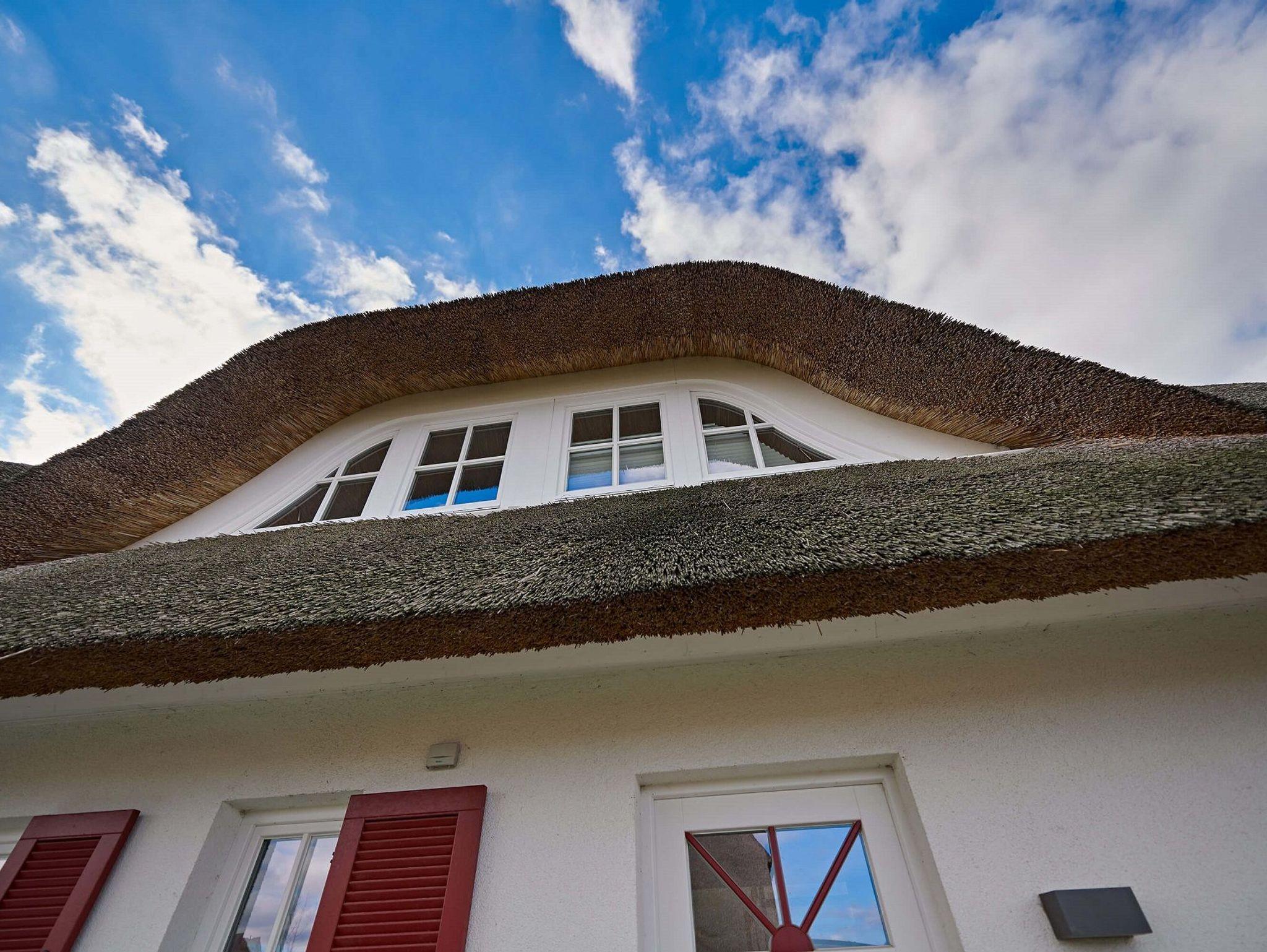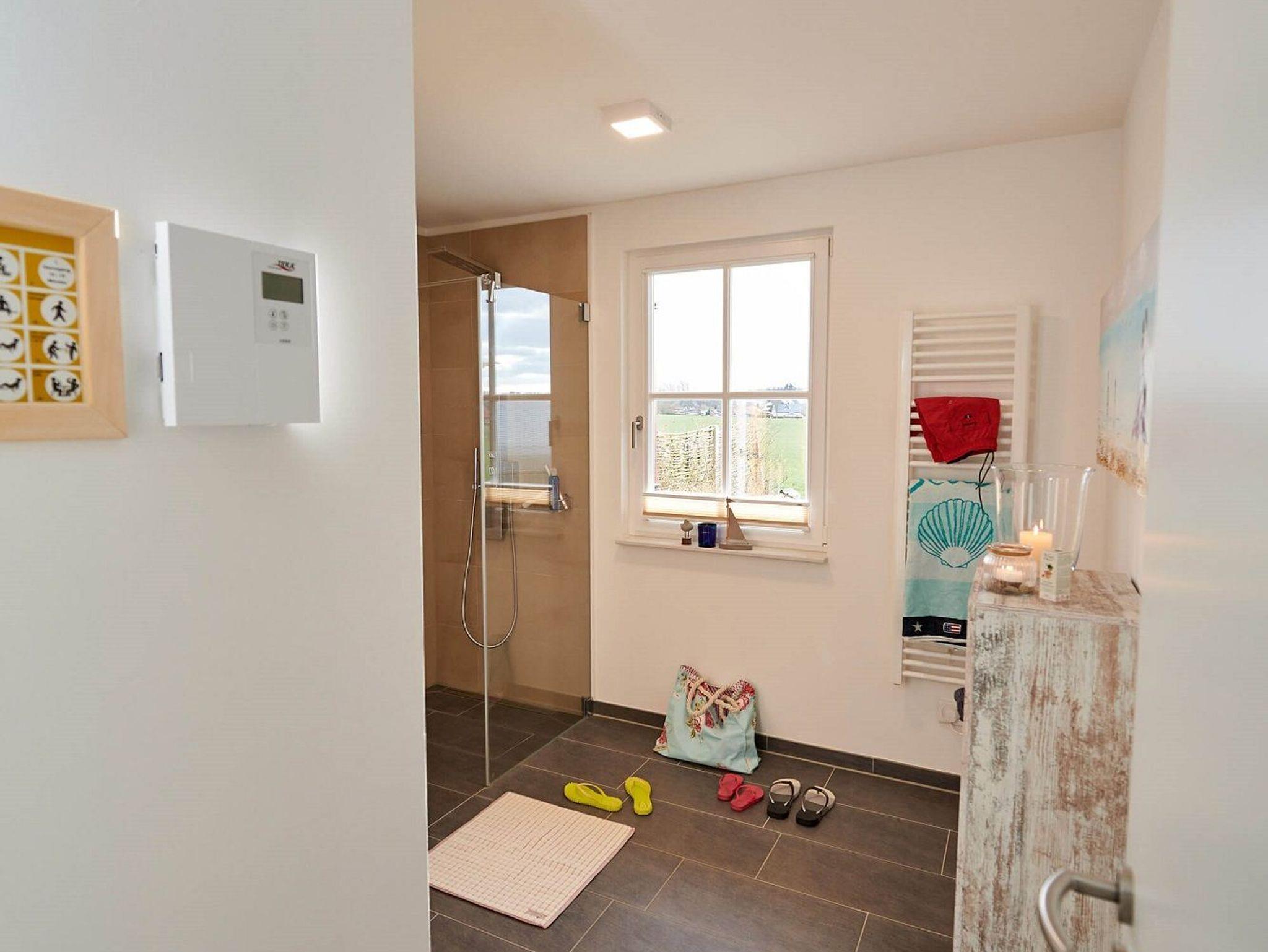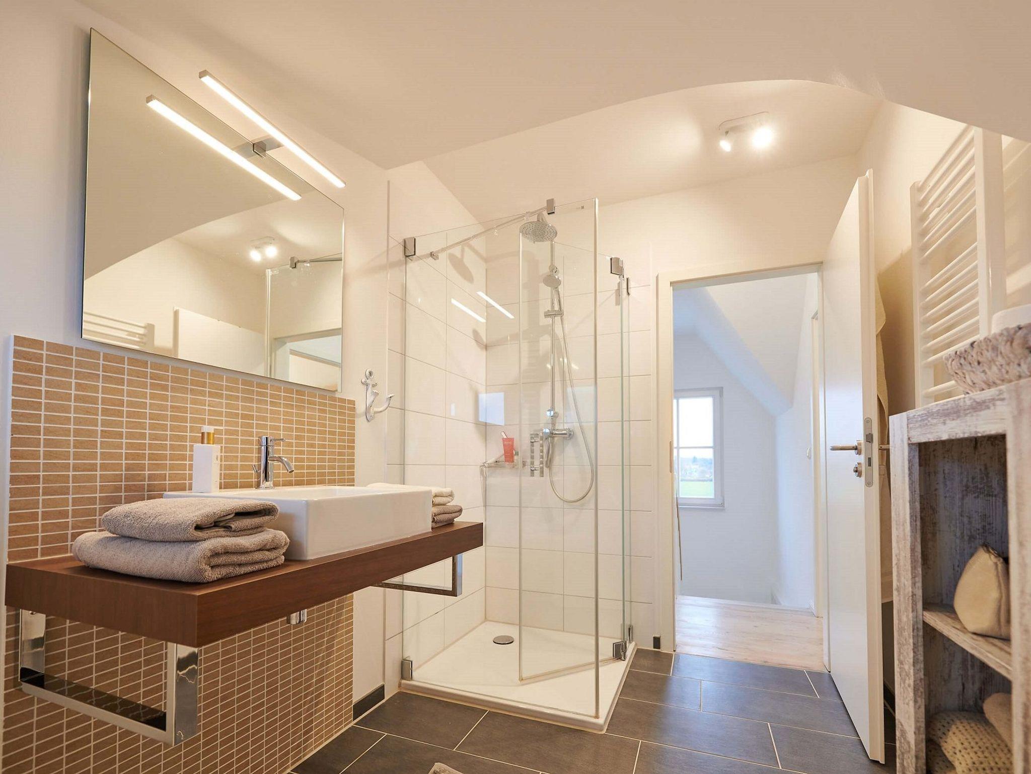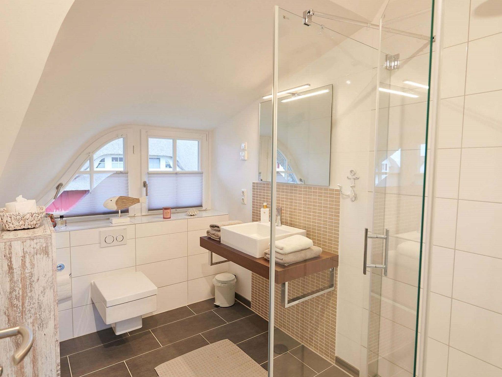 Das Duschbad mit Echtglasduschabtrennung, Waschbecken und WC ist in der typischen Fledermausgaube des Reethauses eingerichtet.