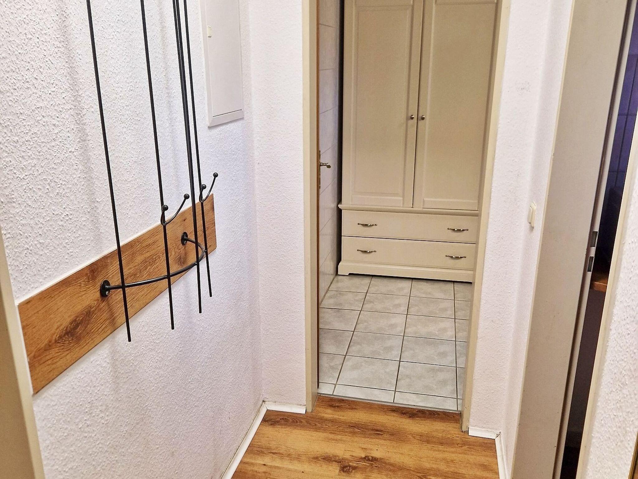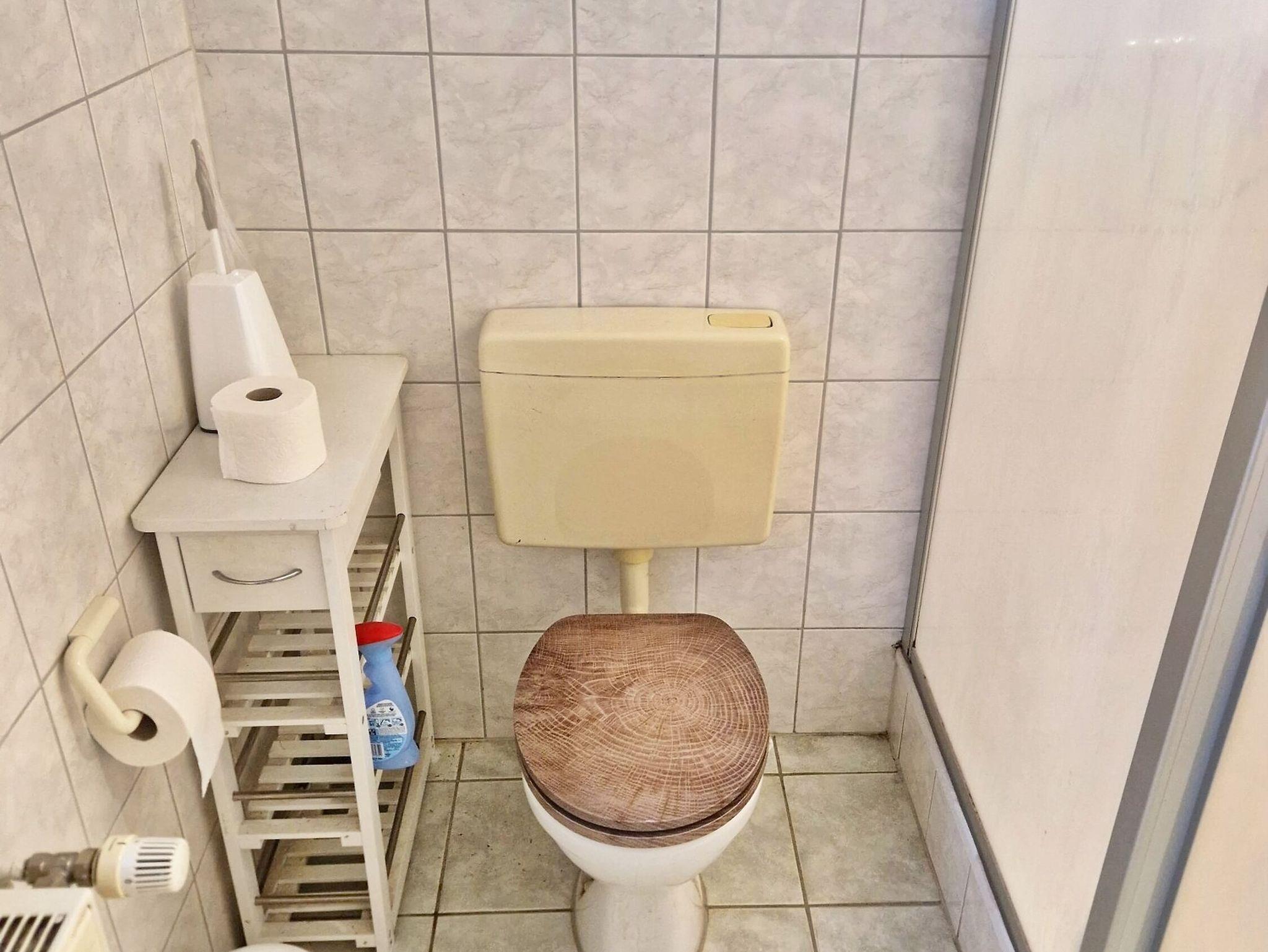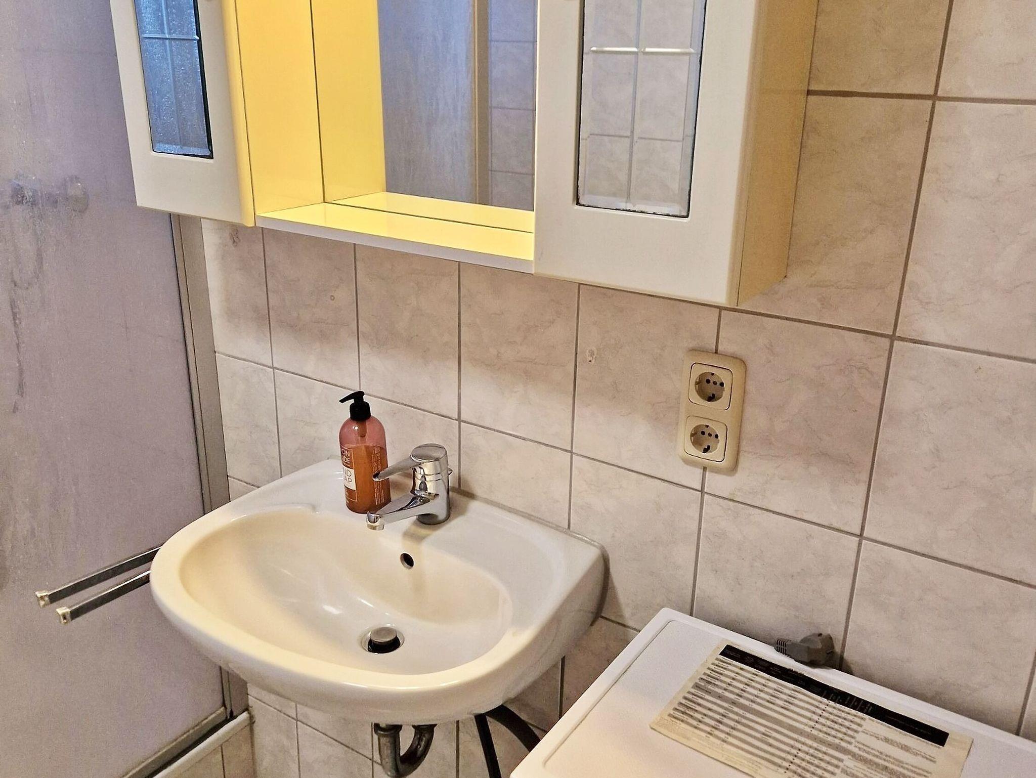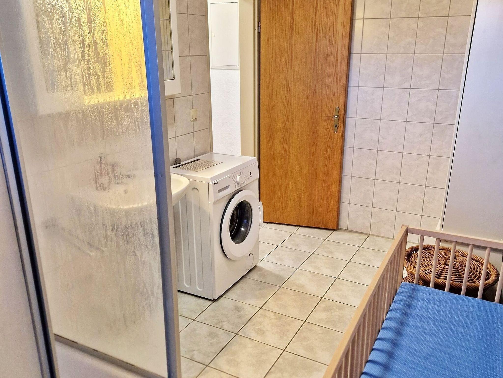 - Duschbad mit Dusche, WC, Spiegel, Föhn, Waschmaschine, Wäscheständer, Bügelbrett, Bügeleisen