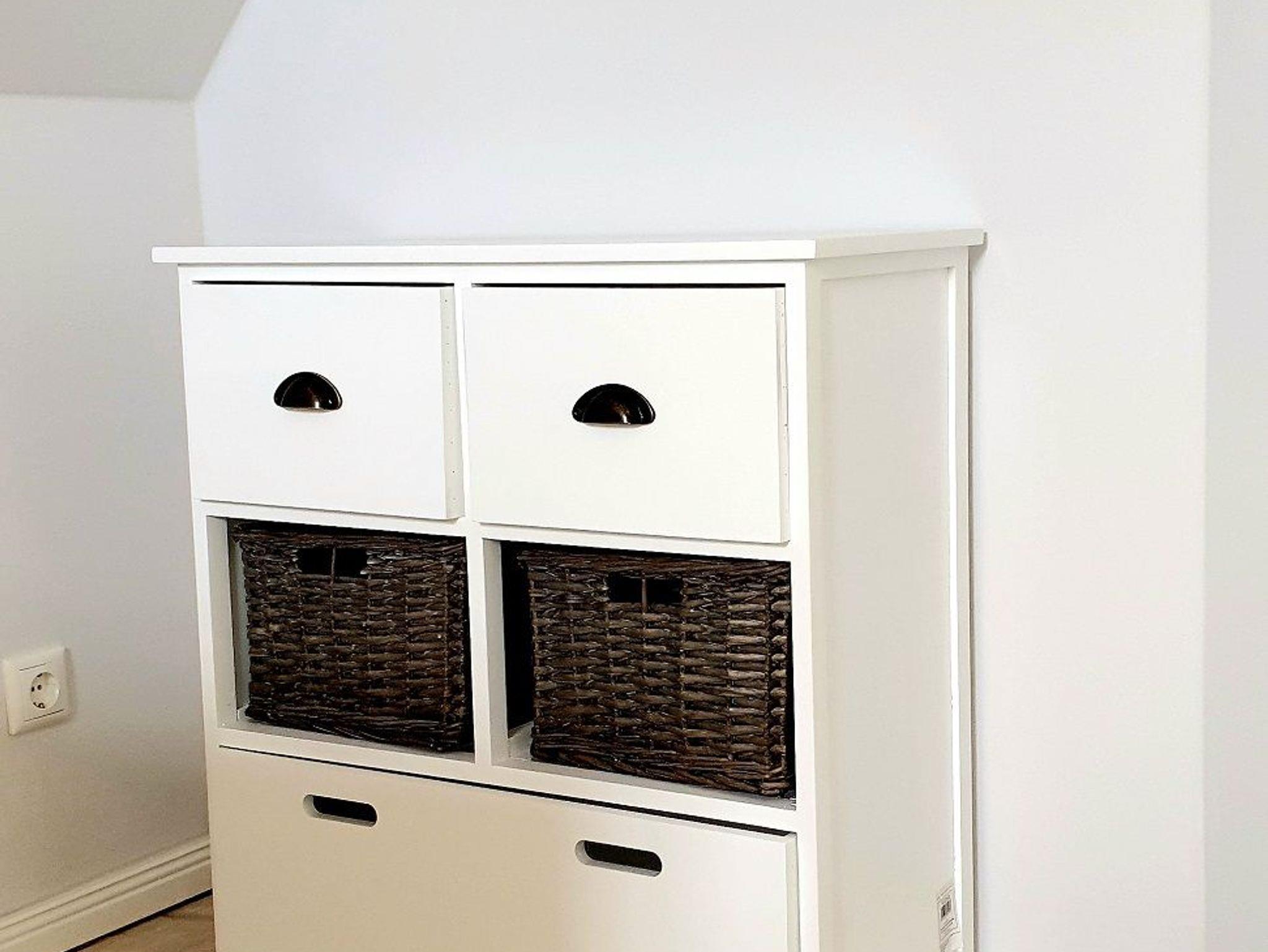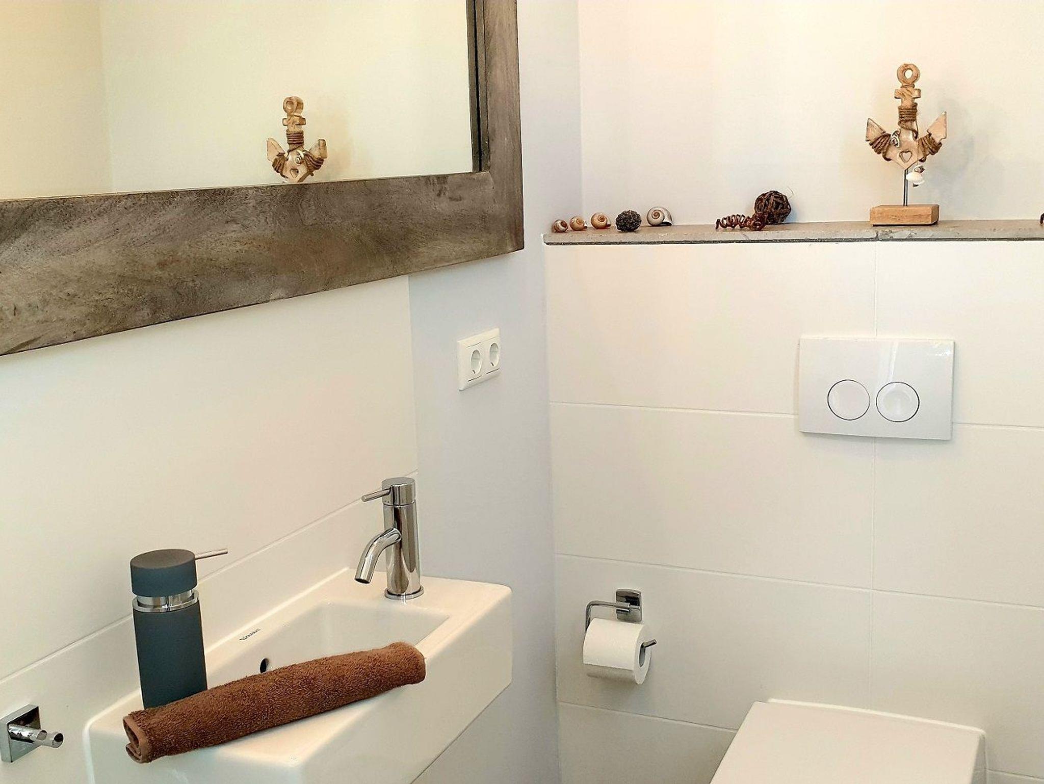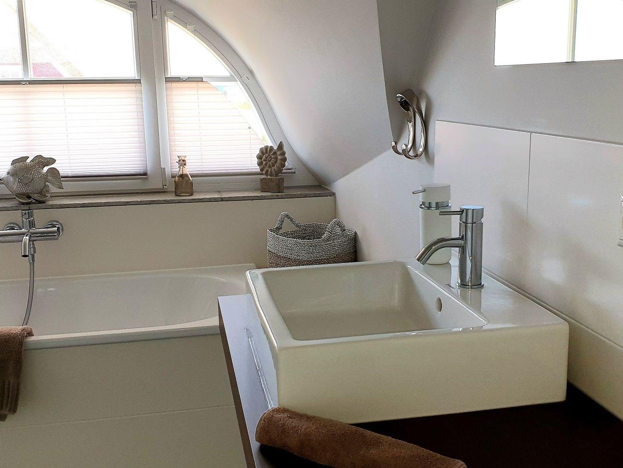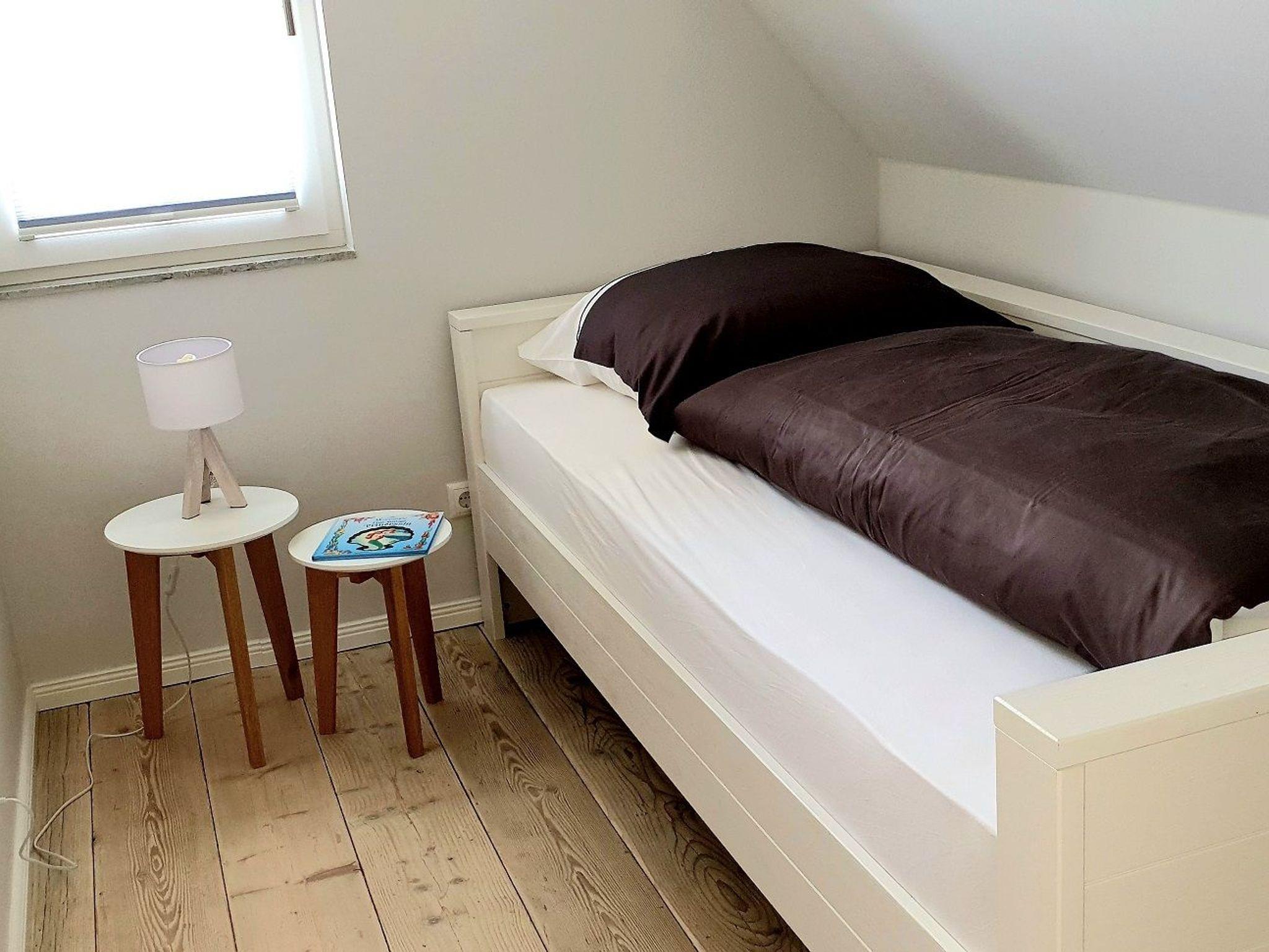 Im oberen Bereich stehen Ihnen ein Schlafzimmer mit einem Boxspringbett und zwei weitere Schlafzimmer mit je einem Einzelbett zur Verfügung. In allen Schlafzimmern ist ein TV vorhanden. Das Vollbad mit Echtglasduschabtrennung, Waschbecken und WC ist in der typischen Fledermausgaube des Reethauses eingerichtet. Im gesamten Haus ist eine Fußbodenheizung verlegt. Zum Sichtschutz sind Pliesses, Vorhänge und Fensterklappläden angebracht. Ein Waschmaschine und Trockner und diverse Putzutensilien sowie Bügelbrett und Bügeleisen sind im HWR verstaut.