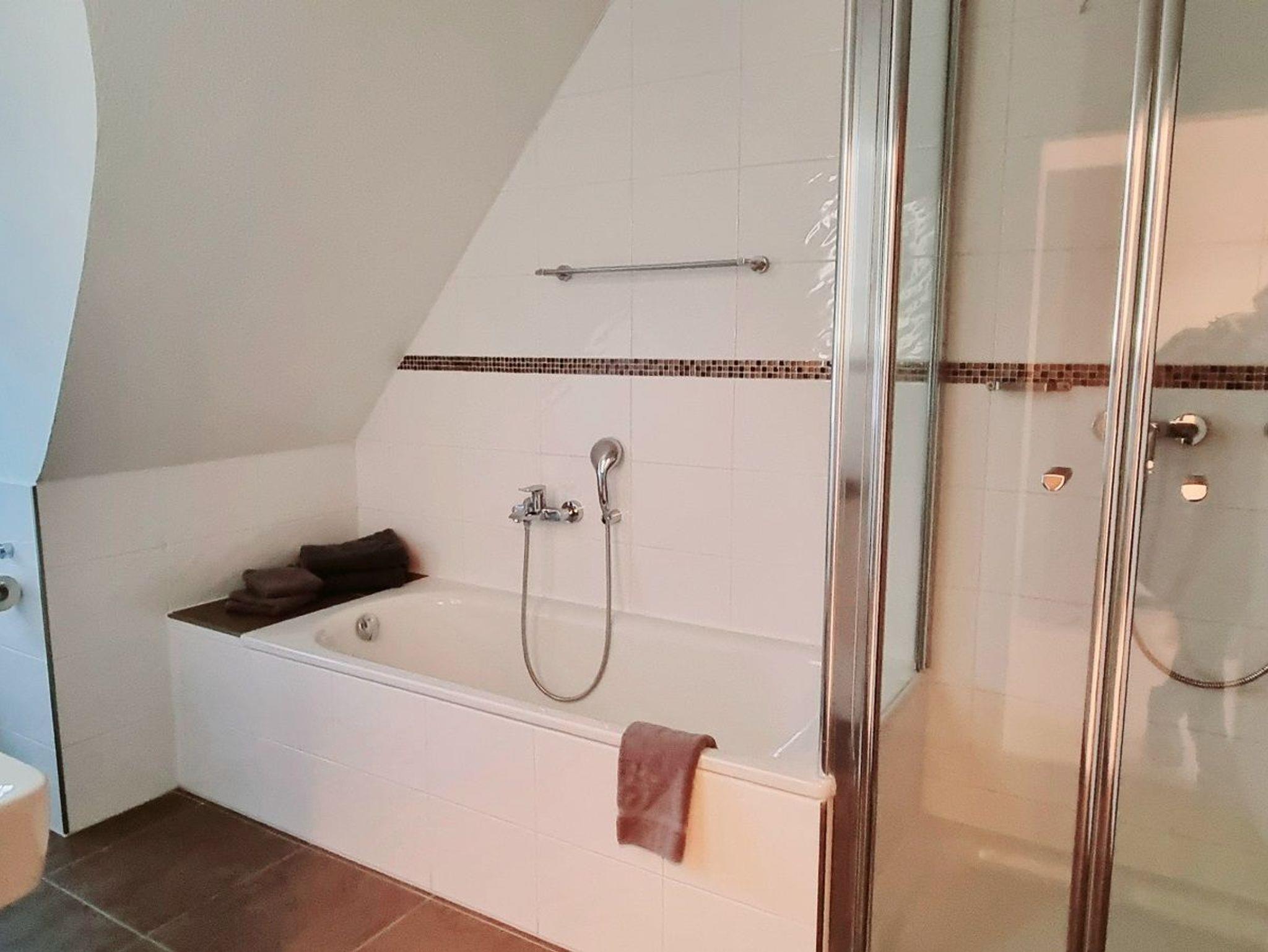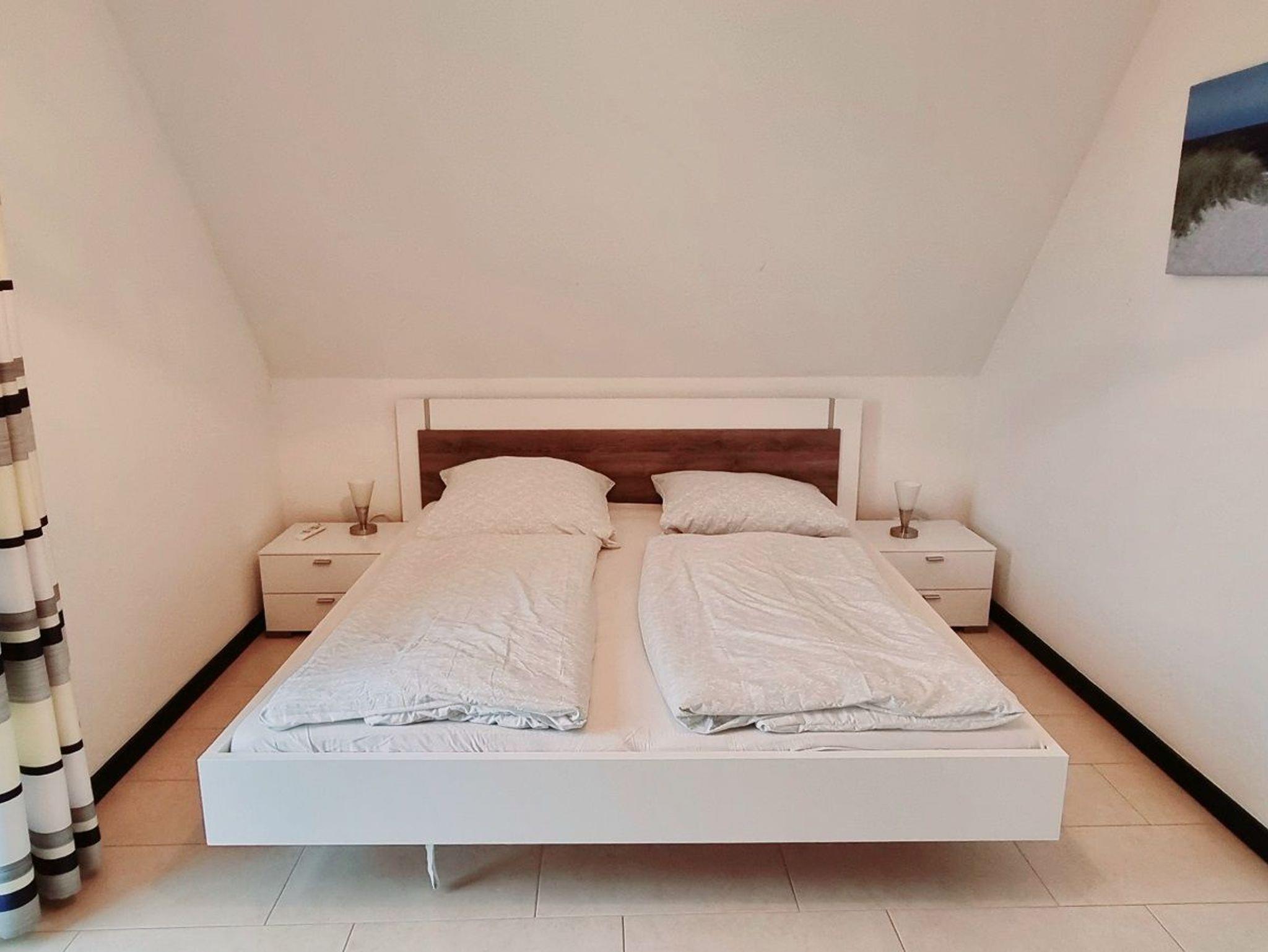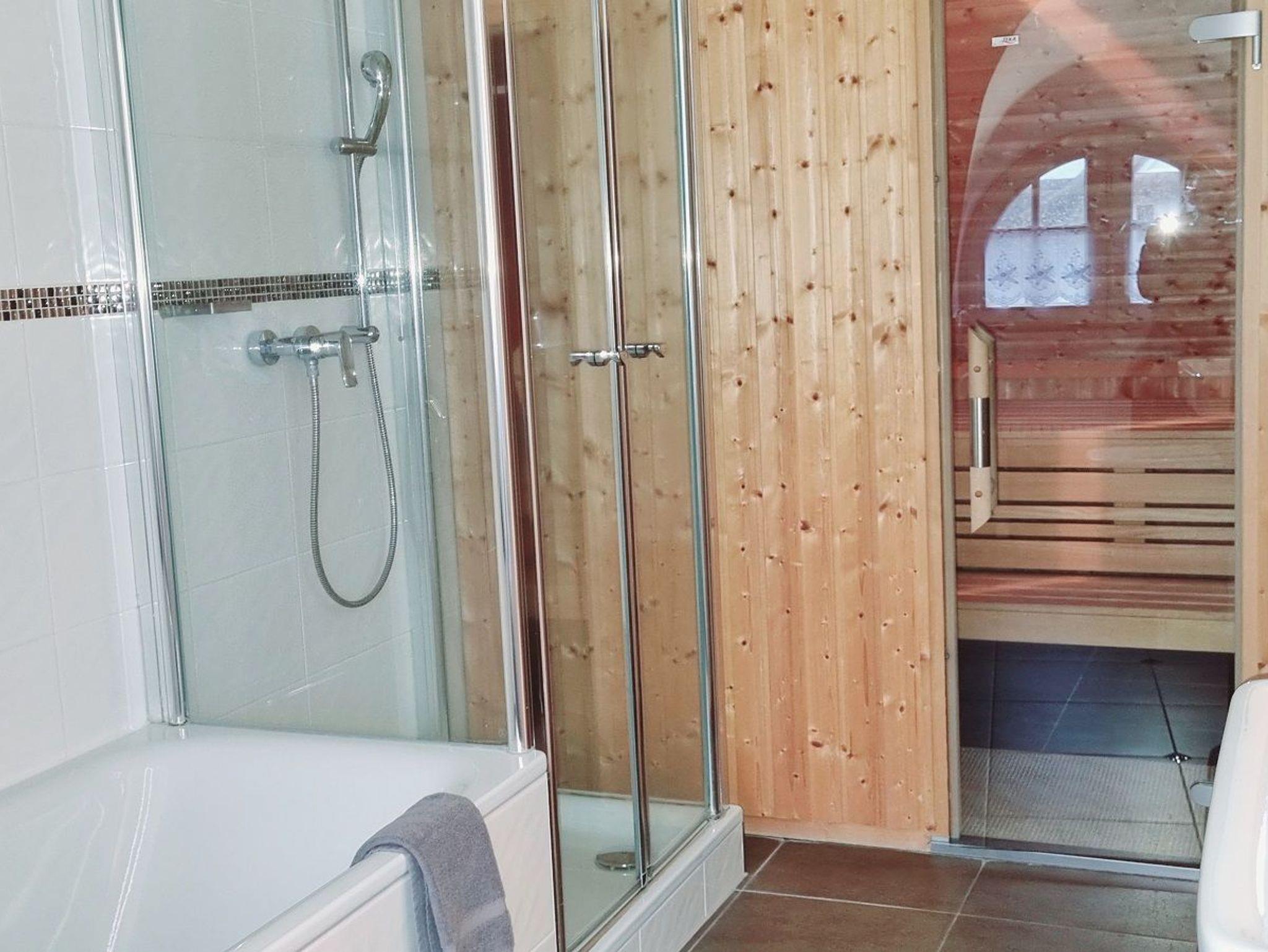 Im Obergeschoss befindet sich das Elternschlafzimmer mit Doppelbett und das Vollbad mit Badewanne, Dusche und der Sauna.