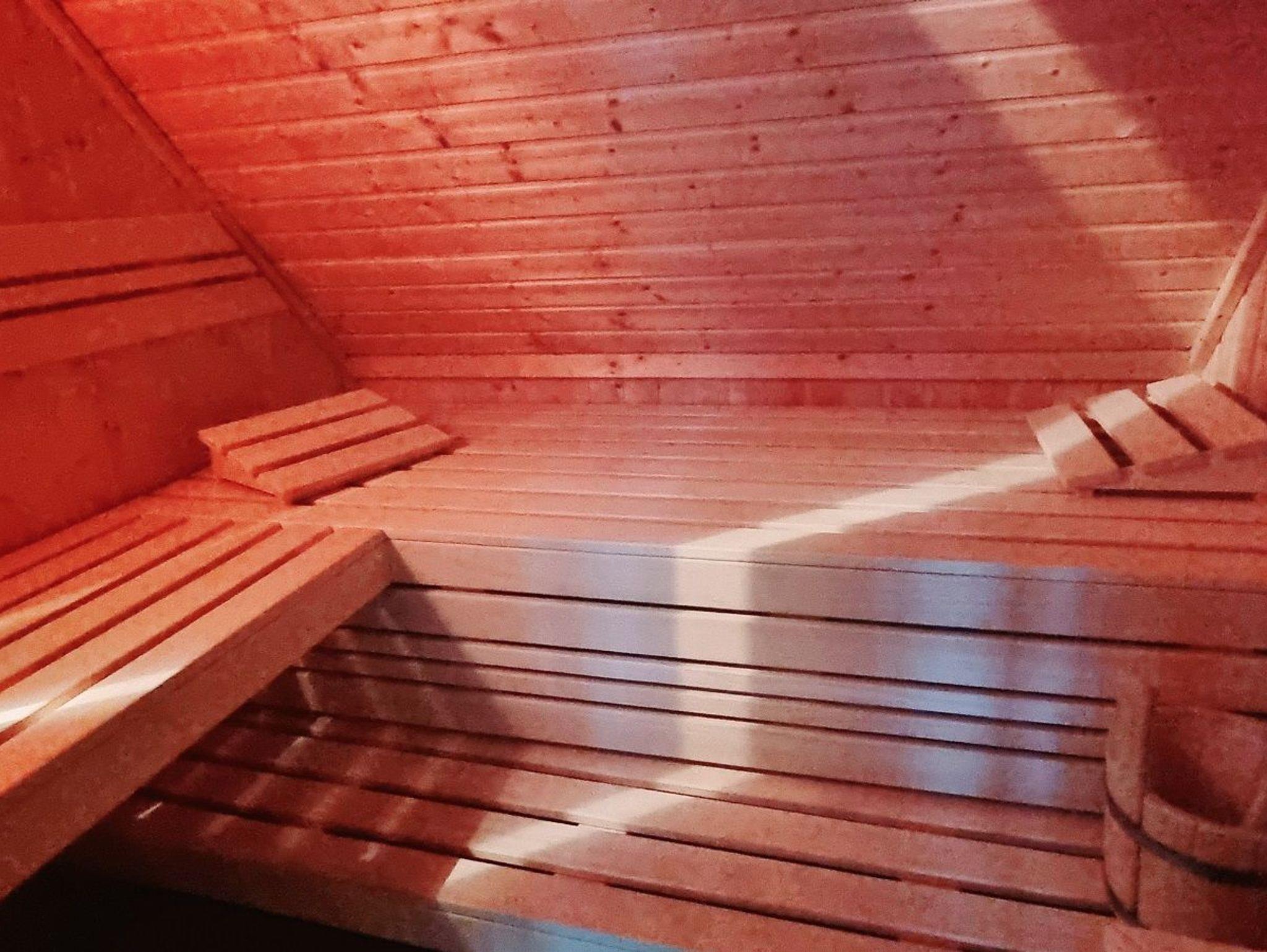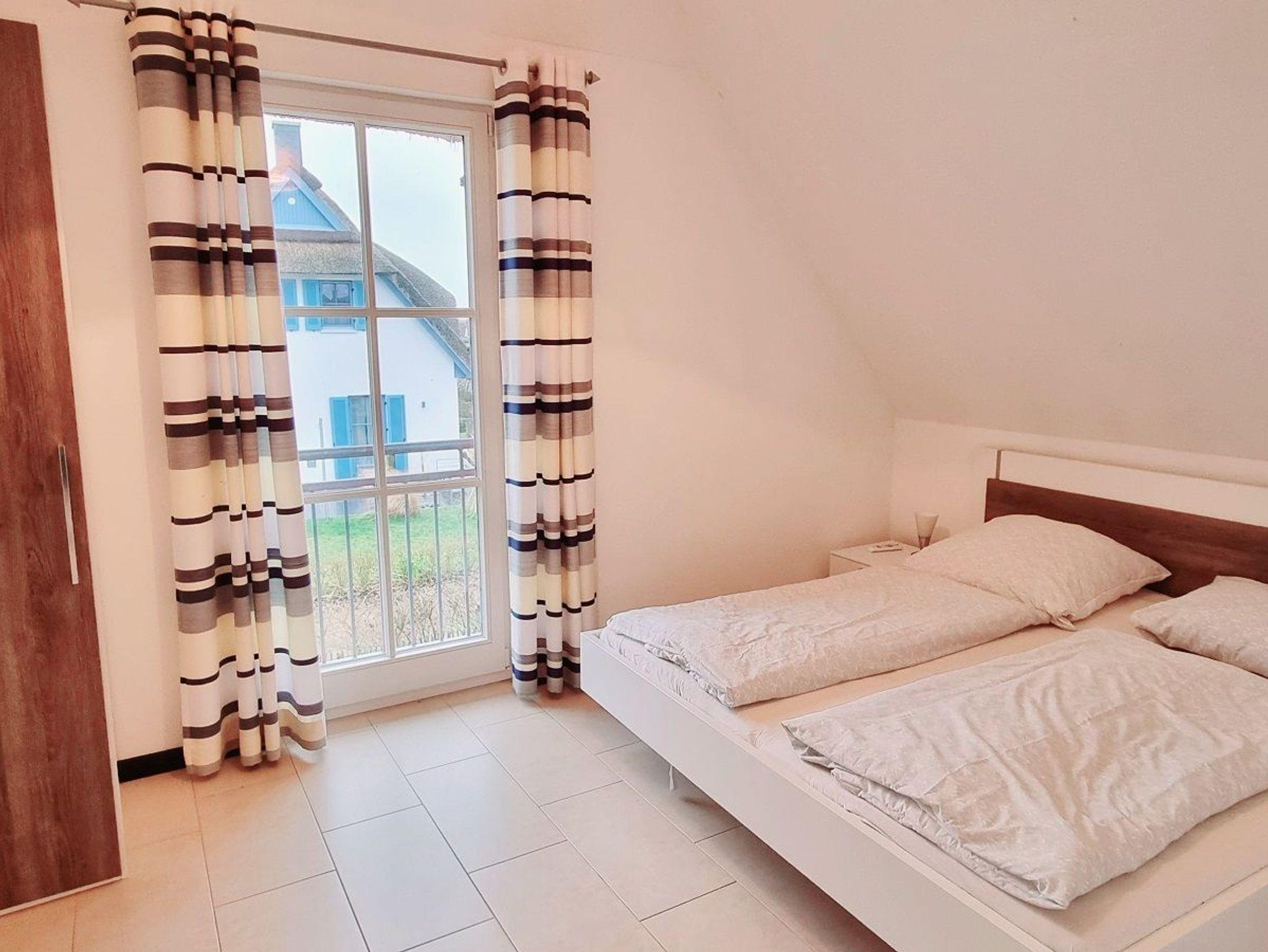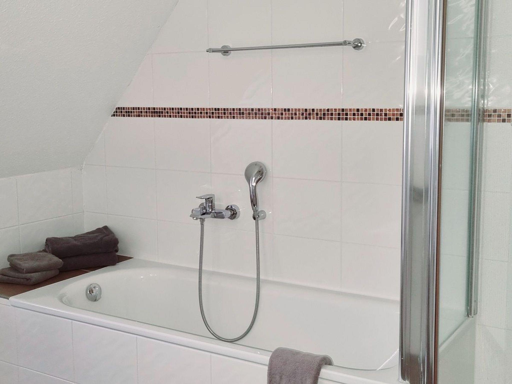 Im Obergeschoss befindet sich das Elternschlafzimmer mit Doppelbett und das Vollbad mit Badewanne, Dusche und der Sauna.