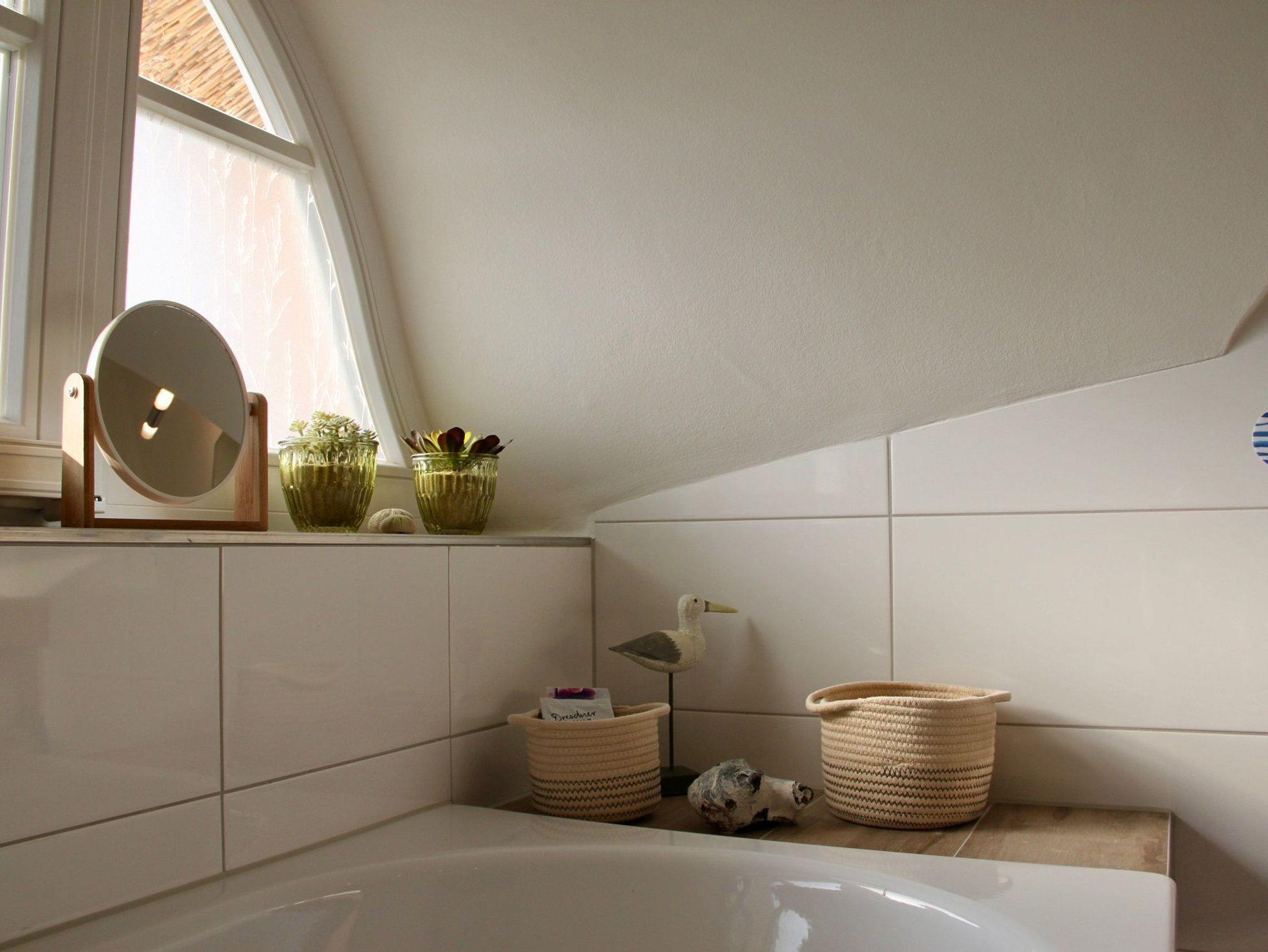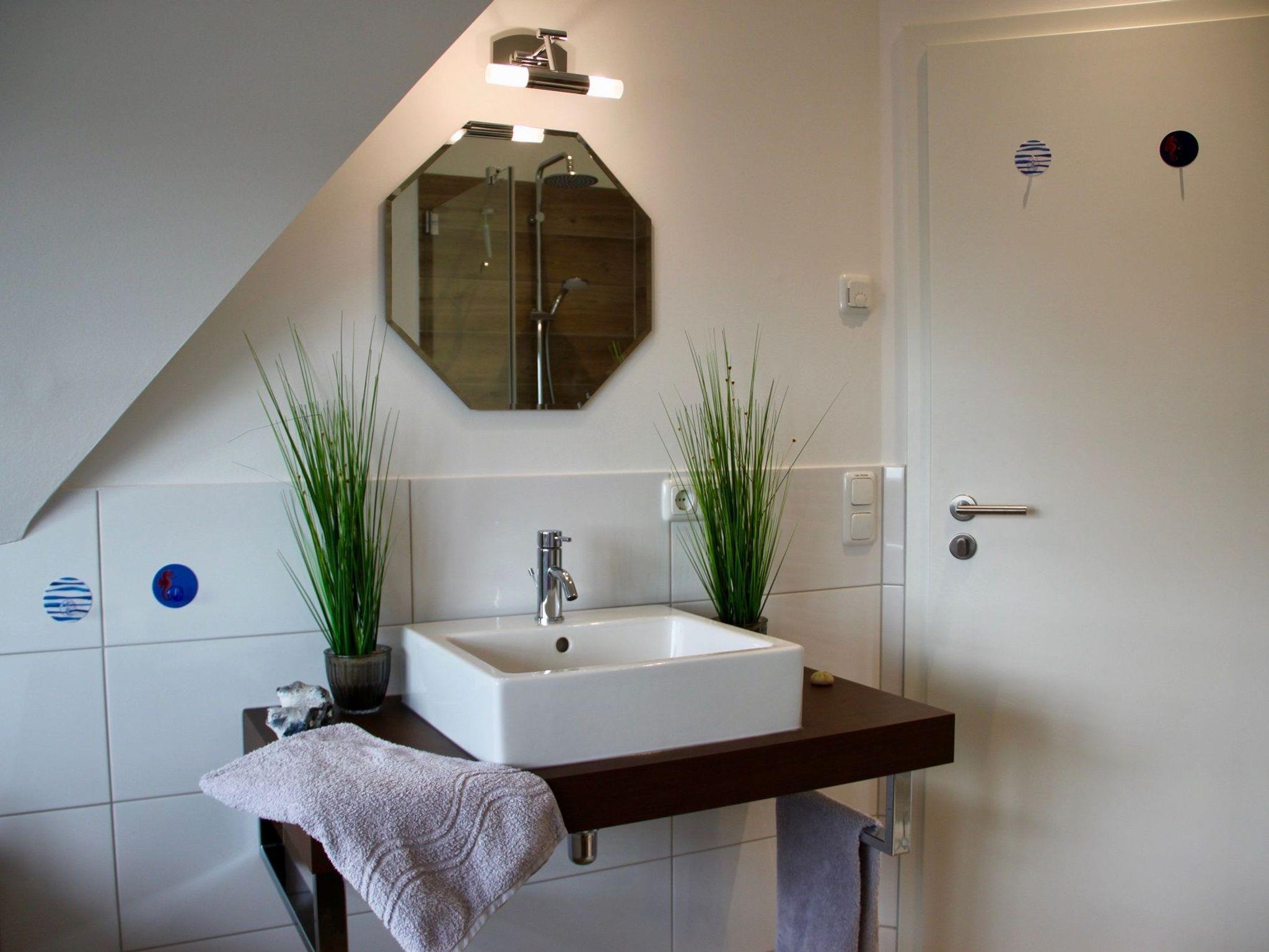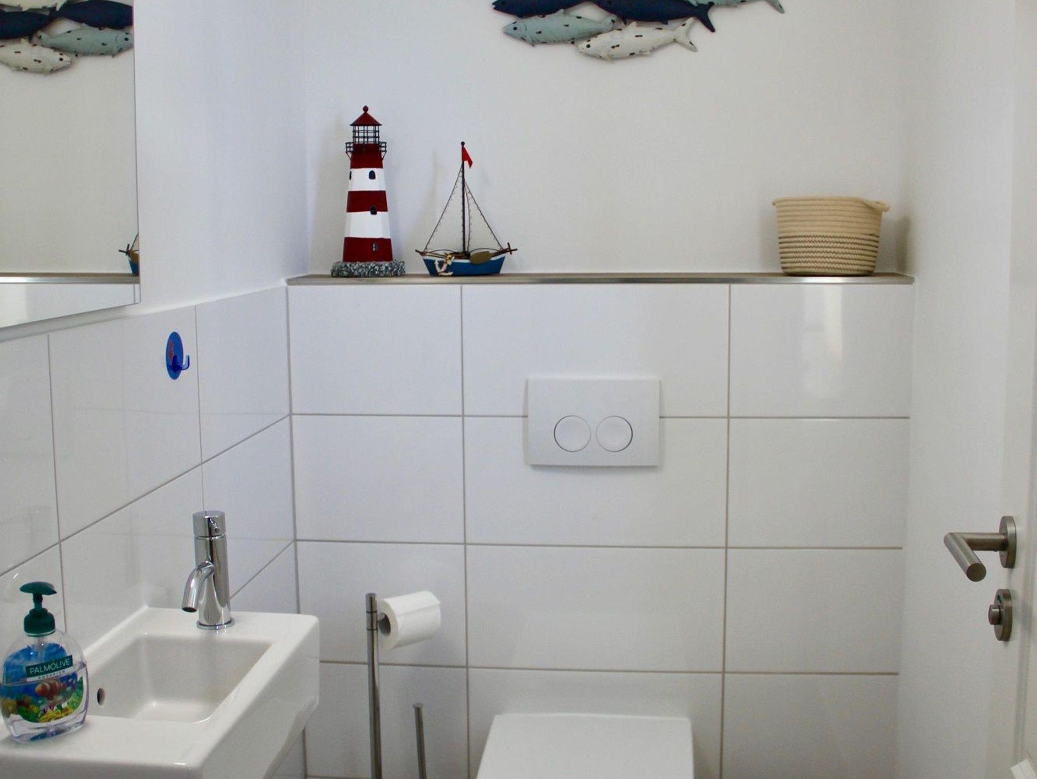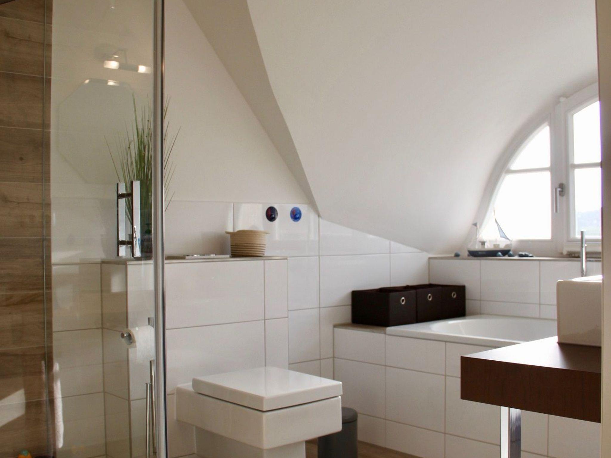 Das moderne Bad im Obergeschoss bietet Ihnen neben Waschtisch und WC eine Dusche und eine Badewanne. Ein Gäste-WC befindet sich im Erdgeschoss.