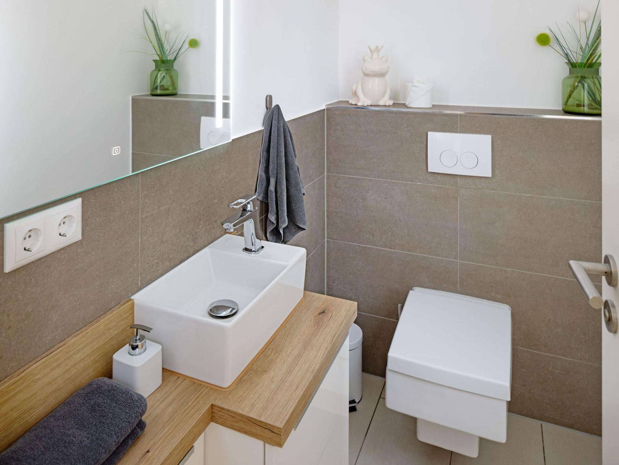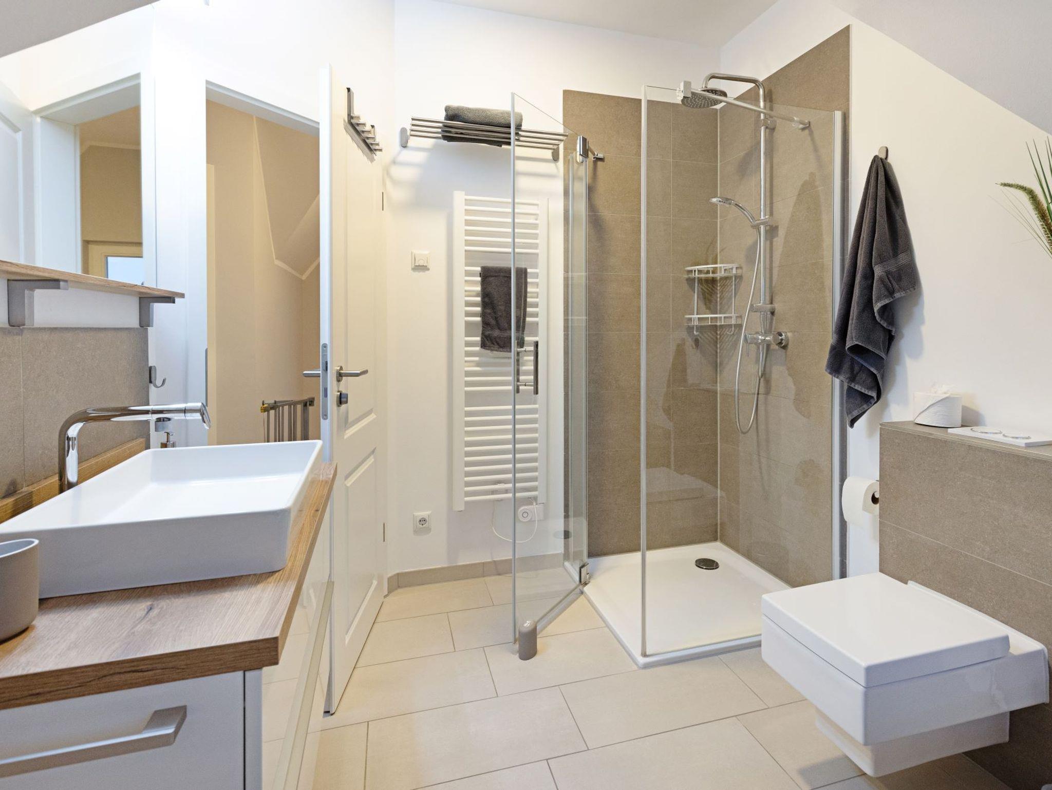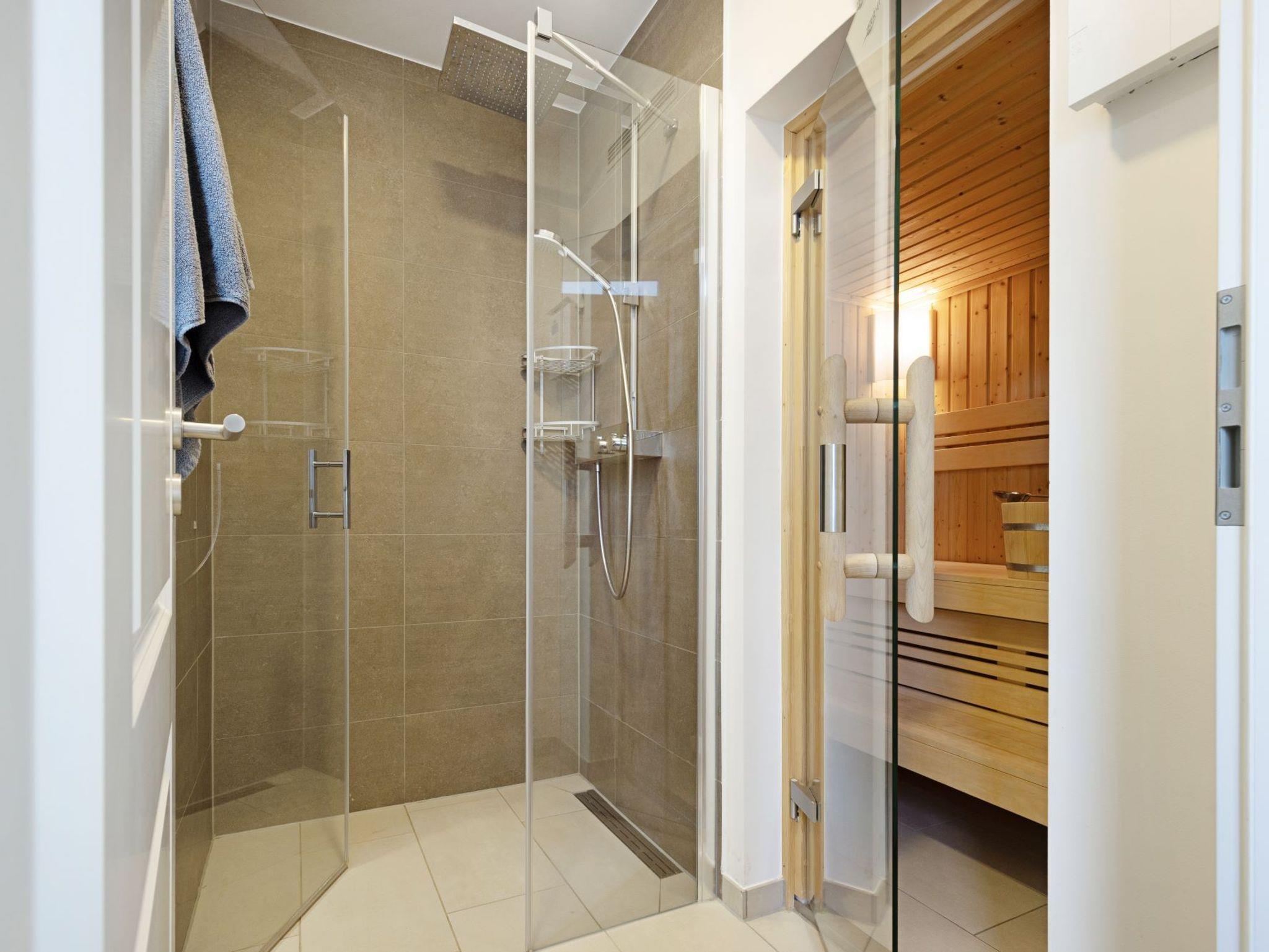 Die bodengleiche Wellnessdusche ist im Saunabereich integriert. Ein Gäste-WC und der HWR mit Waschmaschine, Trockner und Haushaltsartikeln runden das Angebot im Erdgeschoss ab.