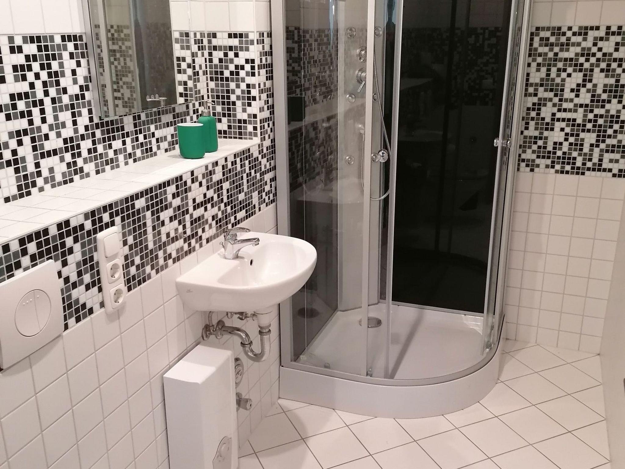- Duschbad mit Dusche, WC, Spiegel und Föhn