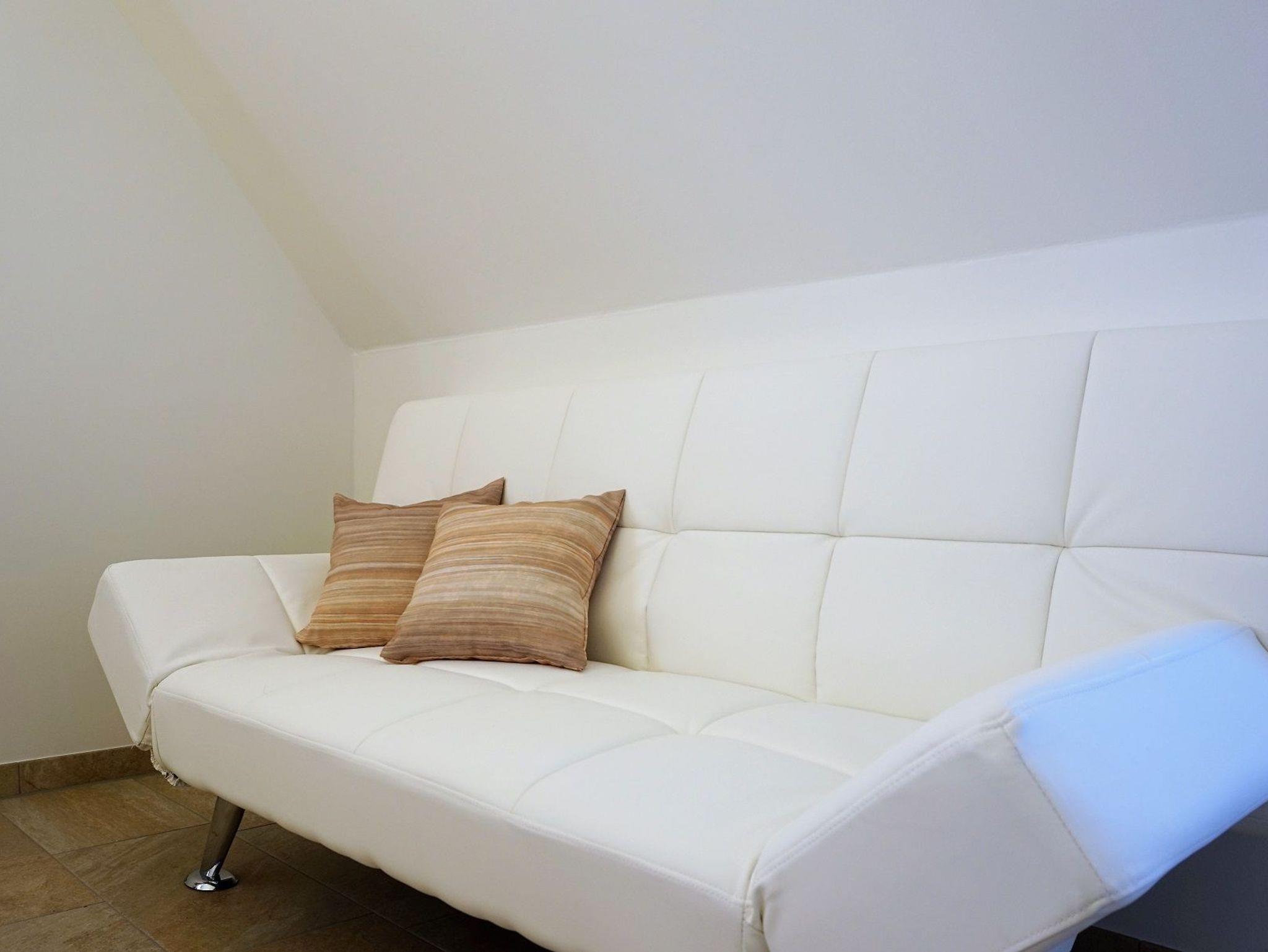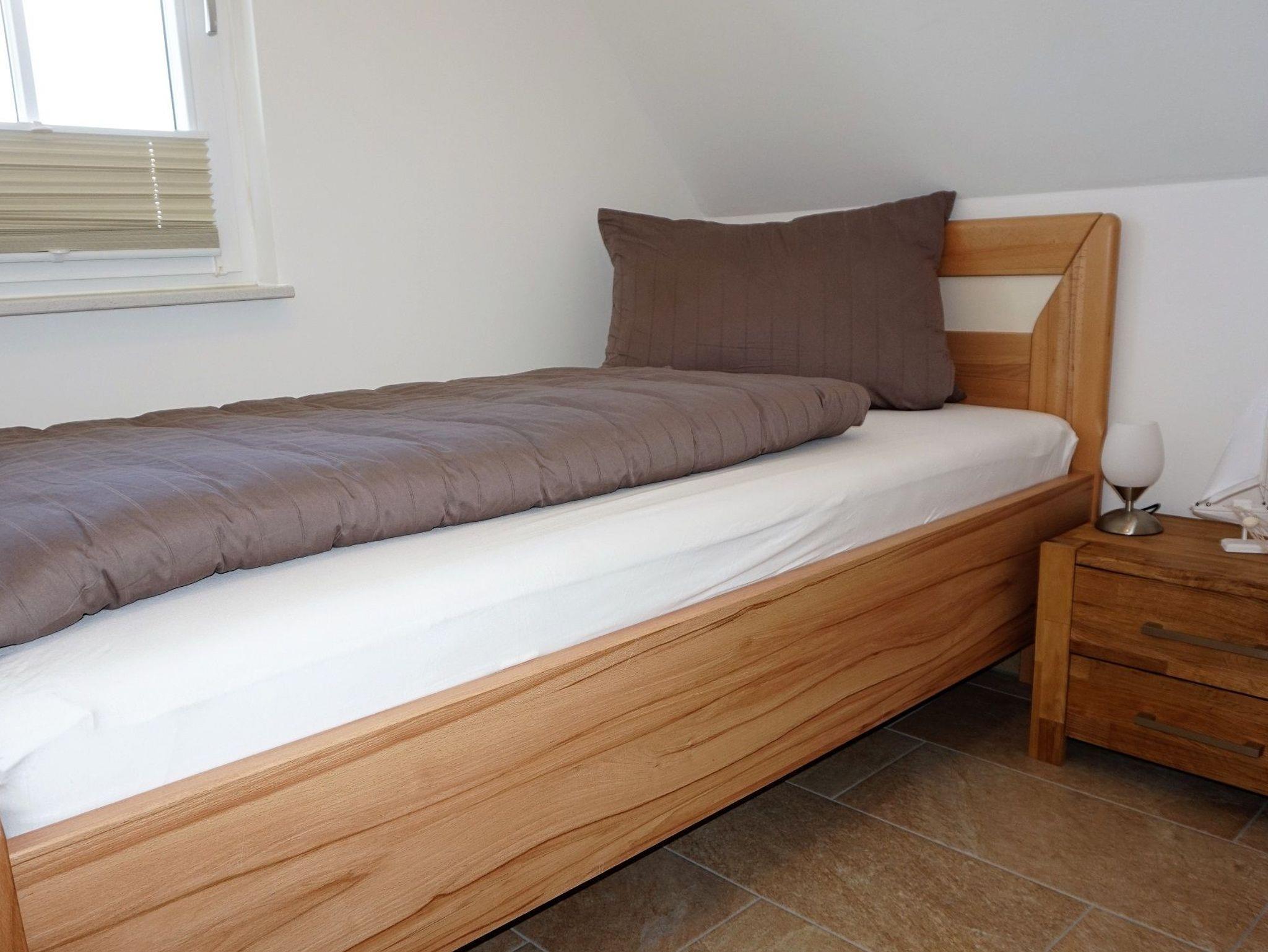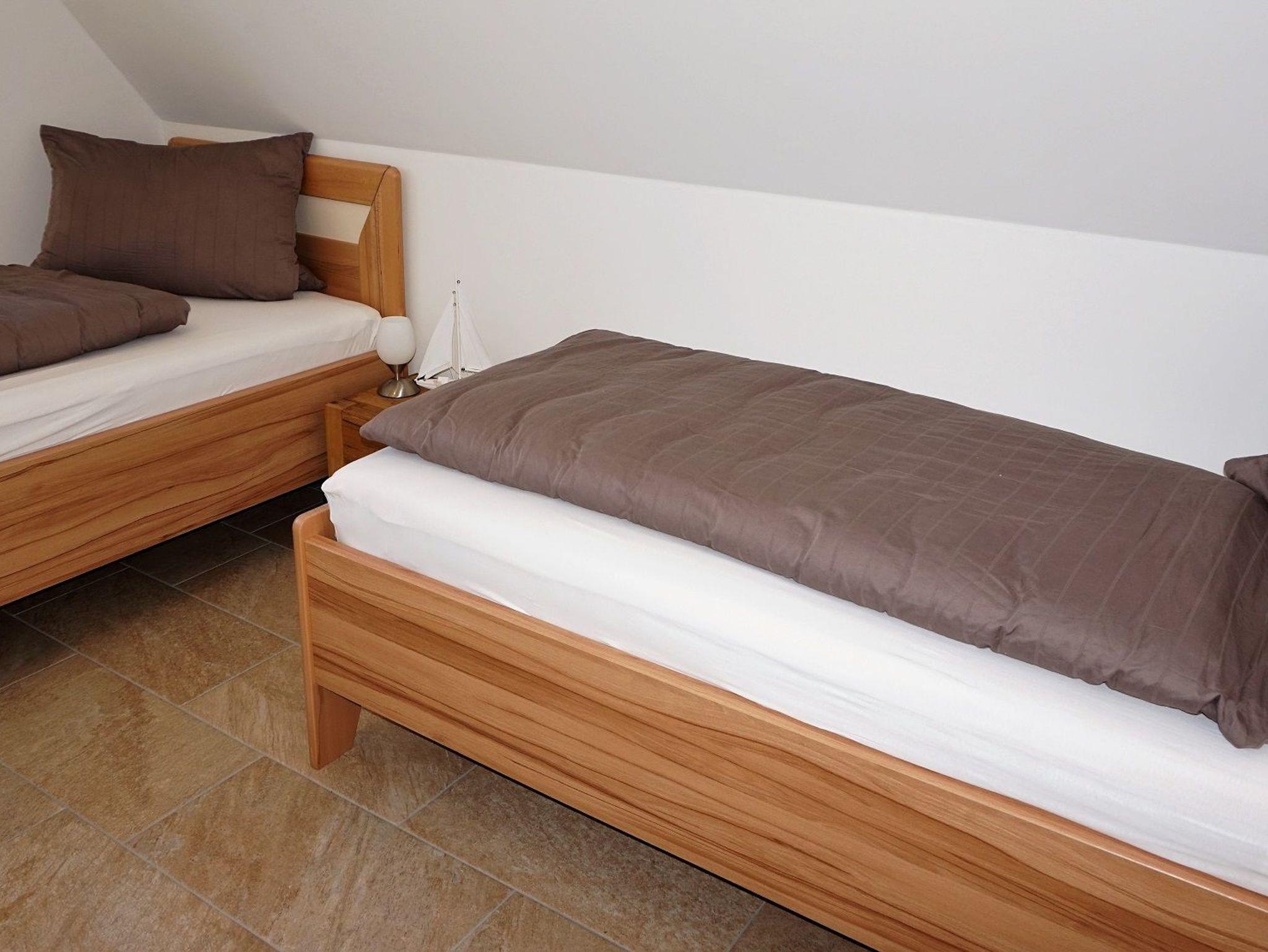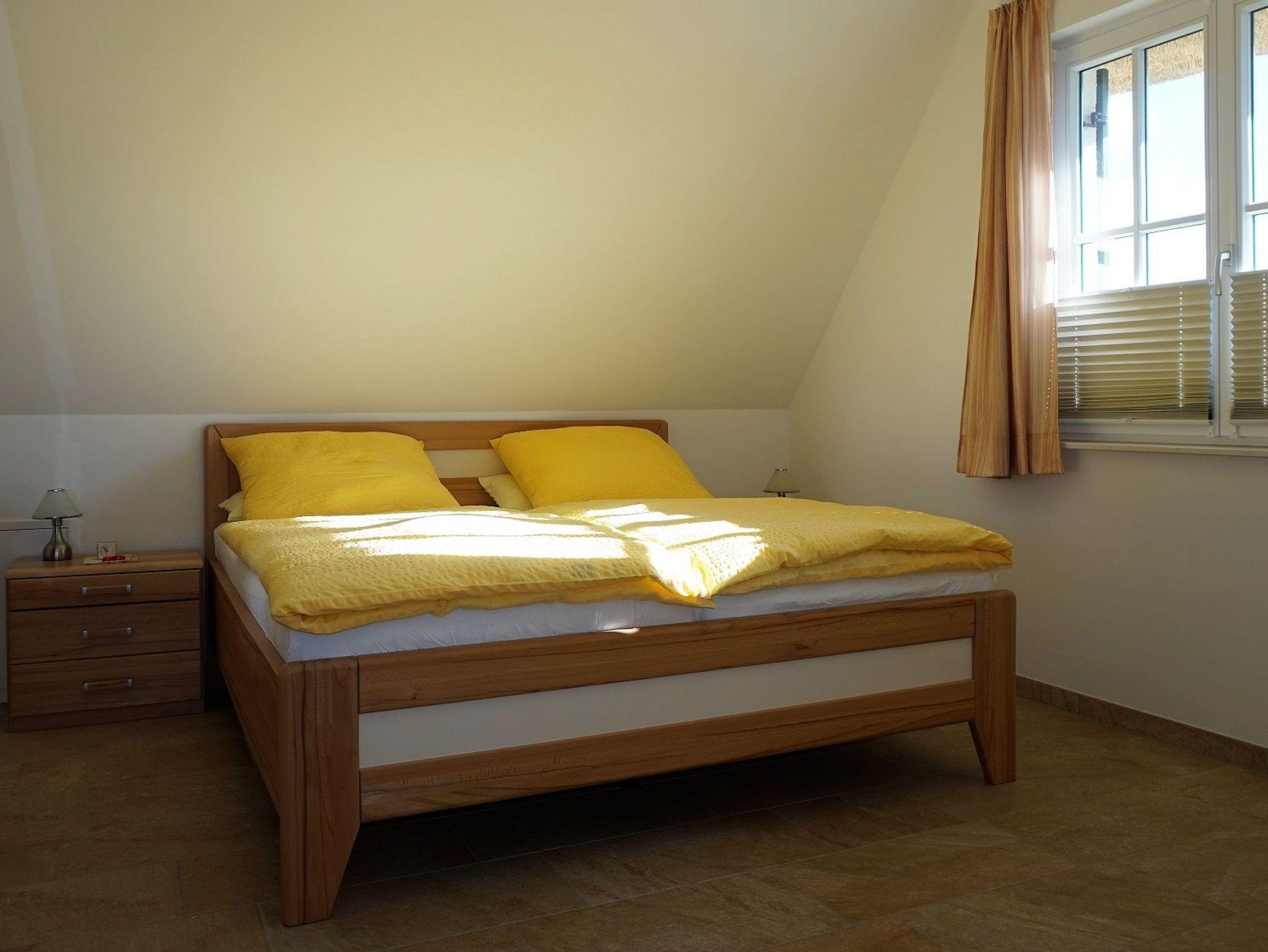 Im Obergeschoss können sich bequem vier Personen in den zwei Schlafzimmern zurück ziehen.[nbsp]Im ersten Schlafzimmer stehen zwei Einzelbetten (a`90x200) bereit. Im zweiten Schlafzimmer steht ein Doppelbett (180x200) sowie ein Kleiderschrank und ein Sofa für entspannte Lesestunden. Hier kann bei Bedarf ein Kinderreisebett aufgestellt werden. Alle Räume lassen sich durch die Außenläden und Vorhänge bzw. Plieses verdunkeln. Ein Lüften ist dank der Fliegenschutzgitter zu jeder Zeit möglich. Eine Fußbodenheizung sorgt für ein angenehmes Raumklima. Haustiere sind nicht gestattet und das Rauchen ist nur im Freien erlaubt. Im Abstellschuppen stehen ein Bollerwagen und Strandliegen und er bietet zusätzlich Platz für mitgebrachte Fahrräder.