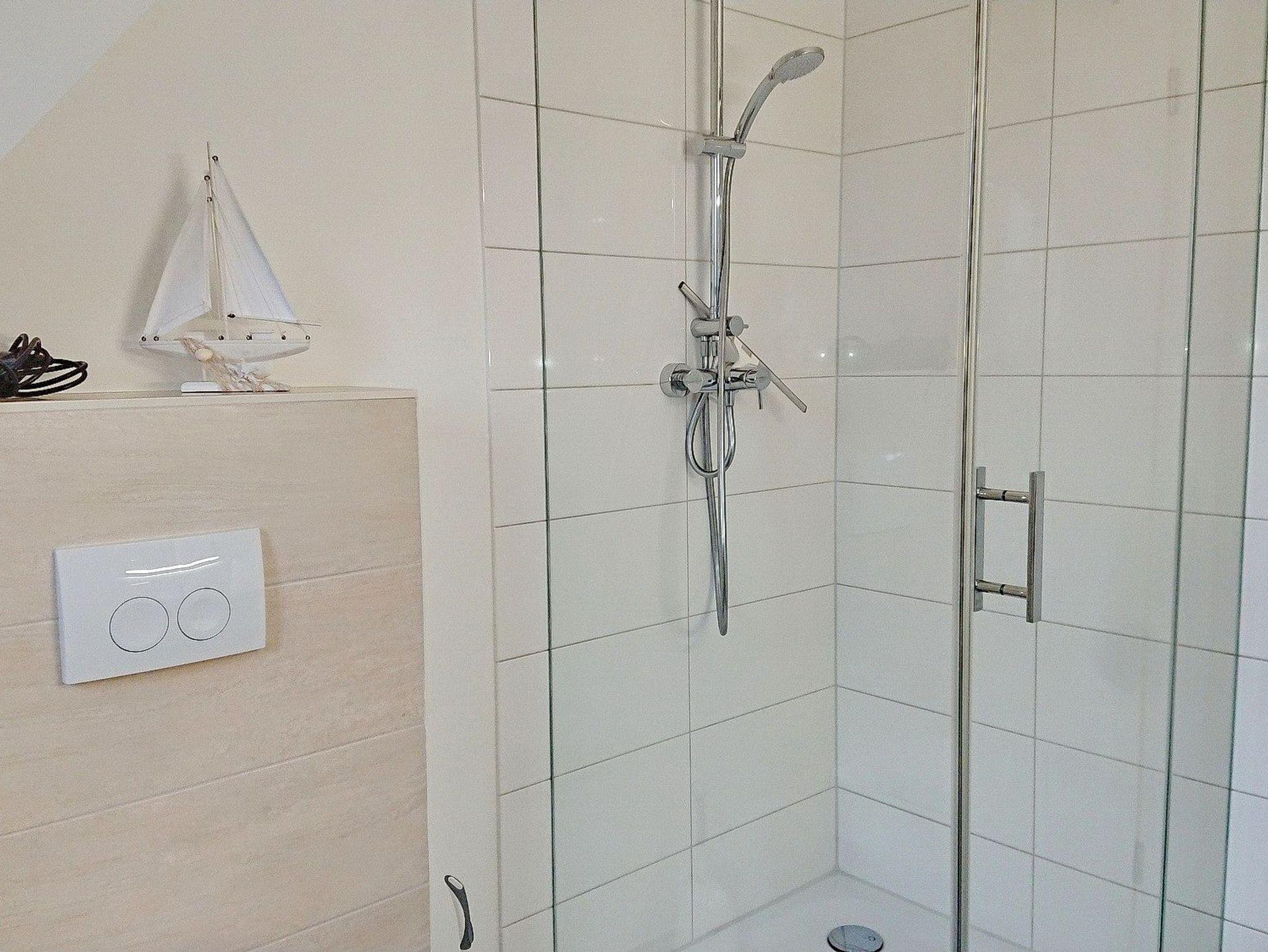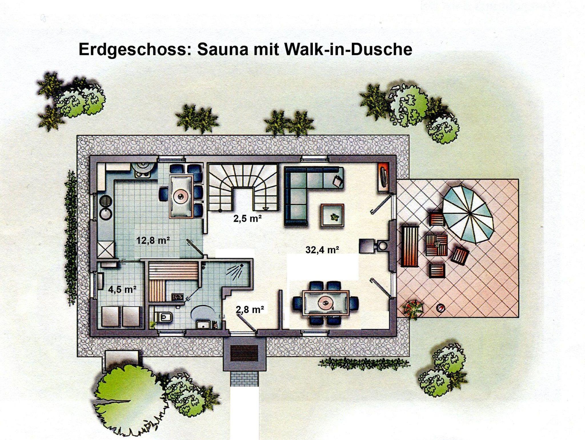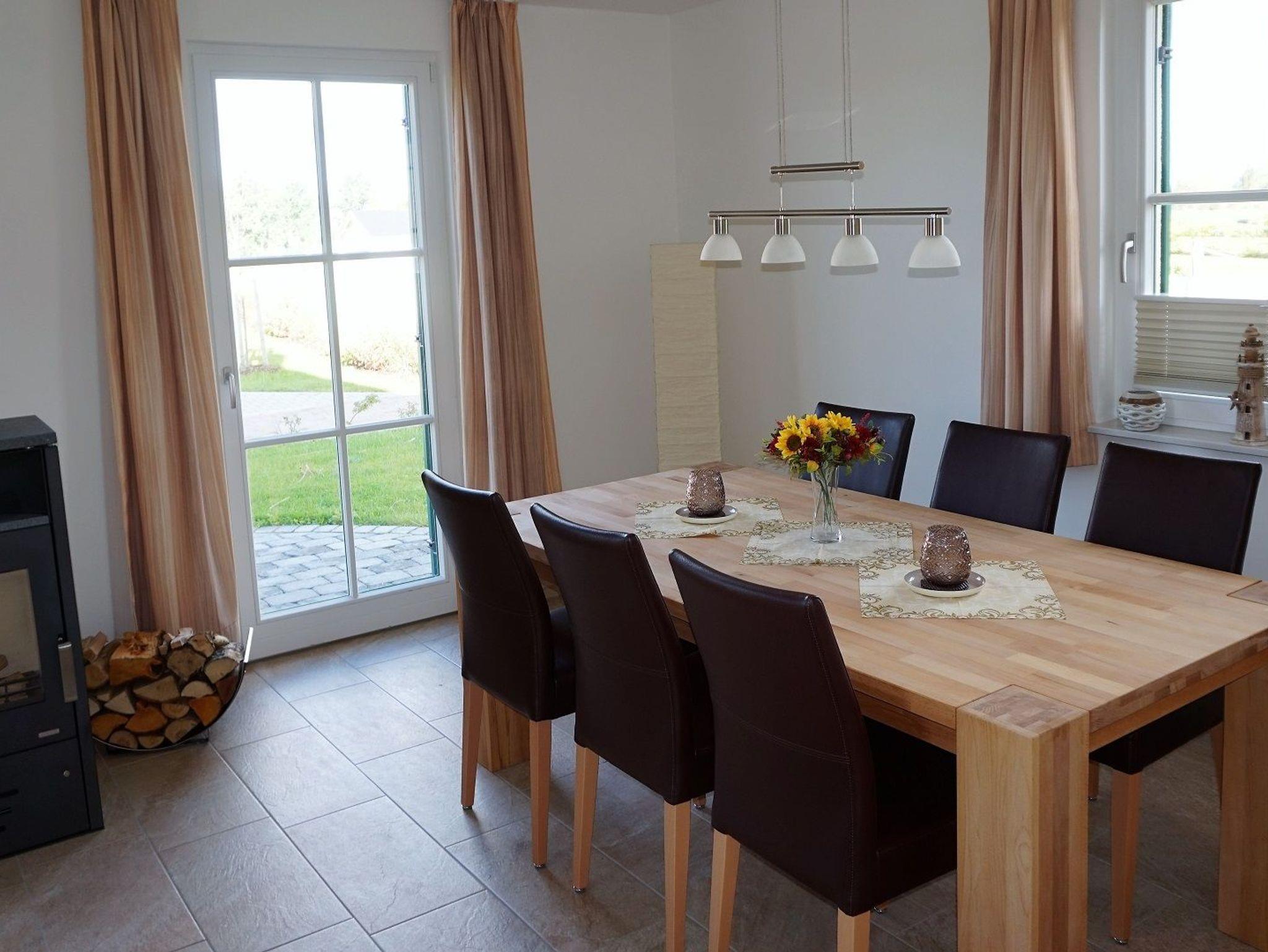 Vom Garten aus haben Sie einen wunderbaren Blick auf die Ostseeküste. Ein Grillplatz mit Sitzgelegenheit und der Strandkorb sind zu dieser Richtung ausgerichtet. Im Ferienhaus besticht die Einrichtung aus Vollholzmöbel. Der Wohnbereich ist hell eingerichtet und bietet bis zu sechs Personen Platz zum Essen und gemütlichen Beisammensein vor dem Kamin. Die Küche ist separat und ist sehr gut mit Mikrowelle/Grill, Ceran-Kochfeld, Backofen, Geschirrspüler u.v.m. ausgestattet. Eine Sitzbank und Tisch bieten dort einen weiteren schönen Essbereich. Im Hauswirtschaftsraum steht eine Wasch-Trocknermaschine, Bügeleisen, Bügelbrett und einige Putzutensilien zur Verfügung. Das Duschbad im Erdgeschoss verfügt über eine Wellnessdusche und einer Sauna sowie WC und Waschbecken.