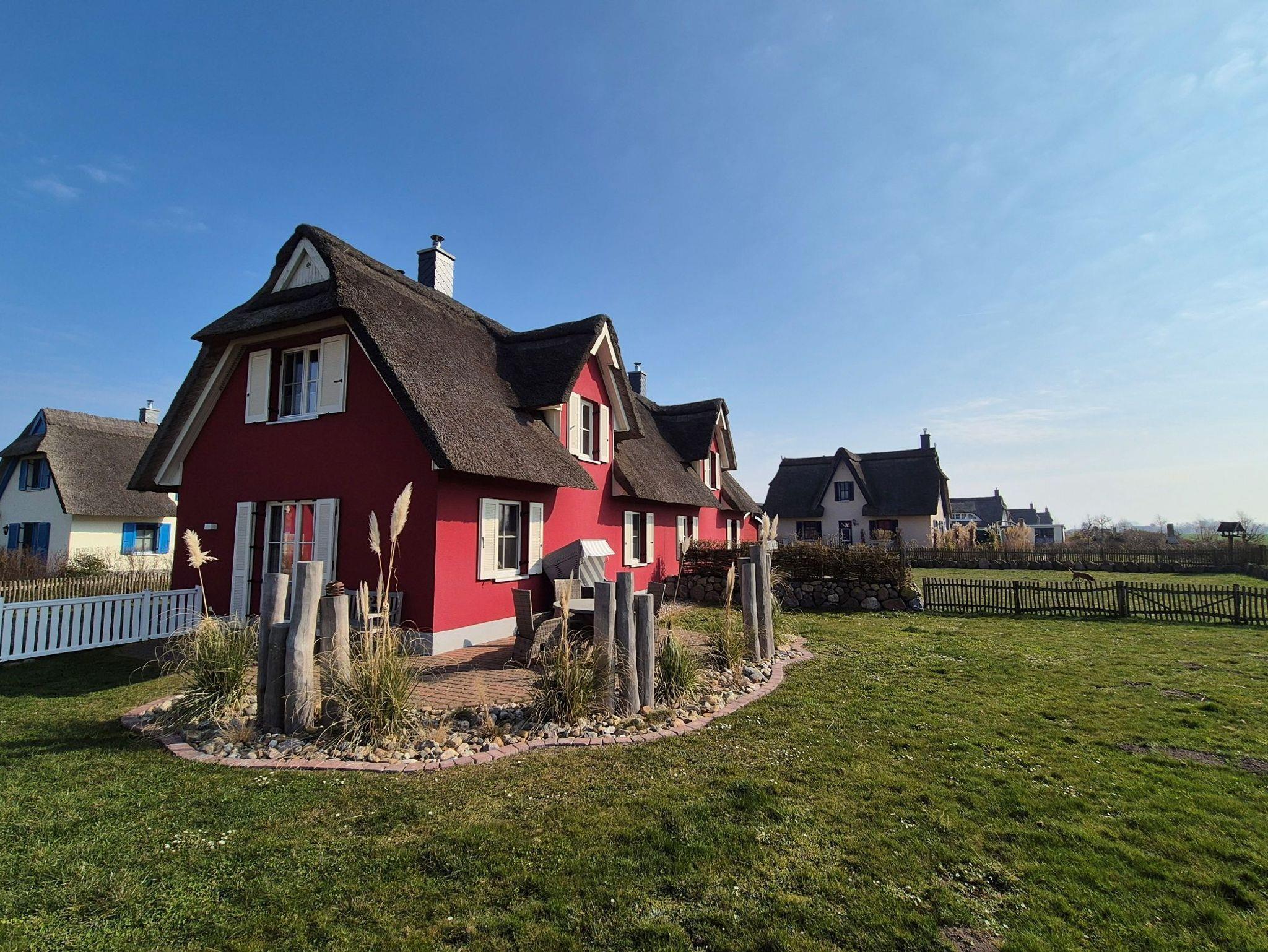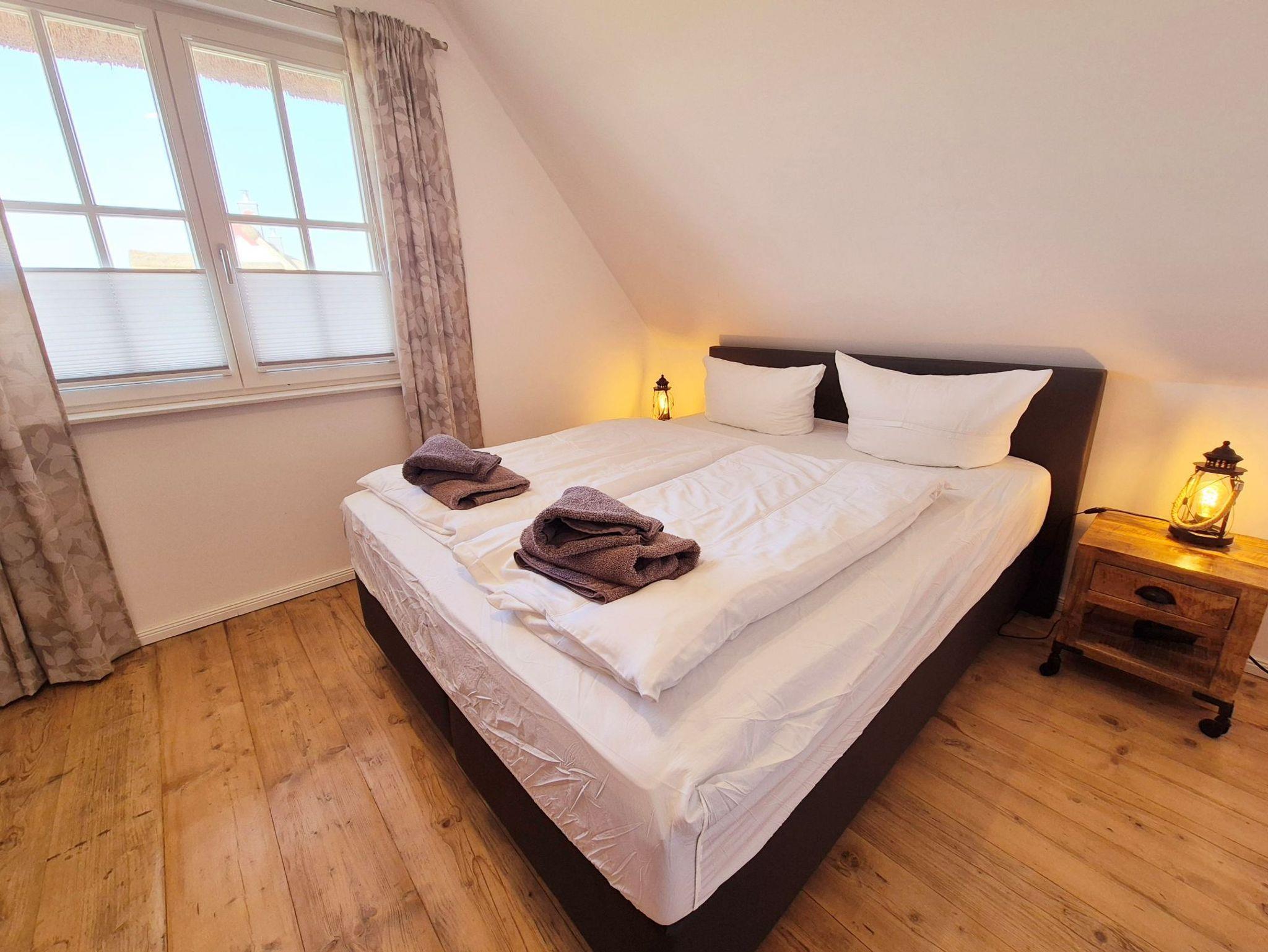 Im oberen Bereich stehen Ihnen zwei Schlafzimmer mit je einem Boxspringbett und Kommoden zur Verfügung. Ein 2. TV ist in einem Schlafzimmer vorhanden. Das Duschbad mit Echtglasduschabtrennung, Waschbecken und WC ist in der typischen Fledermausgaube des Reethauses eingerichtet. Im gesamten Haus ist eine Fußbodenheizung verlegt. Zum Sichtschutz sind Pliesses, Vorhänge und Fensterklappläden angebracht. Ein Waschmaschine und Trockner und diverse Putzutensilien sowie Bügelbrett und Bügeleisen sind im HWR verstaut. Im Garten zur Südseite können Sie es sich auf den Gartenmöbel bequem machen und Blicke über die Wiesen und Felder Ihre Blicken schweifen lassen. Ein Sonnenschirm ist vorhanden. Zusätzlich ist ein Strandkorb und Loungemöbel zum Entspannen im Garten vorhanden. Zum Grillen steht Ihnen ein Elektrogrill von Weber zur Verfügung. Zum Naturstrand sind es ca. 500 m. Hier sind Hunde erlaubt. Zwei Stellplätze befinden sich direkt am Ferienhaus.