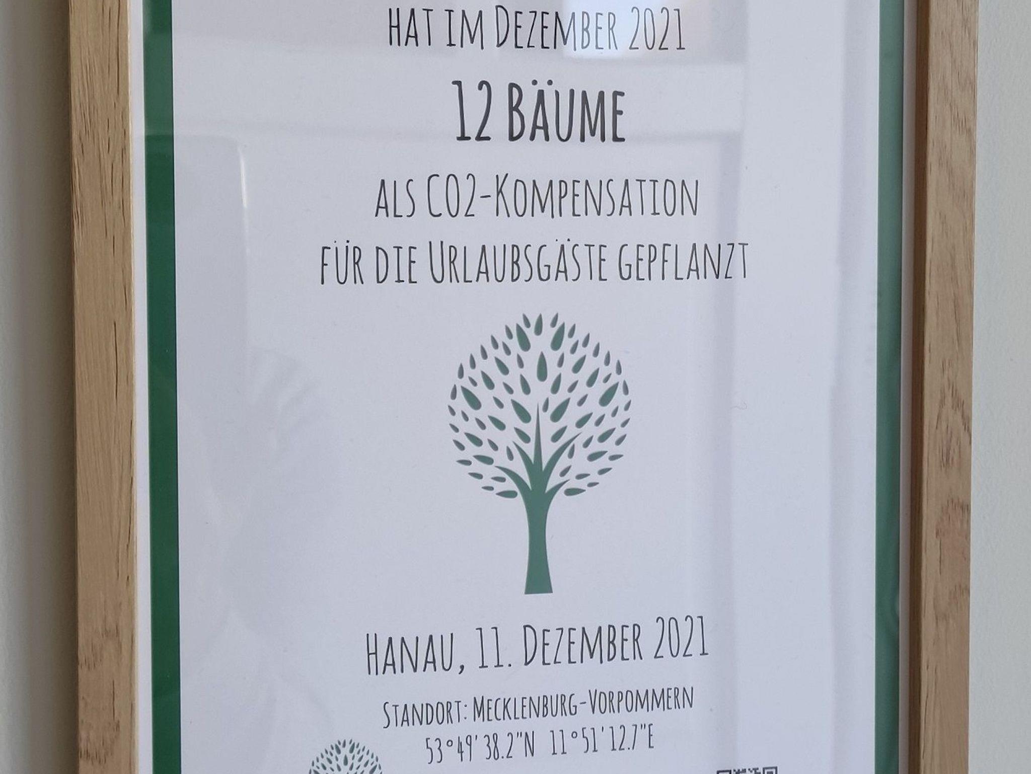 CO² neutralen Urlaub, durch die Unterstützung der Aufforstung in MV. Ausschließliche Nutzung von Strom aus erneuerbaren Quellen / Ökostrom.
