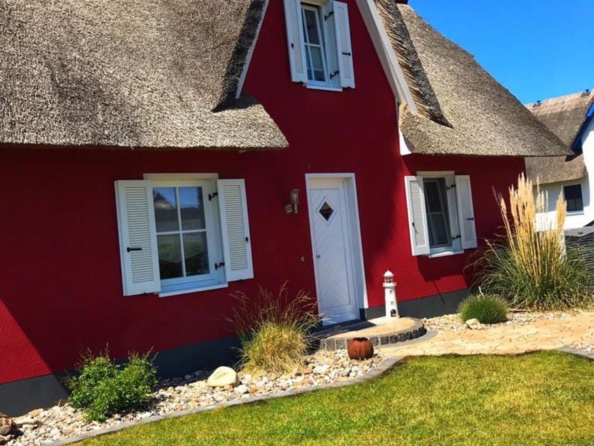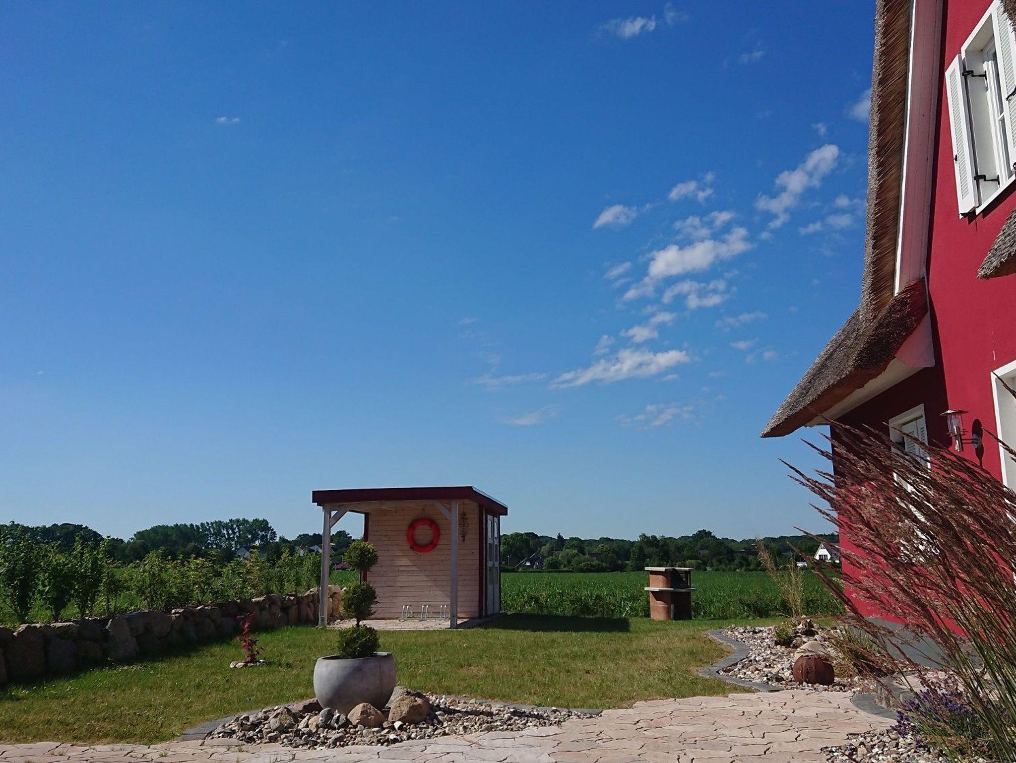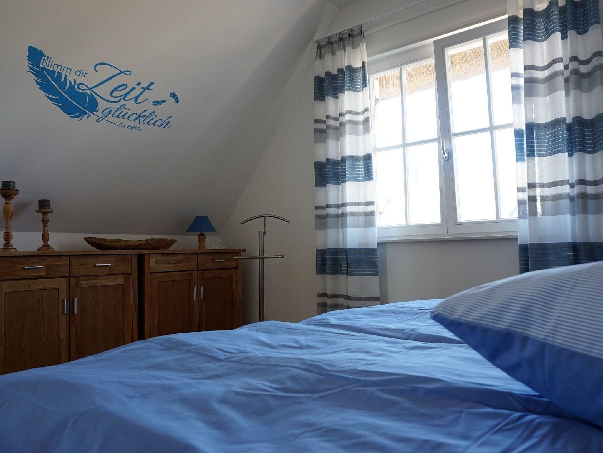 Desweiteren befindet sich im Erdgeschoss die Sauna mit Wellness-Dusche und WC. Im Obergeschoss sind zwei Schlafzimmer eingerichtet. Das Elternschlafzimmer mit Echtholzmöbeln ist mit einem Doppelbett und Kommoden ausgestattet. In den Schlafzimmern sind Fliegenschutzgitter angebracht. Zur Verdunkelung und Sichtschutz dienen die Fensterklappläden und Gardinen. Im 2 Schlafzimmer befindet sich ein weiteres Doppelbett, ein Kleiderschrank, 2. TV sowie Sitzsack und ein Zustellbett für die 5. Person eingerichtet. Das Vollbad im Obergeschoss bietet einen wunderbaren Start in den Tag. Es ist mit einer Badewanne, Echtglasdusche, Waschbecken und WC sowie Spiegelschrank hochwertig ausgestattet. Das Reethaus ist ideal für Ihren Familienurlaub an der Ostseeküste. Am Haus sind zwei Stellplätze. Im Abstellschuppen befinden sich 2 Fahrräder. Diese können auf auf eigene Gefahr genutzt werden. Zum Strand sind es ca. 600 m.