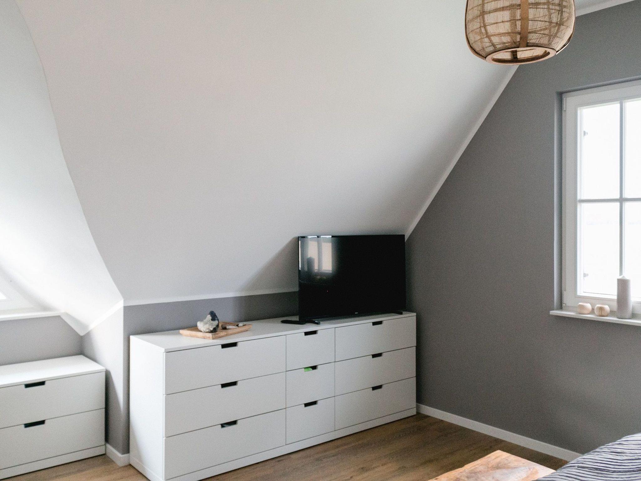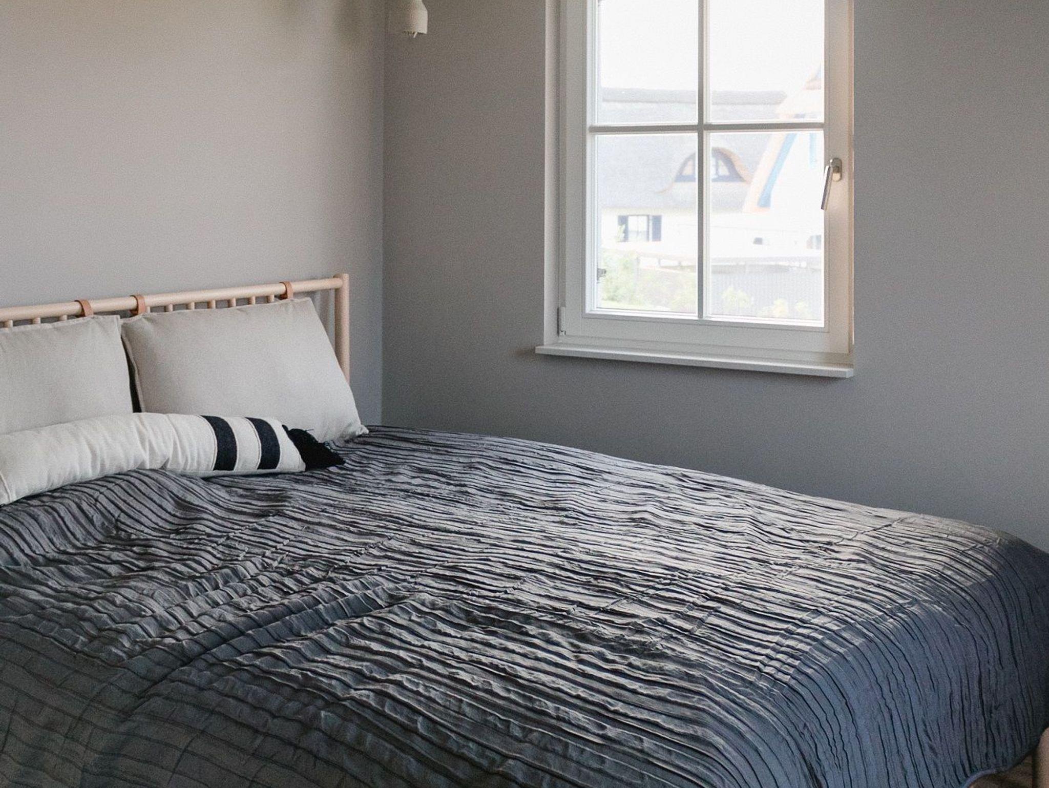 In der ersten Etage befindet sich linkerhand das große Schlafzimmer mit einem 1,80m Doppelbett, viel Stauraum, ebenfalls einem Smart-TV sowie einem Holz-Babybett, damit sich auch Ihr Nachwuchs wie Zuhause fühlen kann. Ein Reise-Babybett kann zusätzlich zur Verfügung gestellt werden und fände in diesem geräumigen Zimmer ebenfalls Platz.