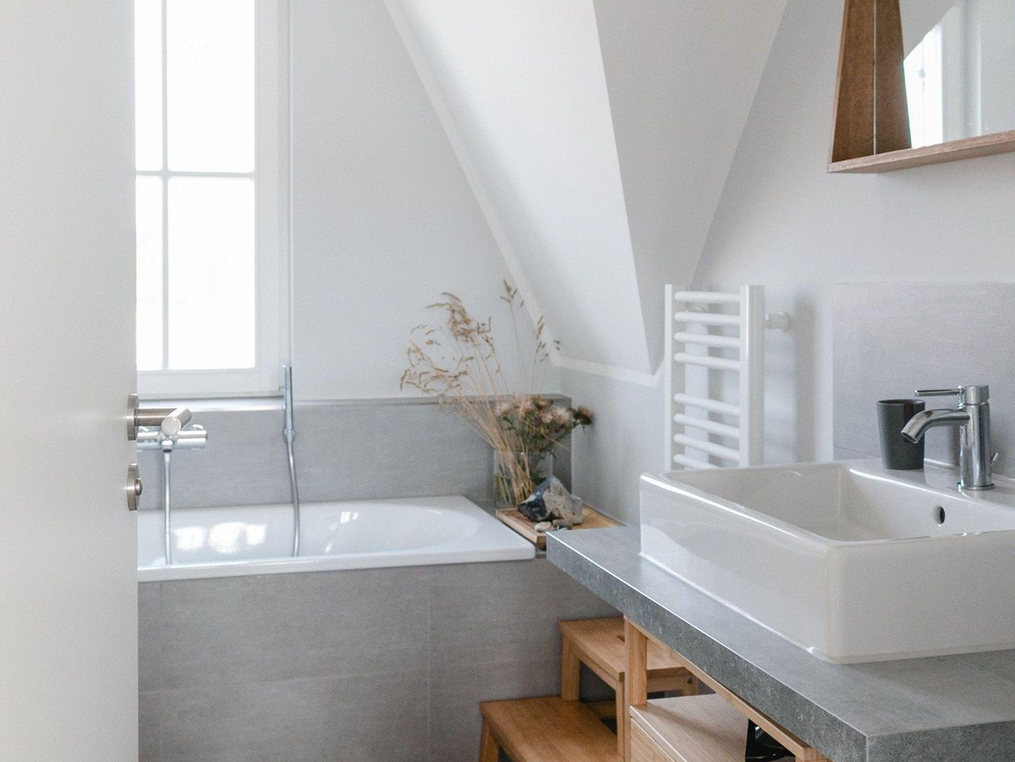 Das gemütliche Badezimmer im ersten Stock lädt mit Badewanne und zur Entspannung ein. Auch von hier haben Sie freien Blick auf die umliegenden Felder.