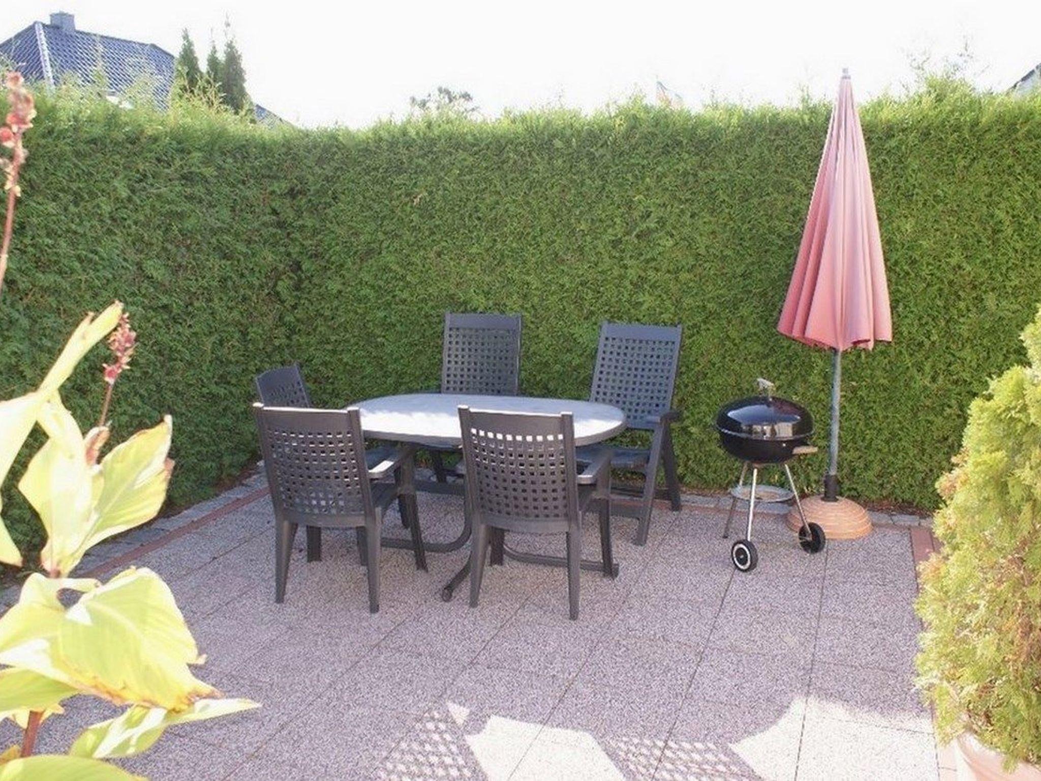 - idylle Terrasse mit Sitzmöbel, Tisch, Sonnenschutz, Grill, großes Gartengrundstück (u.a. Schaukel)