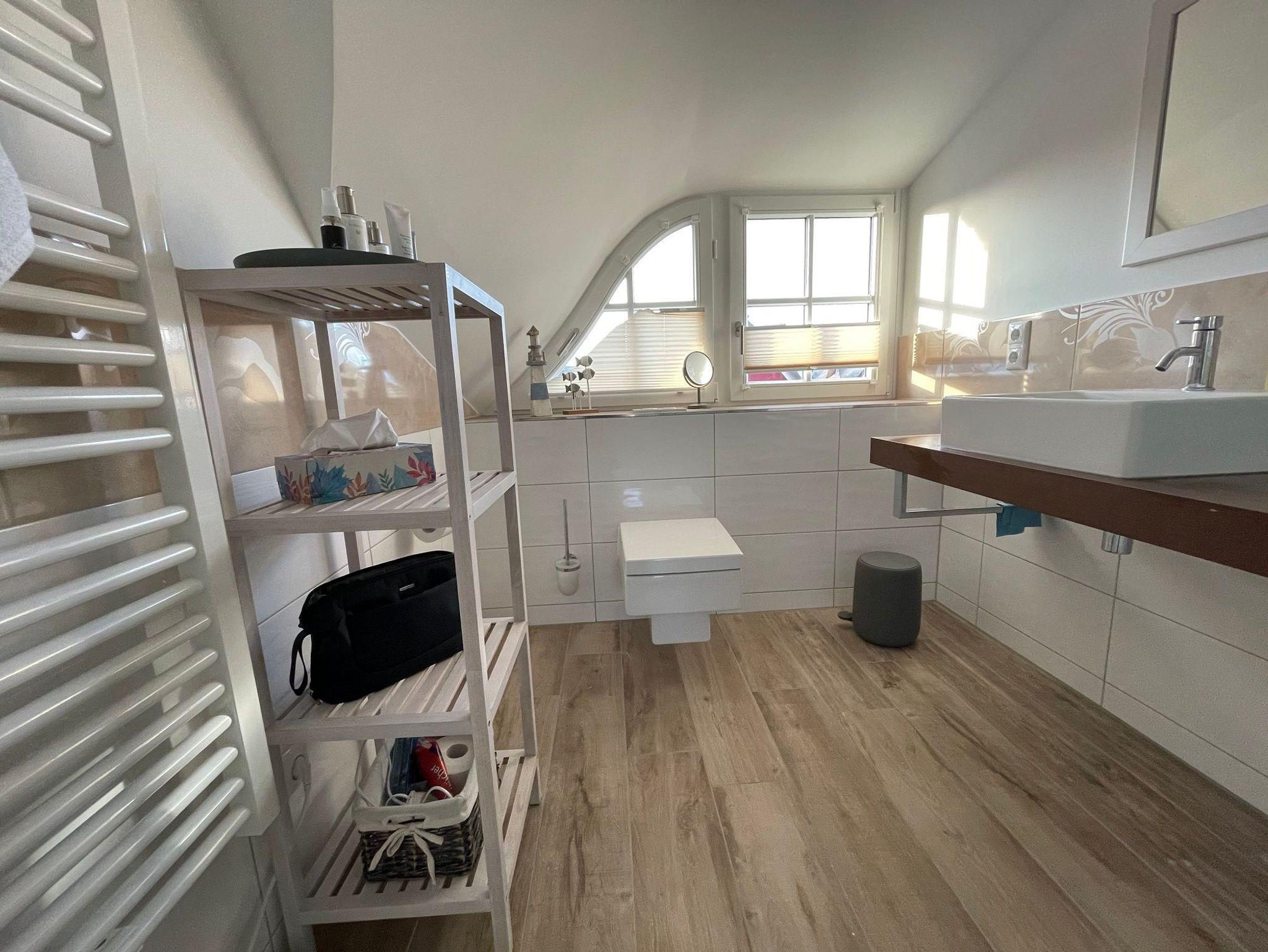 Das Duschbad mit Echtglasduschabtrennung, Waschbecken und WC ist in der typischen Fledermausgaube des Reethauses eingerichtet. Zum Sichtschutz sind Plissees und Vorhänge angebracht.