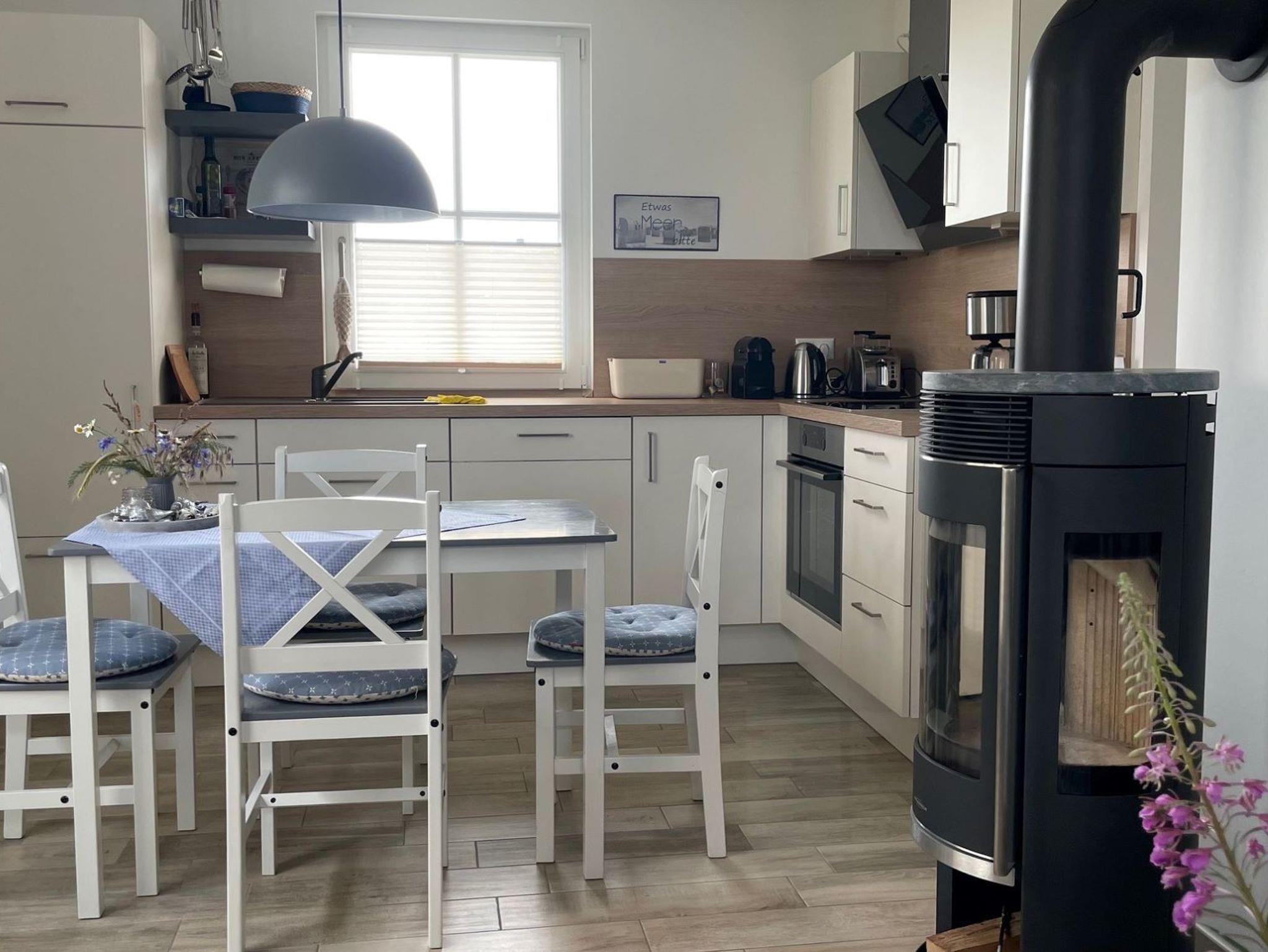 Das ganze Haus ist im skandinavischen Stil eingerichtet und mit Fußbodenheizung ausgestattet. Die Küche ist modern und mit vielen Extras ausgestattet. Das von allen Seiten sichtbare Kaminfeuer bringt eine wohlige Stimmung ins Haus. Die Sauna mit Wellnessdusche im Erdgeschoss bietet angenehm Platz zum Erholen. Durch das Fenster des Ruheraumes kann der Blick über die Felder bis zum Meer schweifen. Das Gäste-WC mit Tageslicht befindet sich ebenfalls im Erdgeschoss.