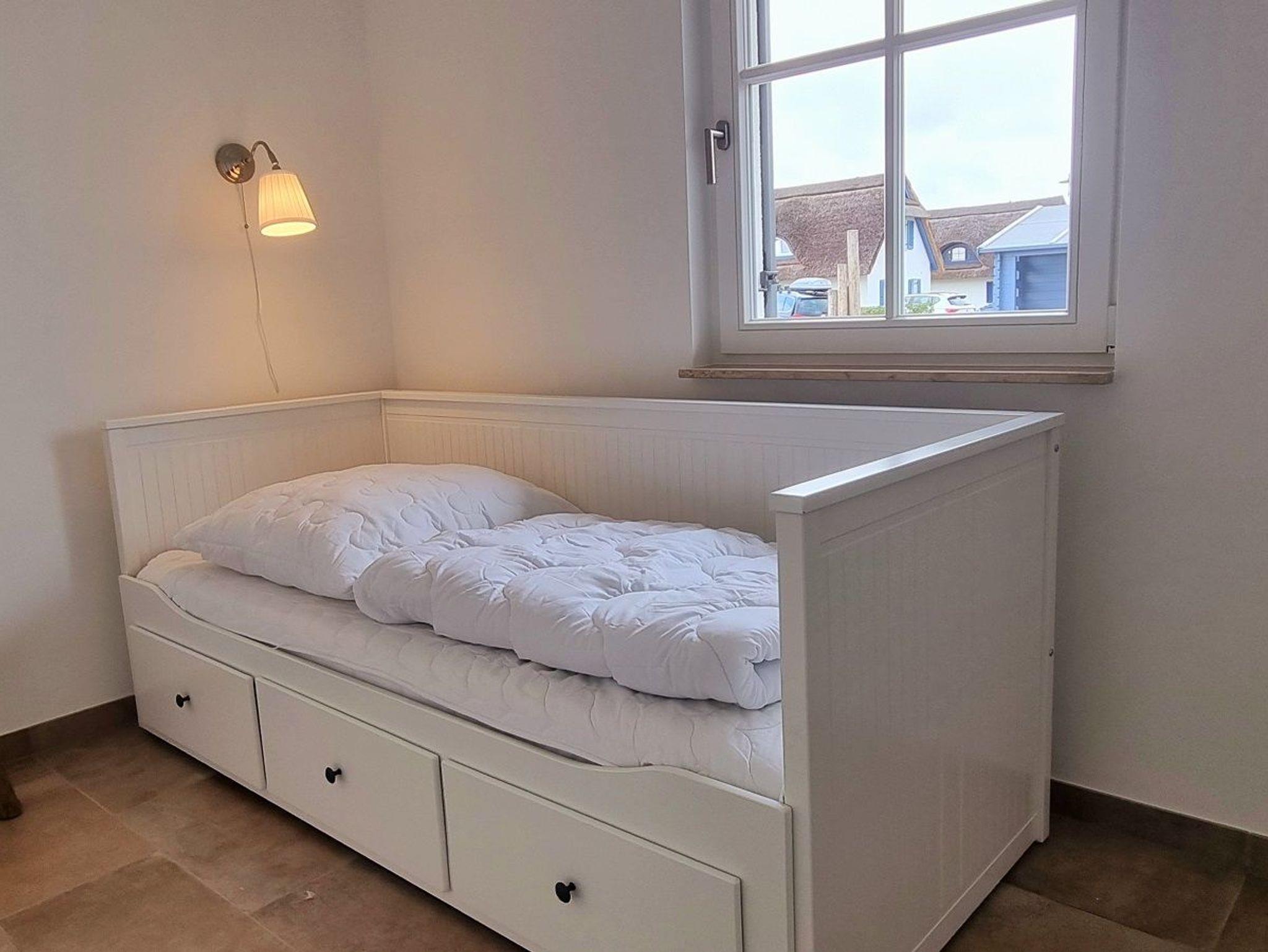 Das Ferienhaus ist für drei Personen modern ausgestattet. Die Zimmeraufteilung ist für das Reethausgebiet einzigartig.