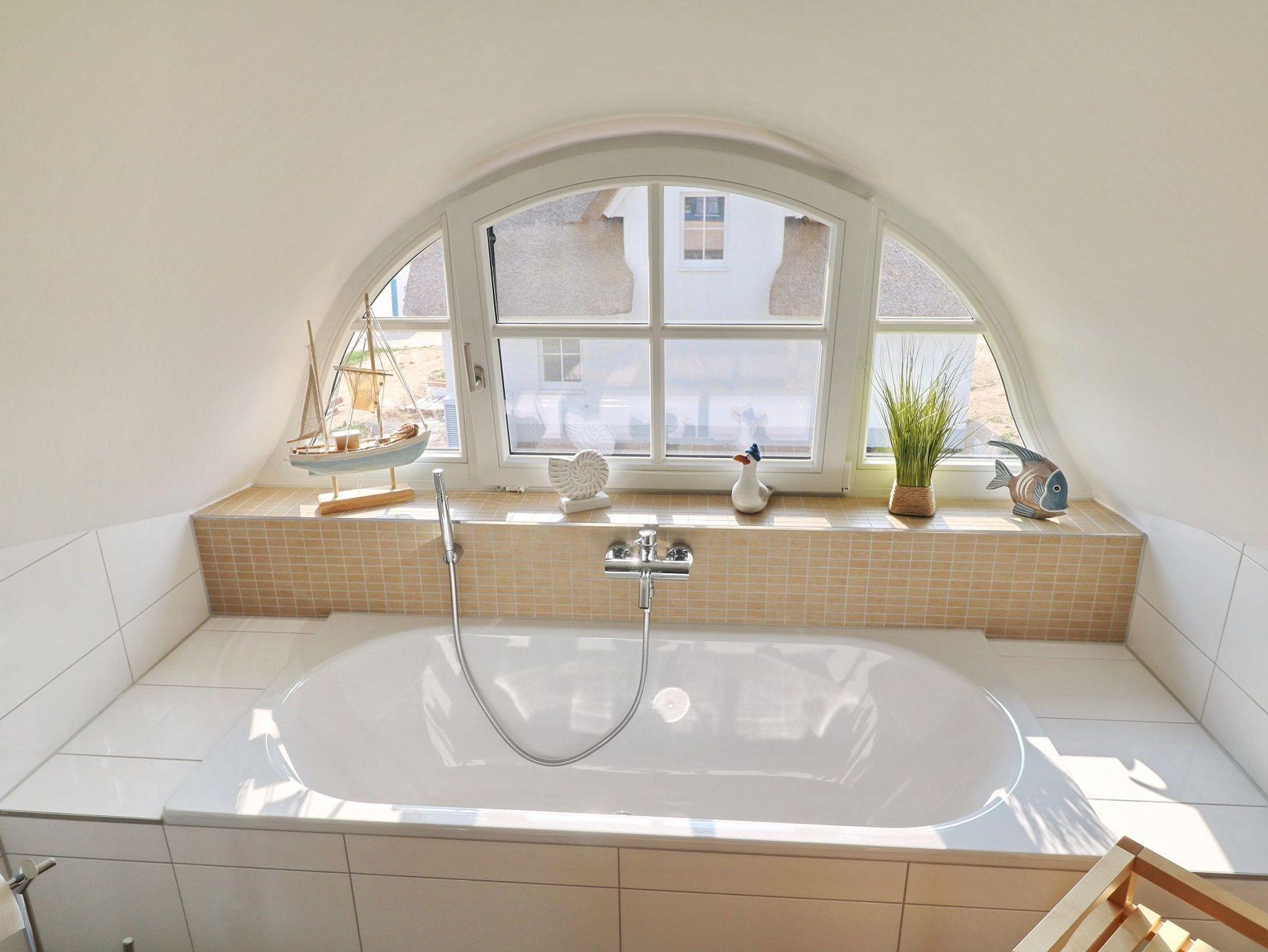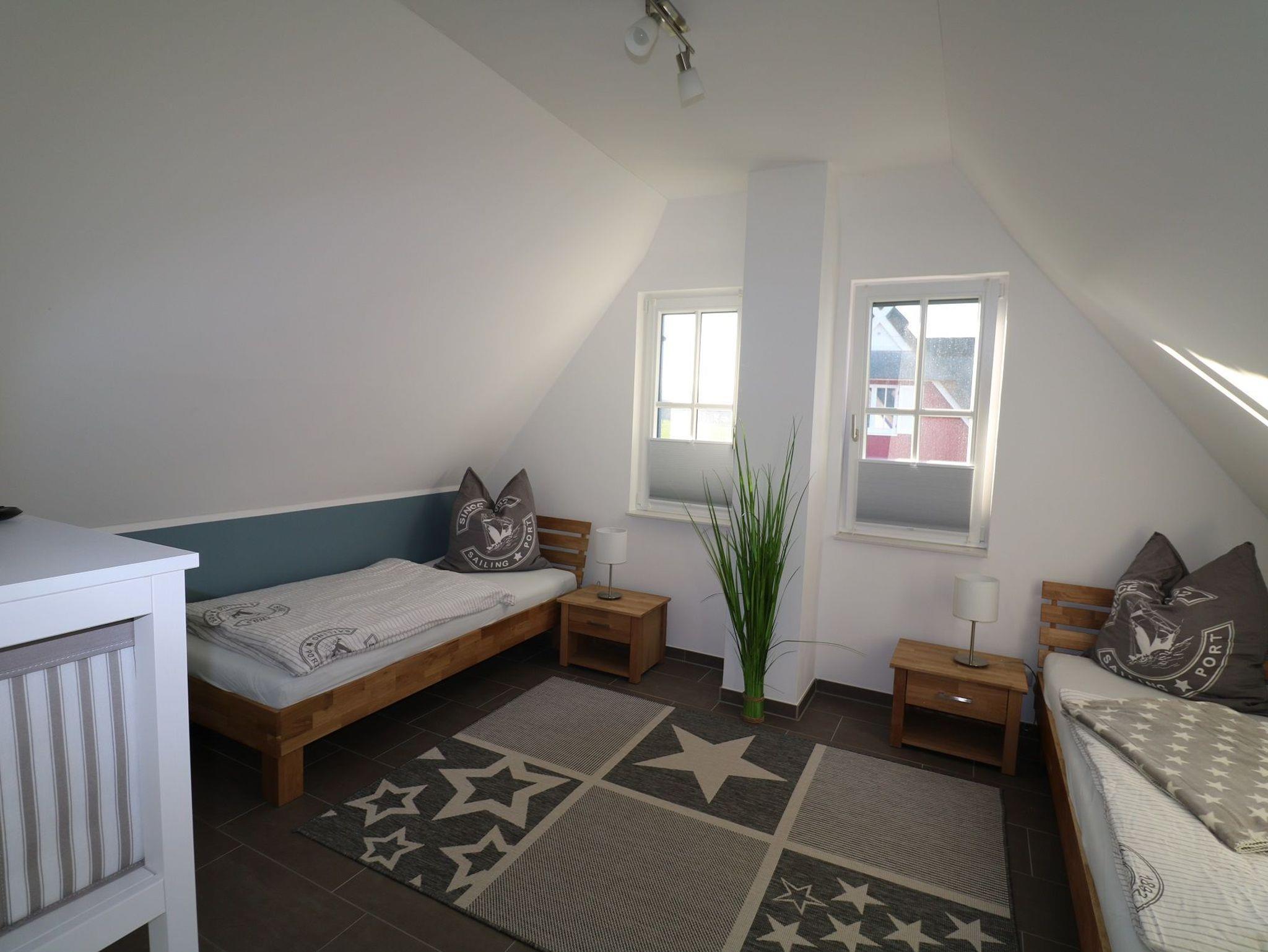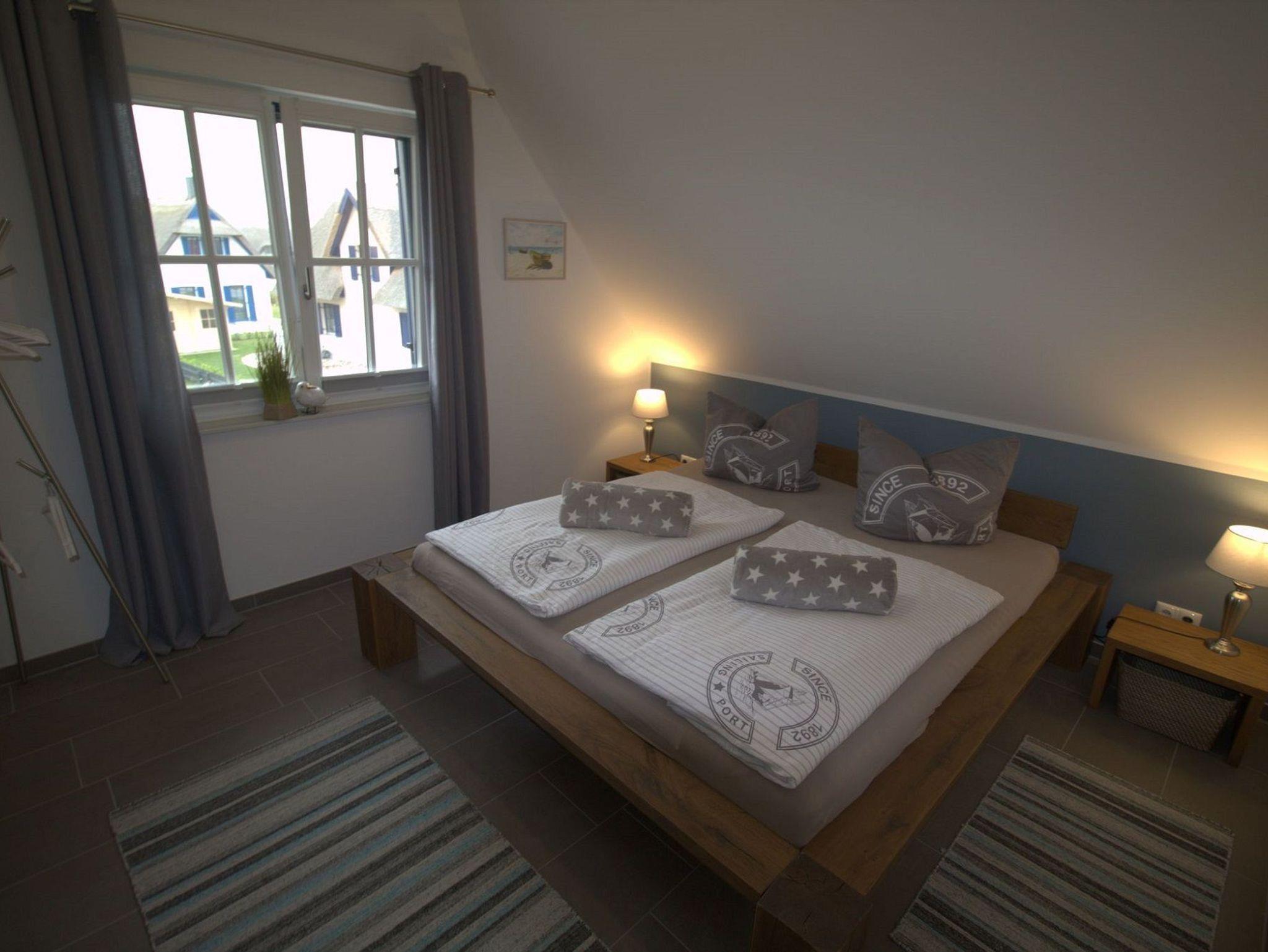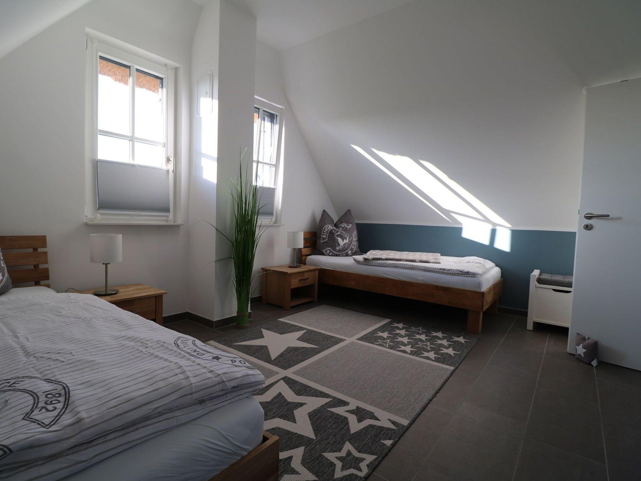 Im Obergeschoss befindet sich das Vollbad mit typischer Fledermausgaube und zwei Schlafzimmern. Im Elternschlafzimmer steht ein Doppelbett, sowie eine große Kommode und ein Garderobenständer zur Verfügung. Von hier aus haben Sie einen schönen Blick über das Reethausgebiet bis hin zur Insel Poel und der Ostseeküste. Im Kinderschlafzimmer stehen zwei Einzelbetten, eine Kommode, ein 2. TV, eine Sitztruhe und ein Regal. So haben Ihre Kinder viel Platz um Ihre Ferien an der Ostsee zu genießen. Alle Schlafräume, die Badezimmer und eine Terrassentür im Wohnzimmer sind mit Fliegengitter ausgestattet. Auf der möblierten Südterrasse stehen Gartenmöbel, 2 Sonnenliegen und ein sehr gemütlicher XL-Strandkorb bereit und laden zum Verweilen und Entspannen ein.