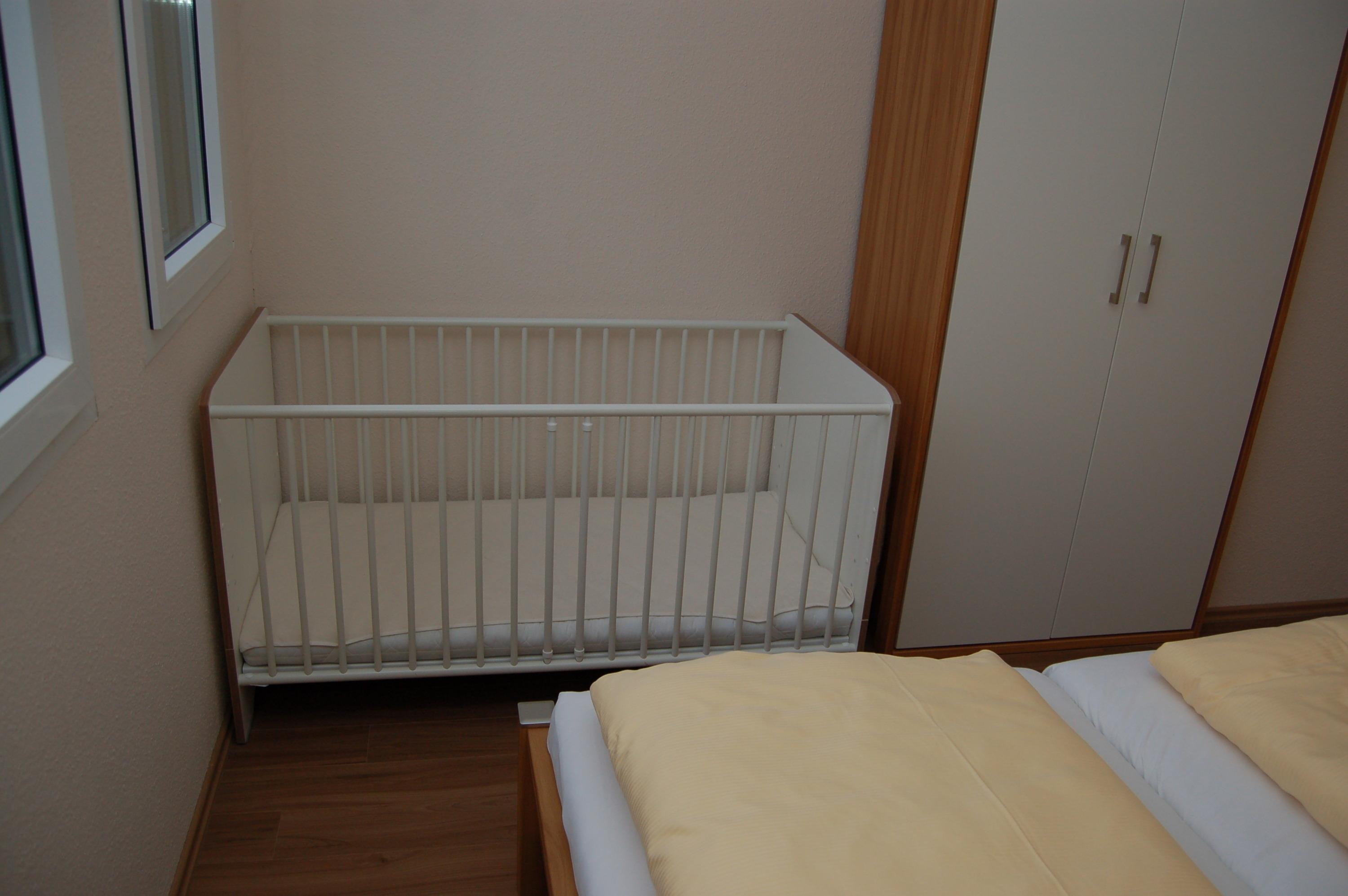ein Elternschlafzimmer mit Doppelbett, Kinderbett, Schrank und Nachtkonsolen,