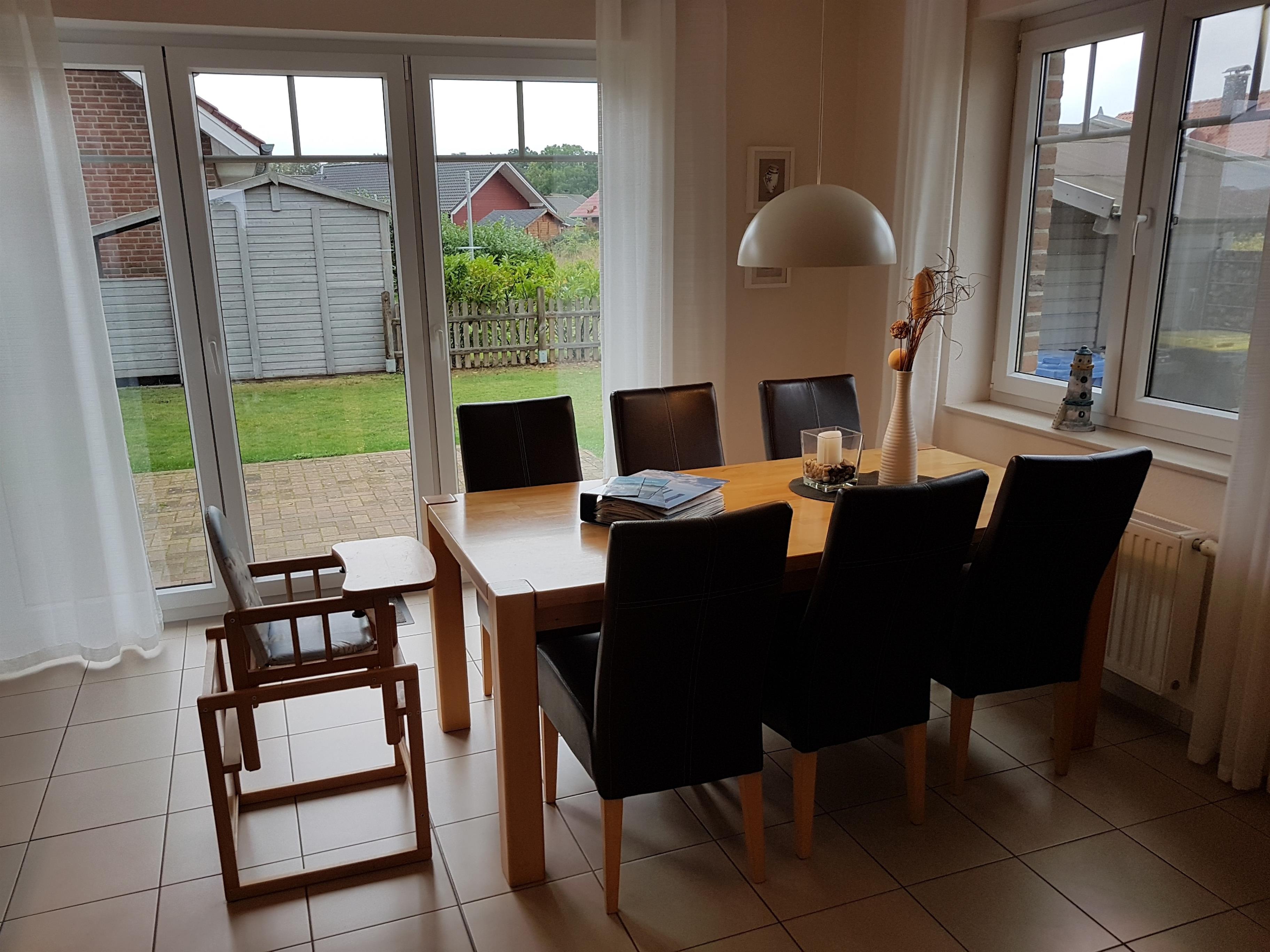 ein gemütlicher Essbereich mit Esstisch und Kinderhochstuhl,