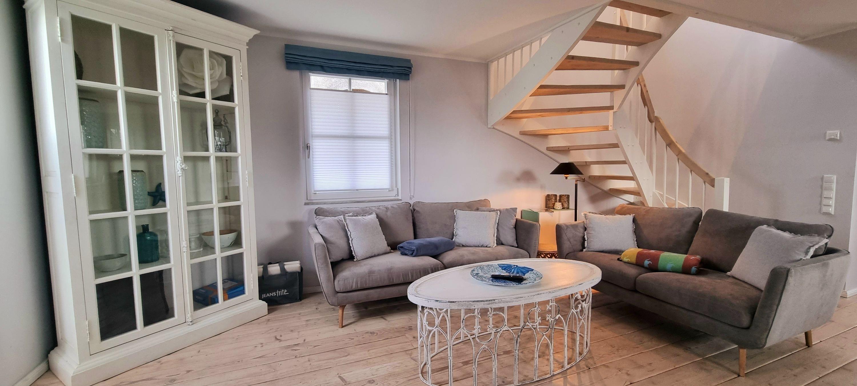 Im oberen Bereich stehen Ihnen ein Schlafzimmer mit einem Boxspringbett und zwei weitere Schlafzimmer mit je einem Einzelbett zur Verfügung. In allen Schlafzimmern ist ein TV vorhanden. Das Vollbad mit Echtglasduschabtrennung, Waschbecken und WC ist in der typischen Fledermausgaube des Reethauses eingerichtet. Im gesamten Haus ist eine Fußbodenheizung verlegt. Zum Sichtschutz sind Pliesses, Vorhänge und Fensterklappläden angebracht. Ein Waschmaschine und Trockner und diverse Putzutensilien sowie Bügelbrett und Bügeleisen sind im HWR verstaut.