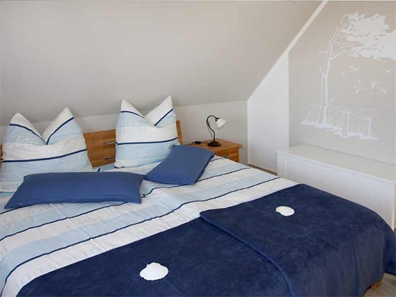 Im Obergeschoss befinden sich 2 Schlafräume und ein Vollbad. Das Meerblick-Schlafzimmer ist mit einem Massivholz-Doppelbett (180 x 200) und das gartenseitige Schlafzimmer mit 2 Massivholz-Einzelbetten (90 x 200) mit jeweils zusätzlichem Auszug-Schlafplatz (90 x 200) ausgestattet.