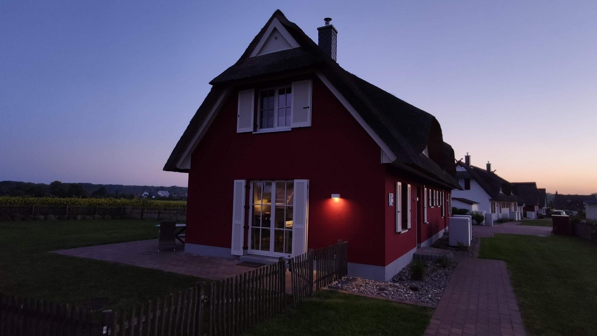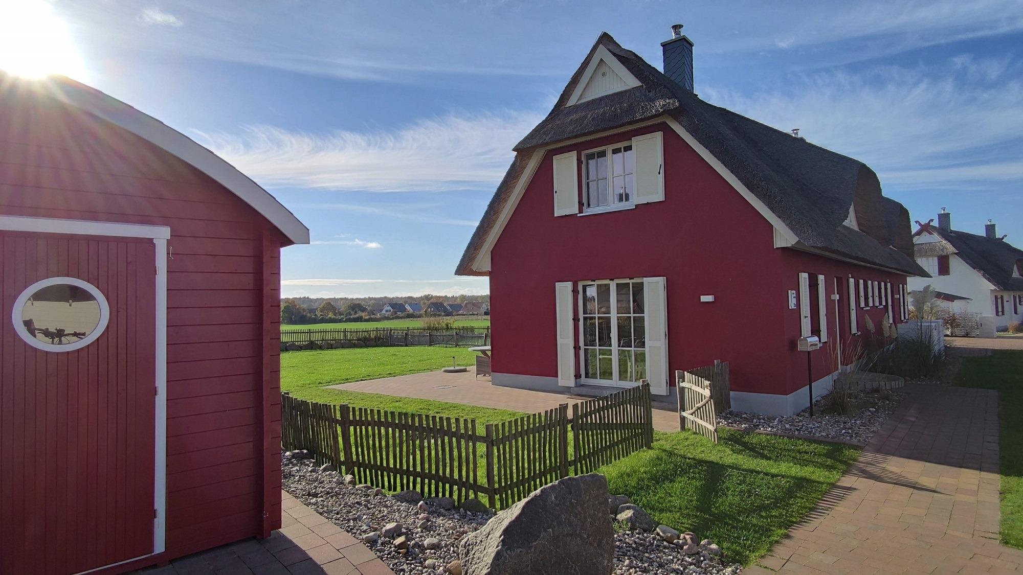 Im Garten zur Südseite können Sie es sich auf den Gartenmöbel bequem machen und Blicke über die Wiesen und Felder Ihre Blicken schweifen lassen. Ein Sonnenschirm ist vorhanden. Zusätzlich ist ein Strandkorb und Loungemöbel zum Entspannen im Garten vorhanden. Zum Grillen steht Ihnen ein Elektrogrill von Weber zur Verfügung. Zum Naturstrand sind es ca. 500 m. Hier sind Hunde erlaubt.