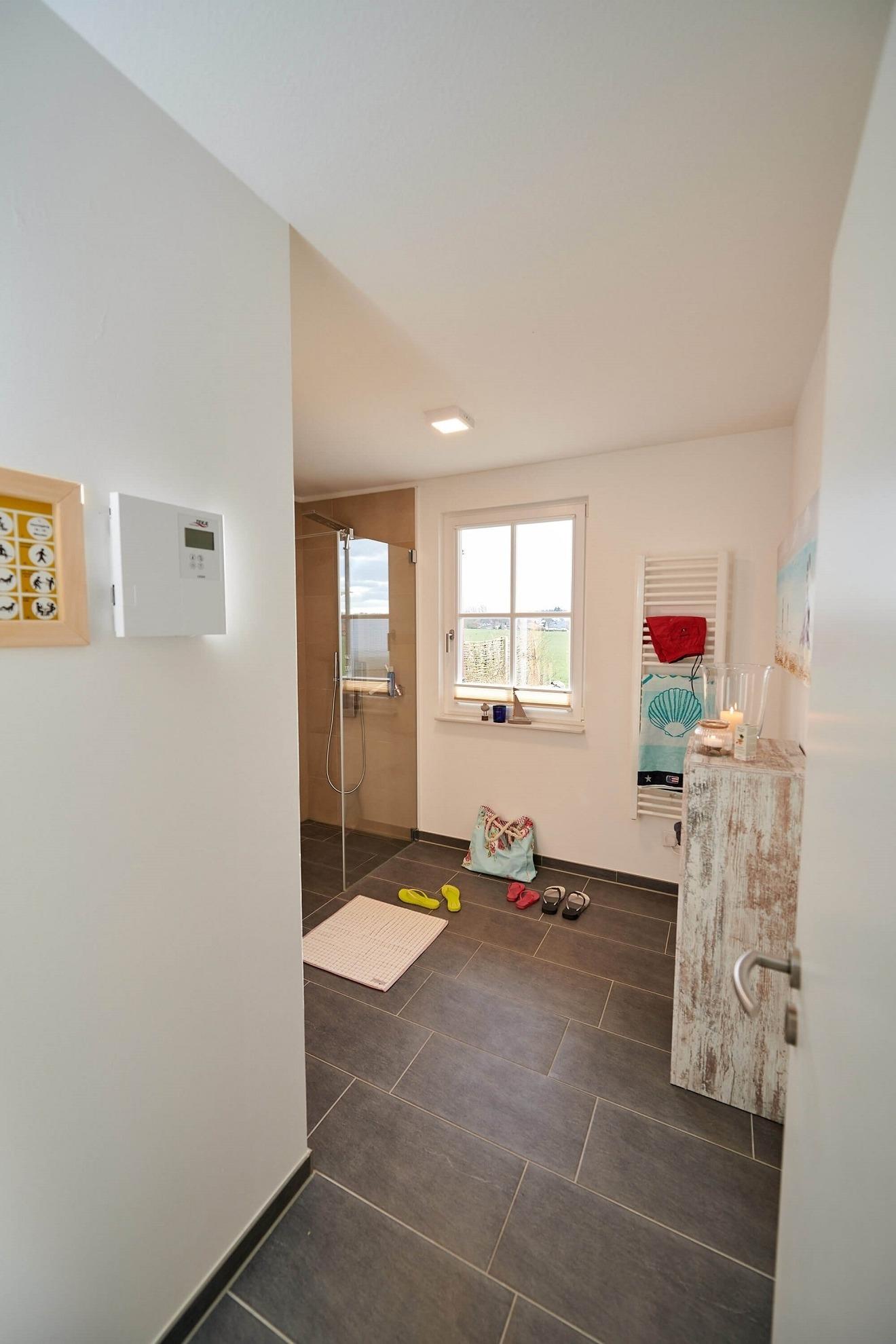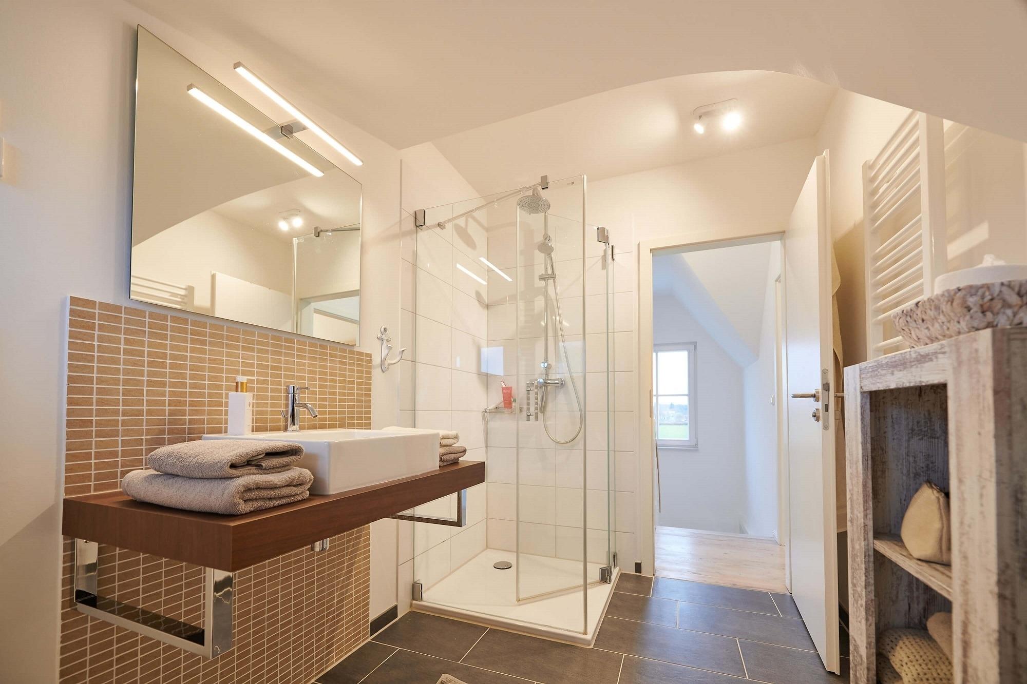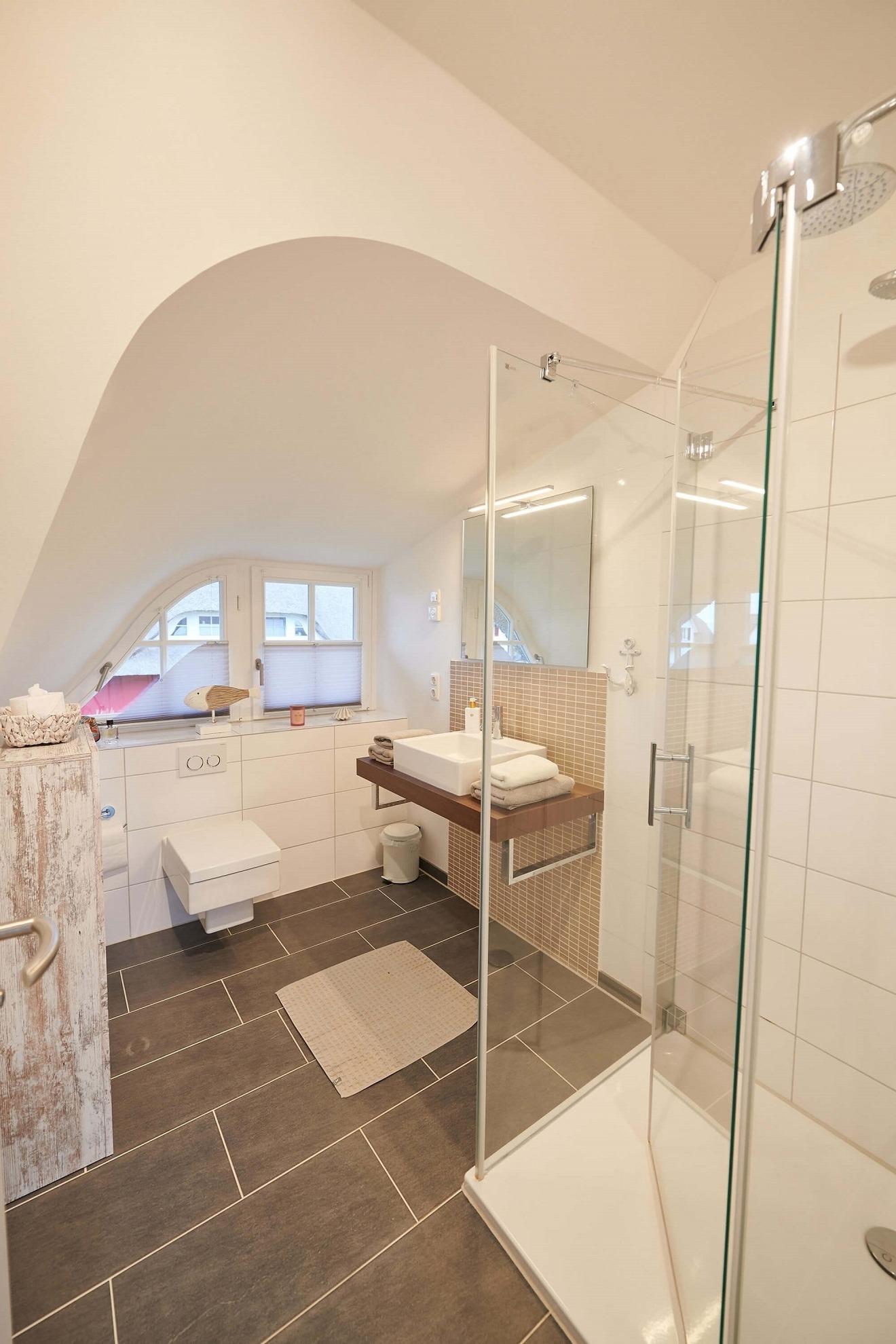 Das Duschbad mit Echtglasduschabtrennung, Waschbecken und WC ist in der typischen Fledermausgaube des Reethauses eingerichtet.