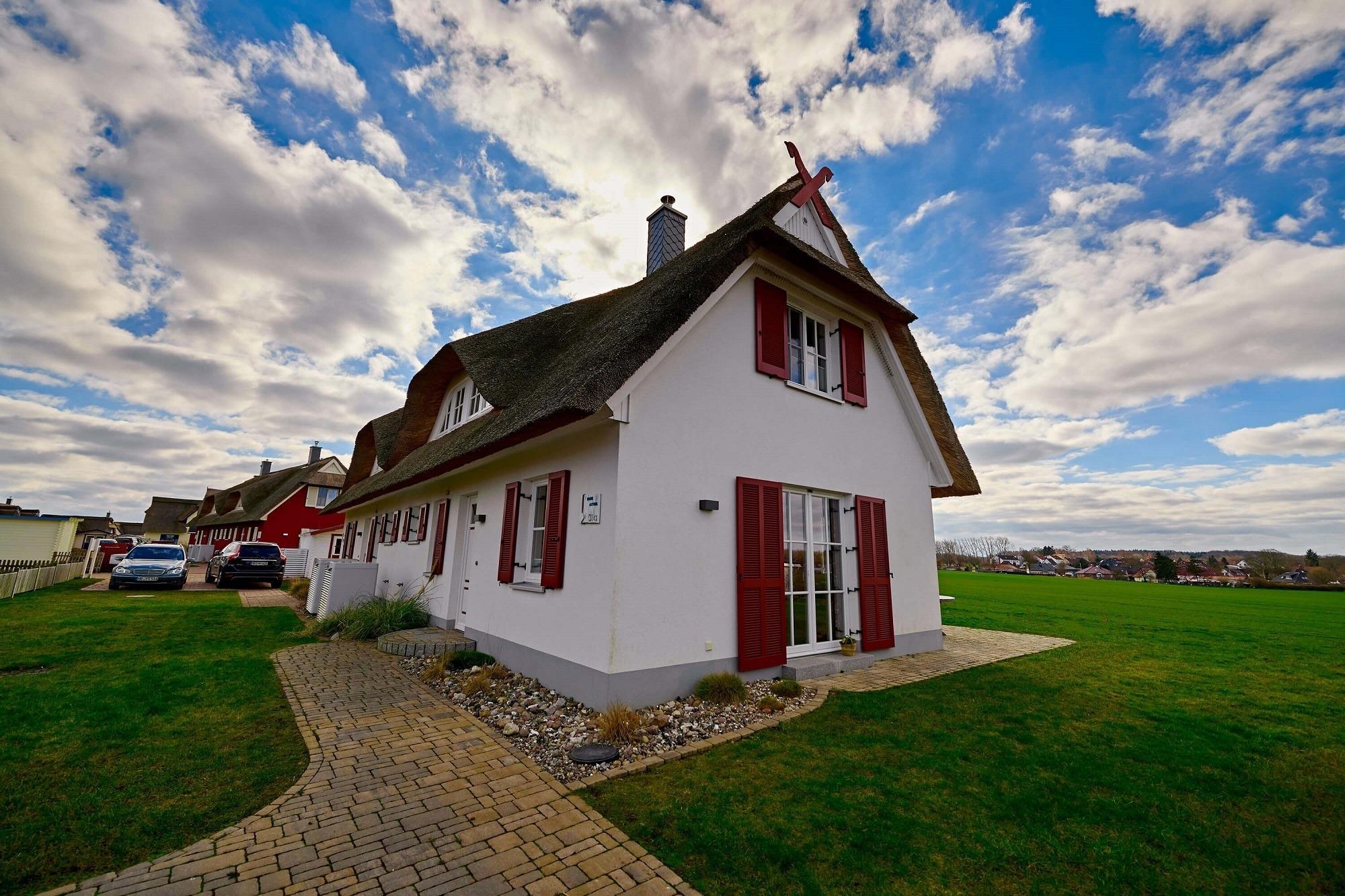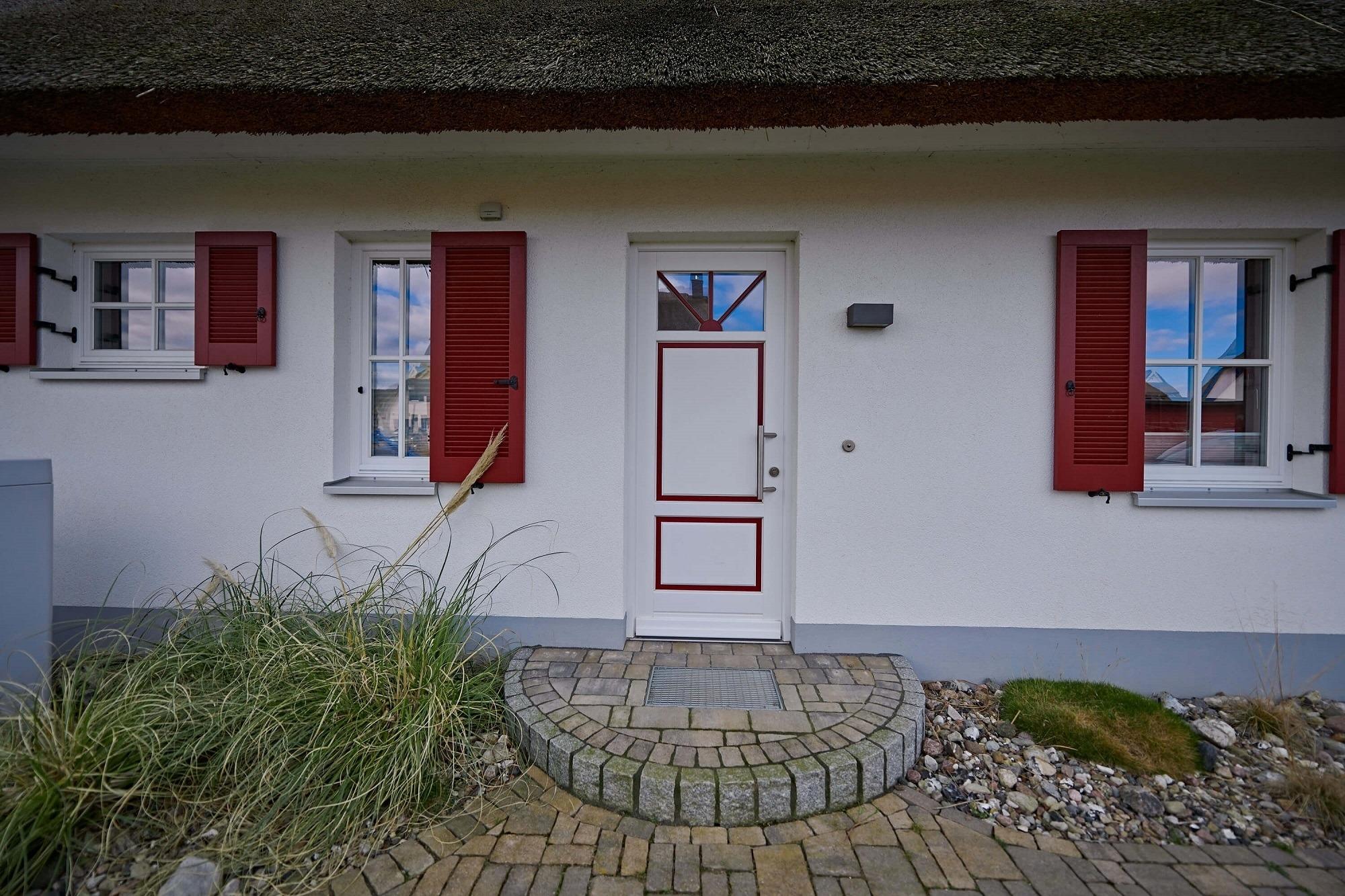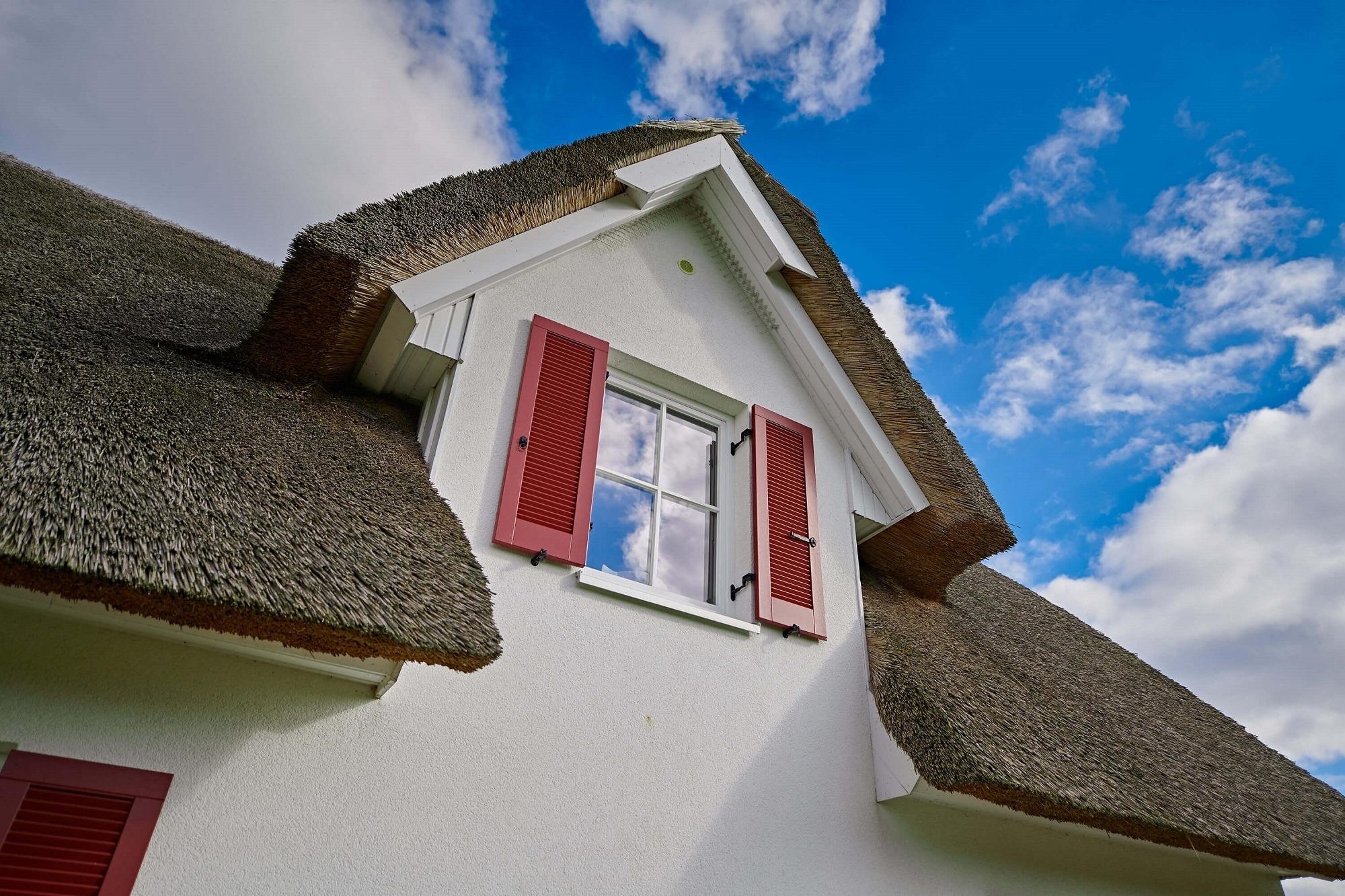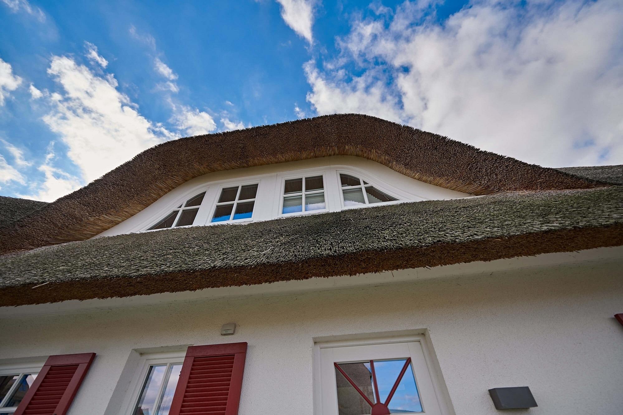 Das Duschbad mit Echtglasduschabtrennung, Waschbecken und WC ist in der typischen Fledermausgaube des Reethauses eingerichtet.