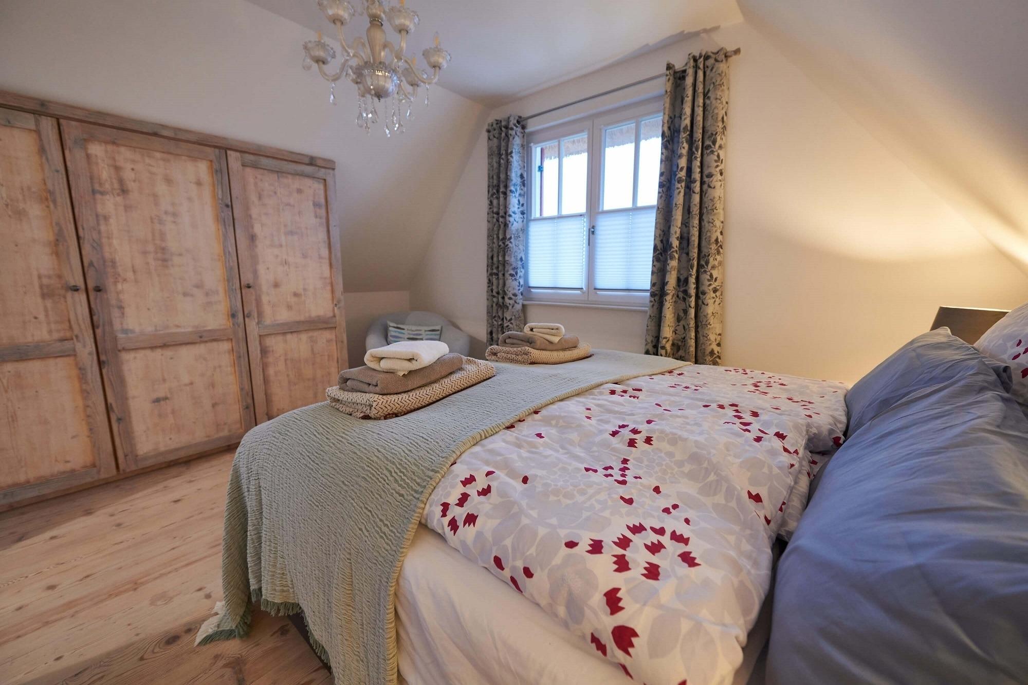 Im oberen Bereich stehen Ihnen zwei Schlafzimmer mit je einem Boxspringbett und Kommoden zur Verfügung.