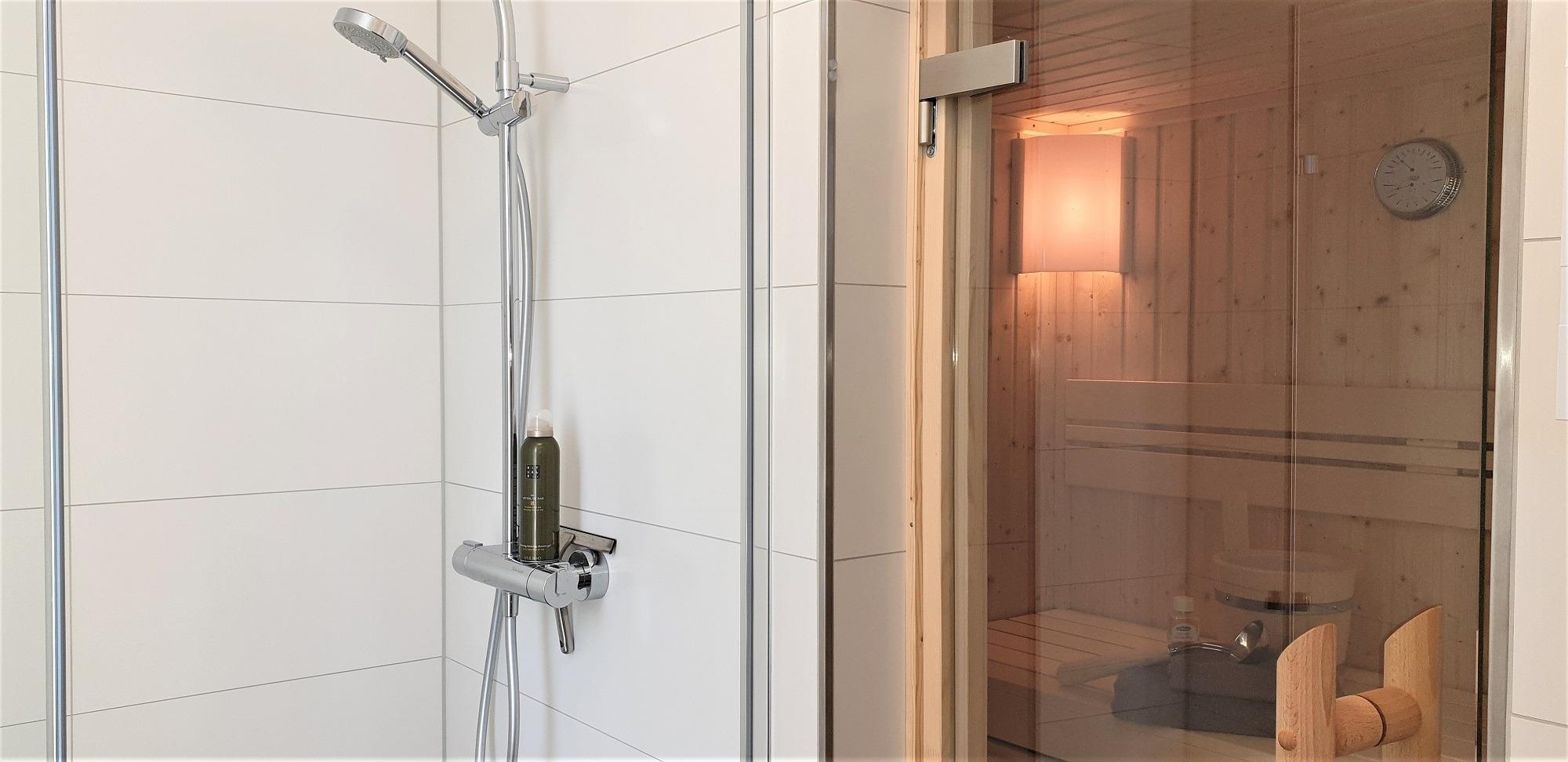 Das Erdgeschoss ist das Herz des Hauses. Von einer großen Küchenzeile, einer romantischen Couchecke vor dem Kamin bis hin zu einem großen Esstisch für 6 Personen, steht euch alles was das Herz begehrt zur Verfügung. Egal ob Kochabende, Gesellschaftsspiele (eine Auswahl an eigenen Favoriten vorhanden) oder einfach ein Wein vor dem Kamin, alles was uns glücklich macht, soll auch euch glücklich machen. Damit ihr auch im Winter warme Füße habt und nicht friert, ist im ganzen Haus eine Fußbodenheizung installiert. Im Hauswirtschaftsraum steht euch eine Waschmaschine, Wäschetrockner, Staubsauger, Bügelbrett, Bügeleisen etc. zur Verfügung. Zudem findet ihr im Erdgeschoss ein Gäste-WC mit Tageslicht, sowie einen kleinen „Wellness-Bereich“ mit Sauna und Regendusche.