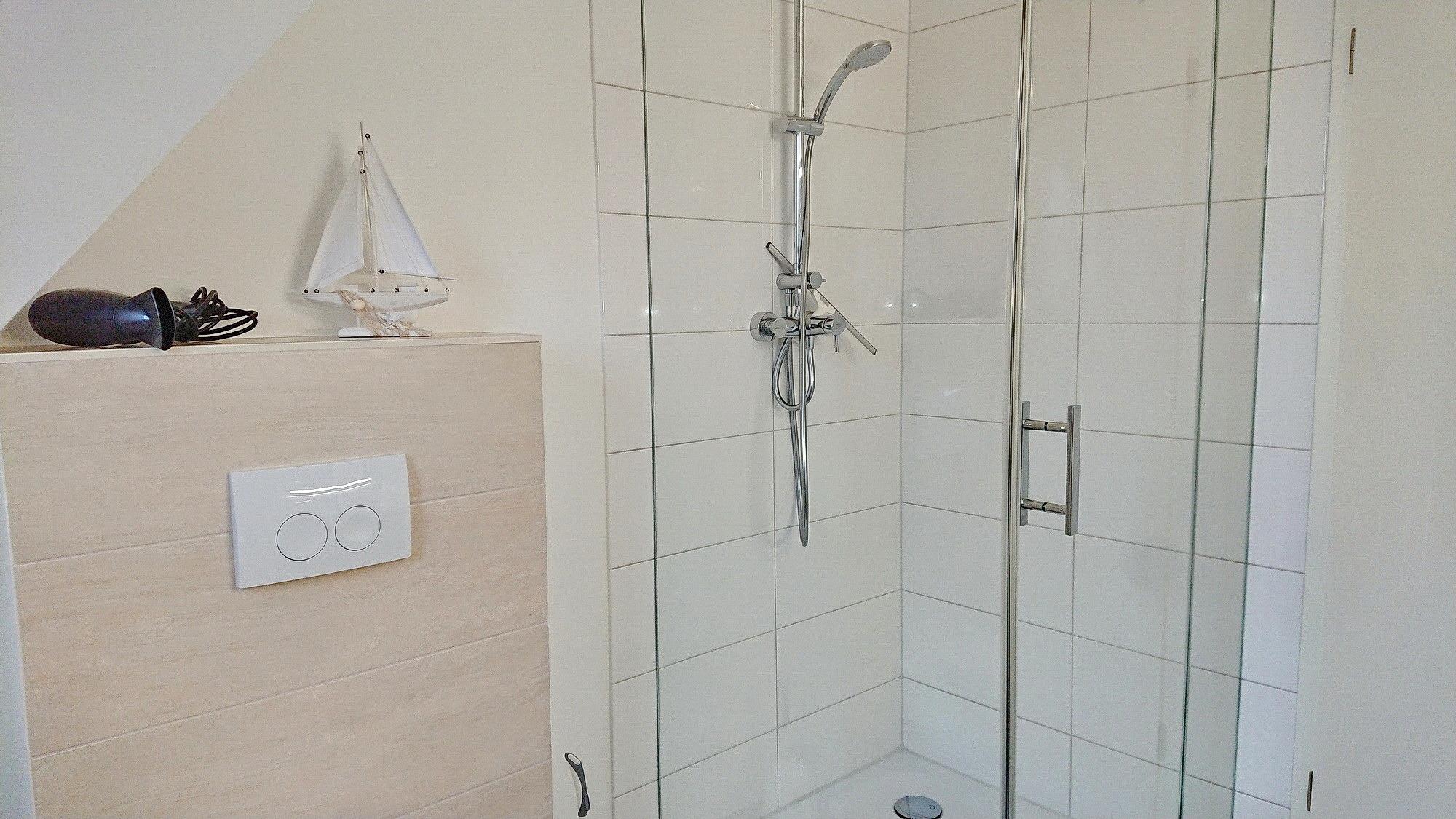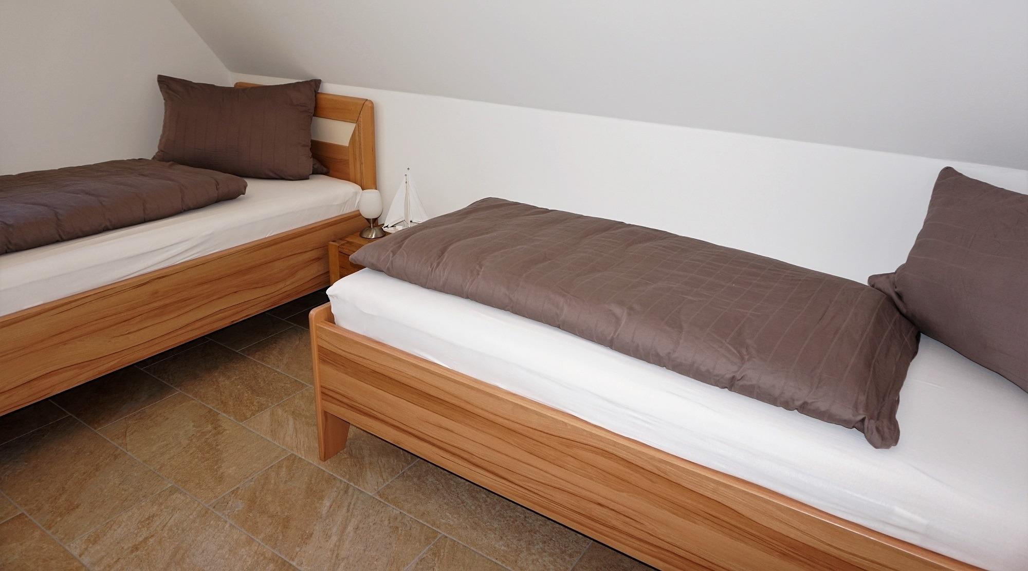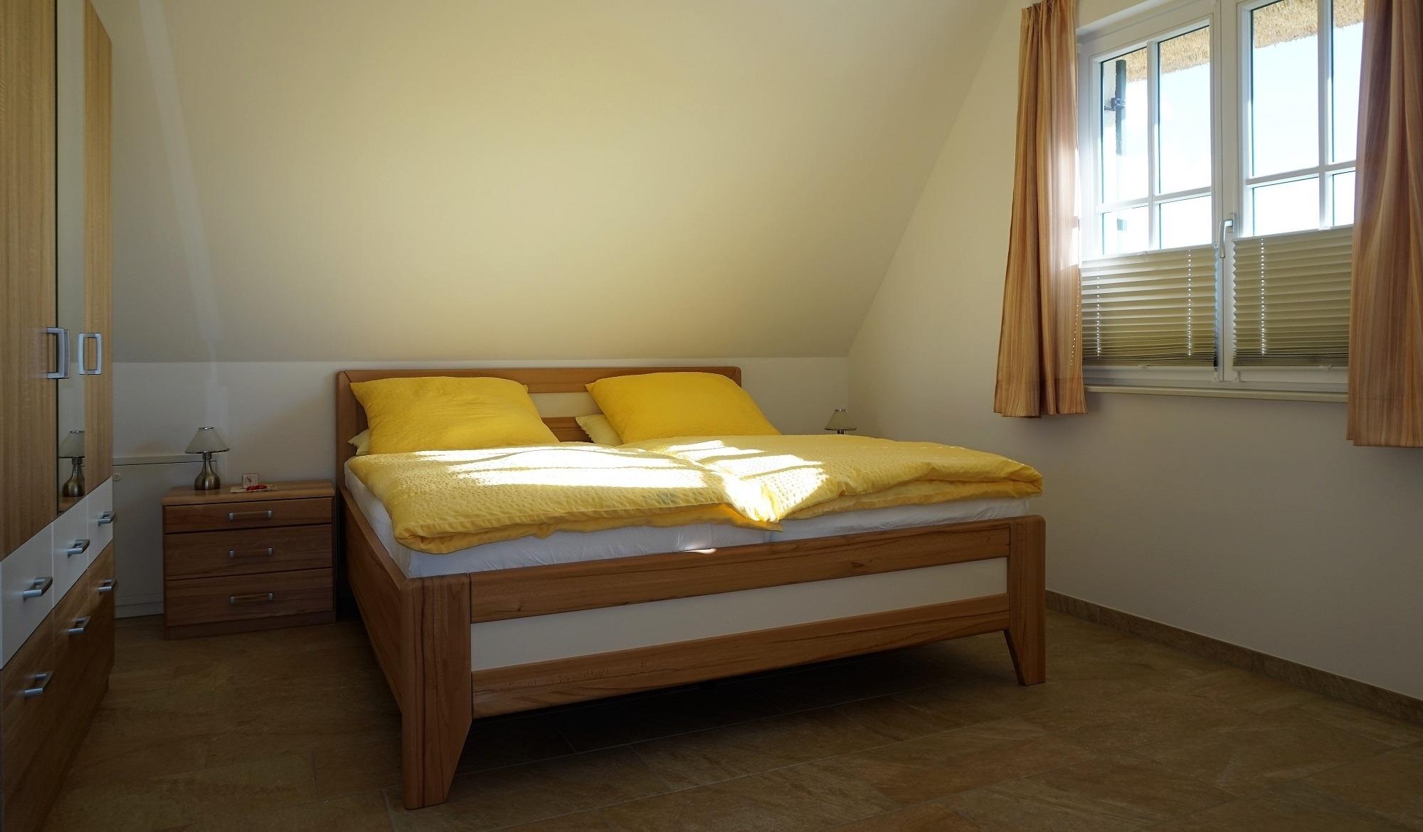 Im Obergeschoss können sich bequem vier Personen in den zwei Schlafzimmern zurück ziehen.[nbsp]Im ersten Schlafzimmer stehen zwei Einzelbetten (a`90x200) bereit. Im zweiten Schlafzimmer steht ein Doppelbett (180x200) sowie ein Kleiderschrank und ein Sofa für entspannte Lesestunden. Hier kann bei Bedarf ein Kinderreisebett aufgestellt werden. Alle Räume lassen sich durch die Außenläden und Vorhänge bzw. Plieses verdunkeln. Ein Lüften ist dank der Fliegenschutzgitter zu jeder Zeit möglich. Eine Fußbodenheizung sorgt für ein angenehmes Raumklima. Haustiere sind nicht gestattet und das Rauchen ist nur im Freien erlaubt. Im Abstellschuppen stehen ein Bollerwagen und Strandliegen und er bietet zusätzlich Platz für mitgebrachte Fahrräder.