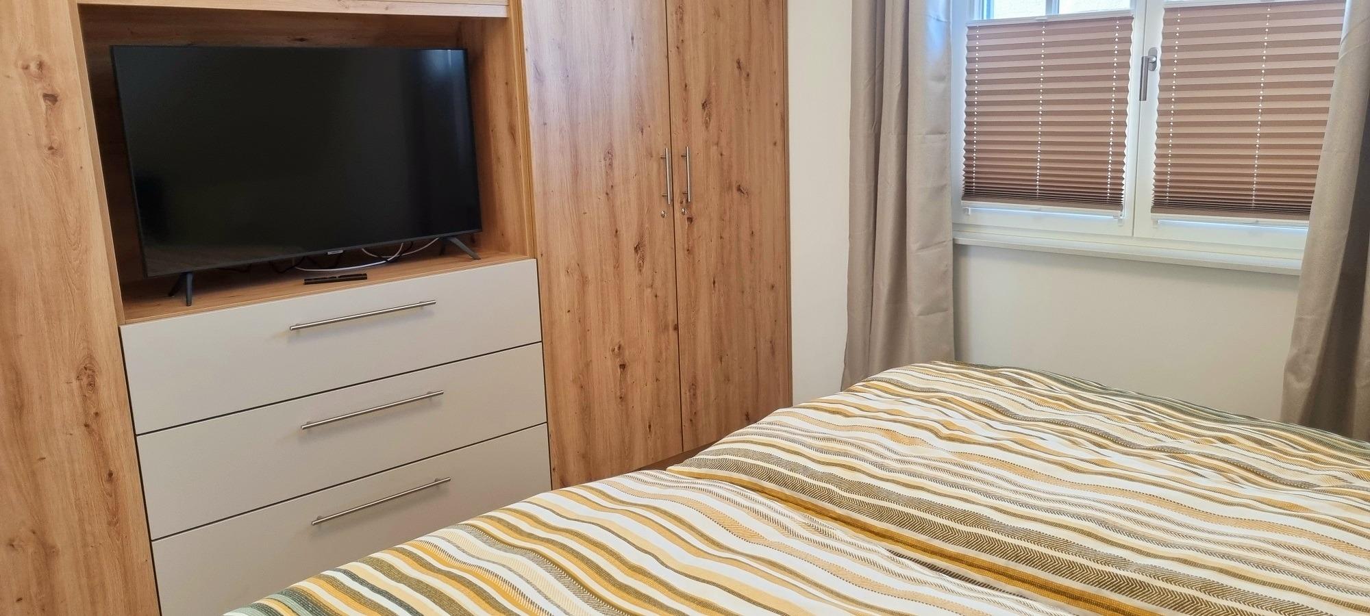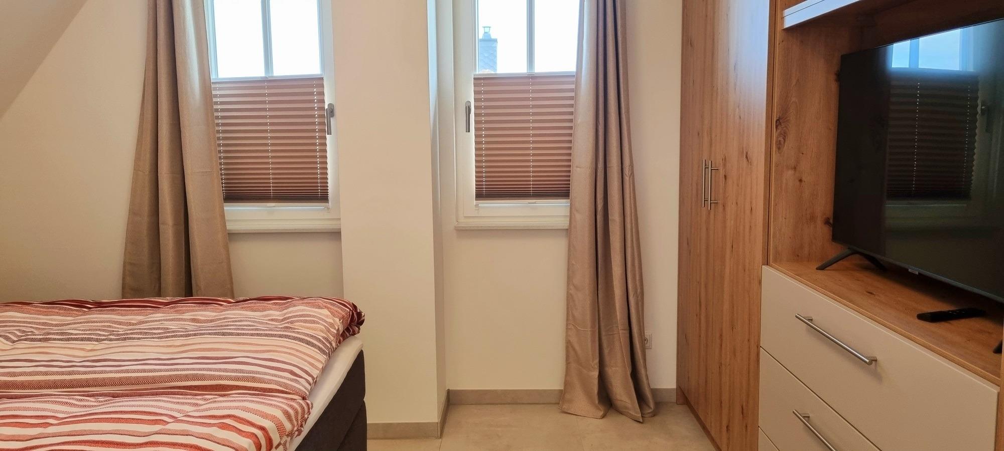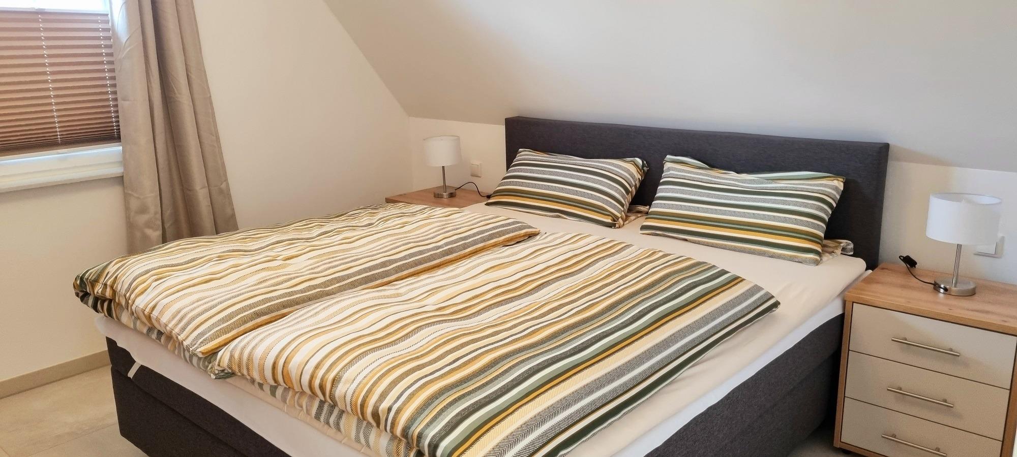 Im Obergeschoß befinden sich 2 Schlafzimmer. Beide sind mit Boxspringbetten für jeweils 2 Personen und mit jeweils einen Wandschrank und Fernseher ausgestattet. Ein Badezimmer mit Wanne, Dusche, WC, Waschbecken, Spiegelschrank und Haartrockner steht zur Verfügung.