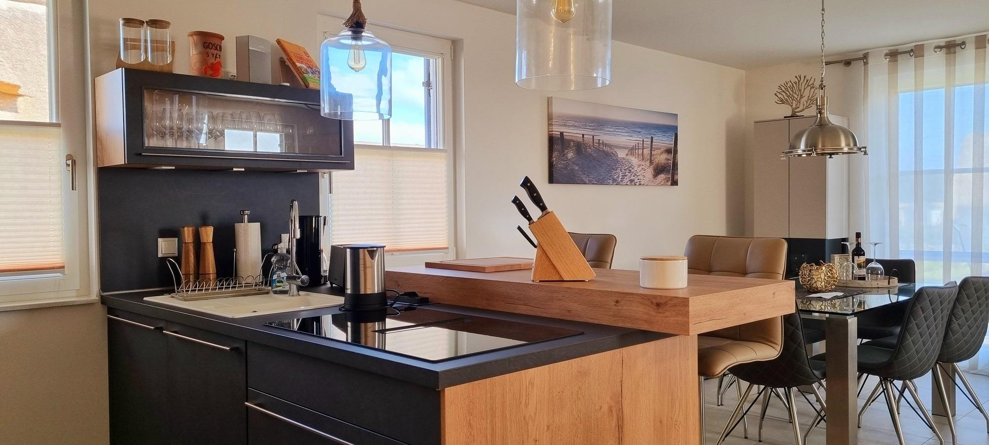 Eine offene Küche mit Theke, 2 Barhockern und einem Glastisch mit 6 komfortablen Stühlen bietet ausreichend Sitzgelegenheiten während der Mahlzeiten. Ein Induktionsherd mit integriertem Dunstabzug, ein Backofen, eine Kaffeemaschine, ein Wasserkocher, ein Eierkocher und sämtlicher Küchenzubehör bieten alle Annehmlichkeiten für gelungene Mahlzeiten. Ein Kühlschrank mit Tiefkühlfach und eine Geschirrspülmaschine sind ebenfalls vorhanden.