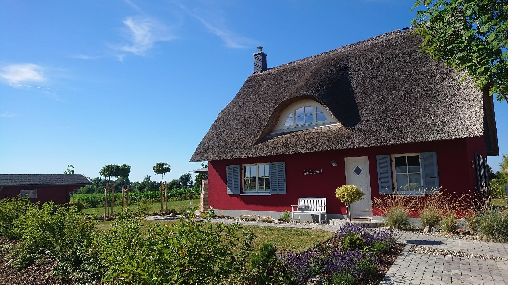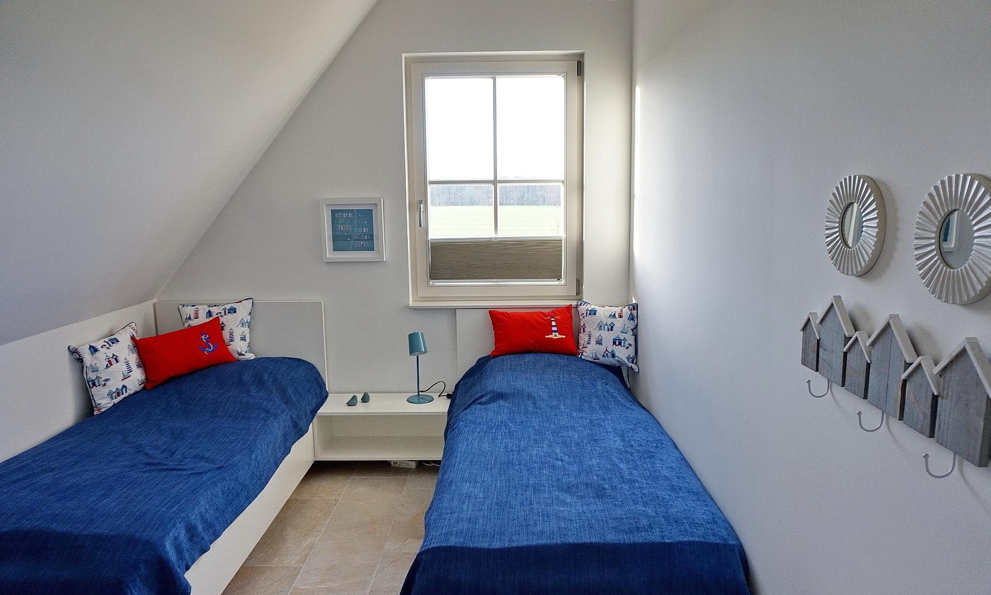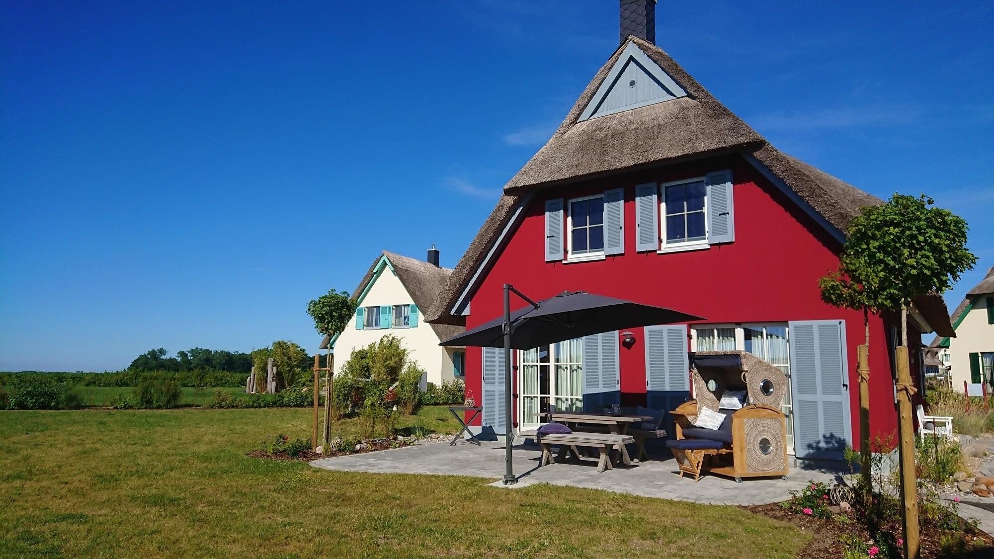Im Hauswirtschaftsraum finden Sie Waschmaschine, Trockner, Wäscheständer, Bügeleisen, Bügelbrett, Staubsauger und Putzutensilien. Im Obergeschoss erwarten Sie zwei Schlafzimmer mit je einem Doppelbett (1,80 x 2 m) sowie ein Kinderzimmer mit zwei Einzelbetten. Alle Zimmer bieten durch die maßgefertigten Einbaumöbel ausreichend Stauraum für Ihr Gepäck und sind außerdem durch Plissees oder Vorhänge abzudunkeln. Von einem Schlafzimmer aus haben Sie einen schönen Blick auf die Ostsee. Ein weiteres Zimmer mit Schlafcouch kann als Rückzugsmöglichkeit zum Entspannen, Fernsehen, Arbeiten oder Lesen genutzt werden. Hier steht ein Schreibtisch mit Blick auf die Ostsee für Sie bereit. W-LAN ist frei verfügbar. Das sehr hochwertig eingerichtete Vollbad mit freistehender Badewanne rundet dieses besondere Feriendomizil ab. Beim Duschen können Sie den Ausblick auf Felder und das dahinterliegende Meer genießen. Die im ganzen Haus verlegte Fußbodenheizung sorgt für ein angenehmes Raumklima. Auf dem großen Grundstück befindet sich ein Gartenhaus, in dem Sie den hauseigenen Gasgrill und Ihre mitgebrachten Fahrräder gerne unterstellen können. Ein Bollerwagen steht für Ihren Strandbesuch bereit. Der hochwertige Strandkorb und die Sonnenliegen laden zu Sonnenstunden auf der Terrasse ein. Die Vollholzmöbel bieten genügend Platz für gemütliche Grillabende mit Blick auf die Ostsee. Vor dem Haus sind zwei Stellplätze für Ihre PKW angelegt.