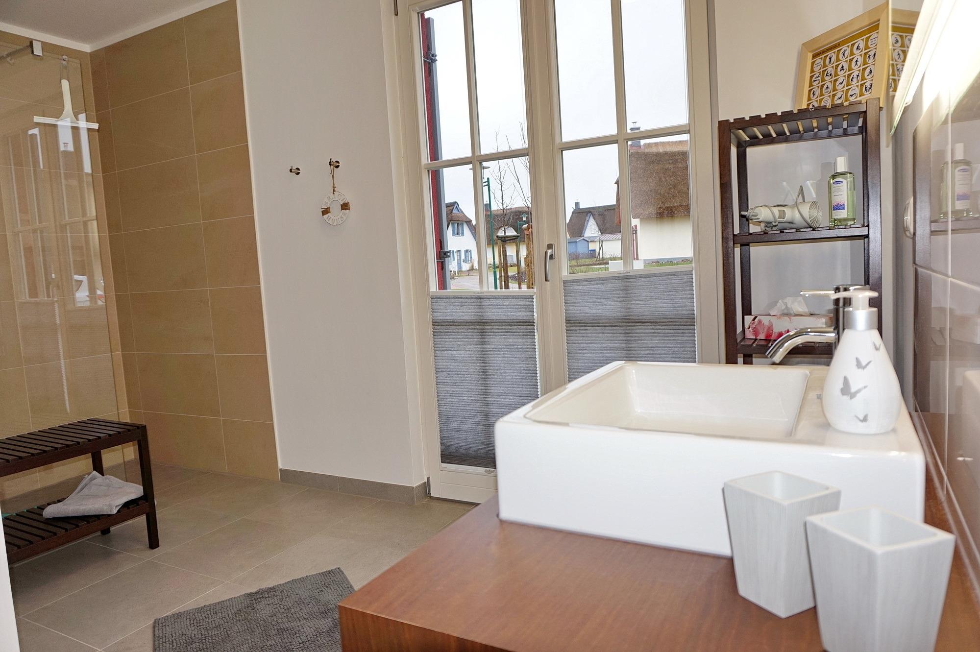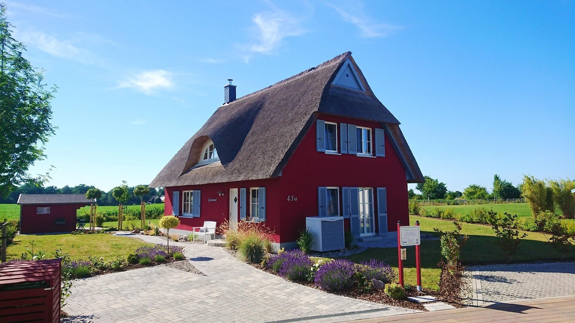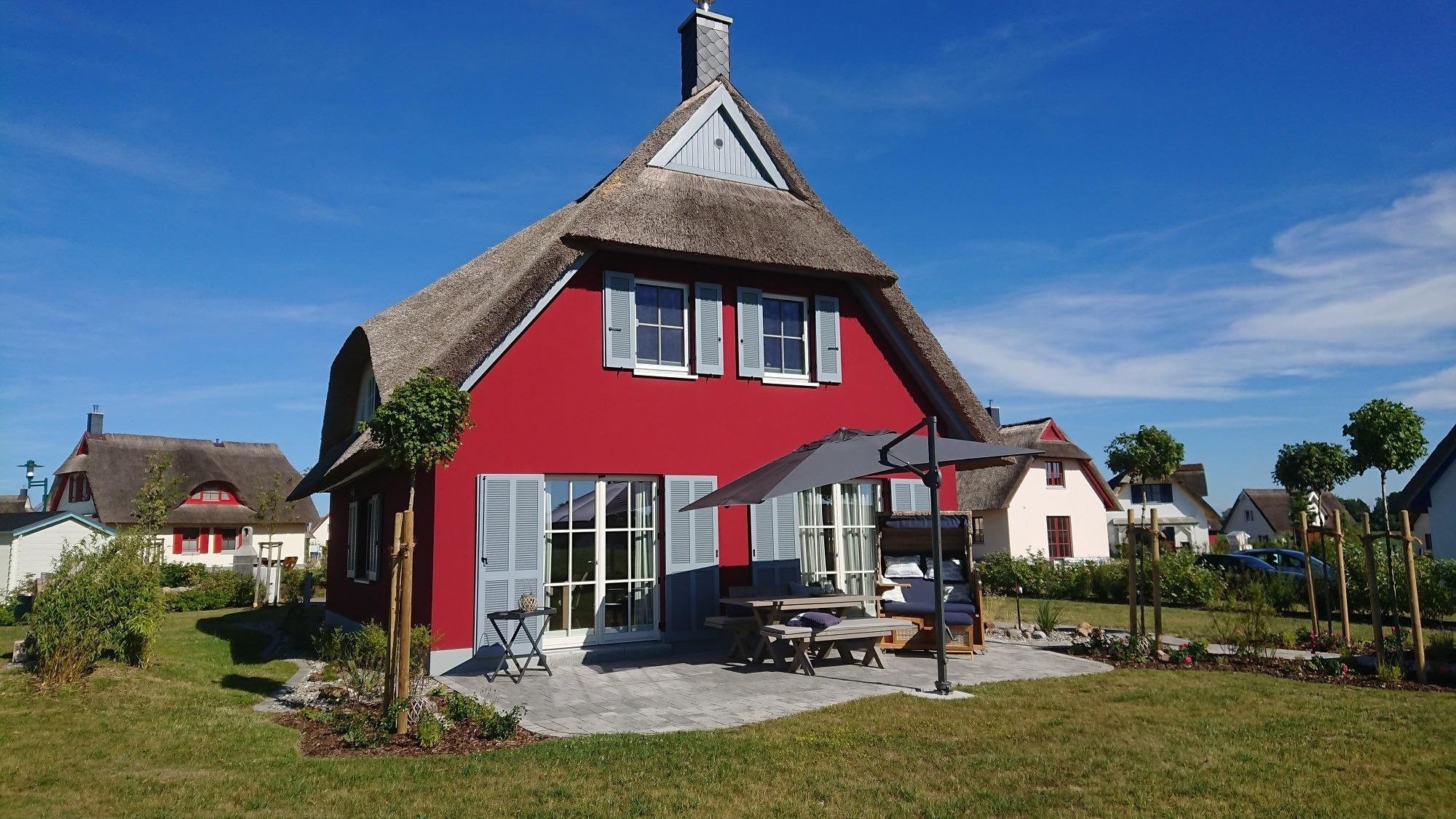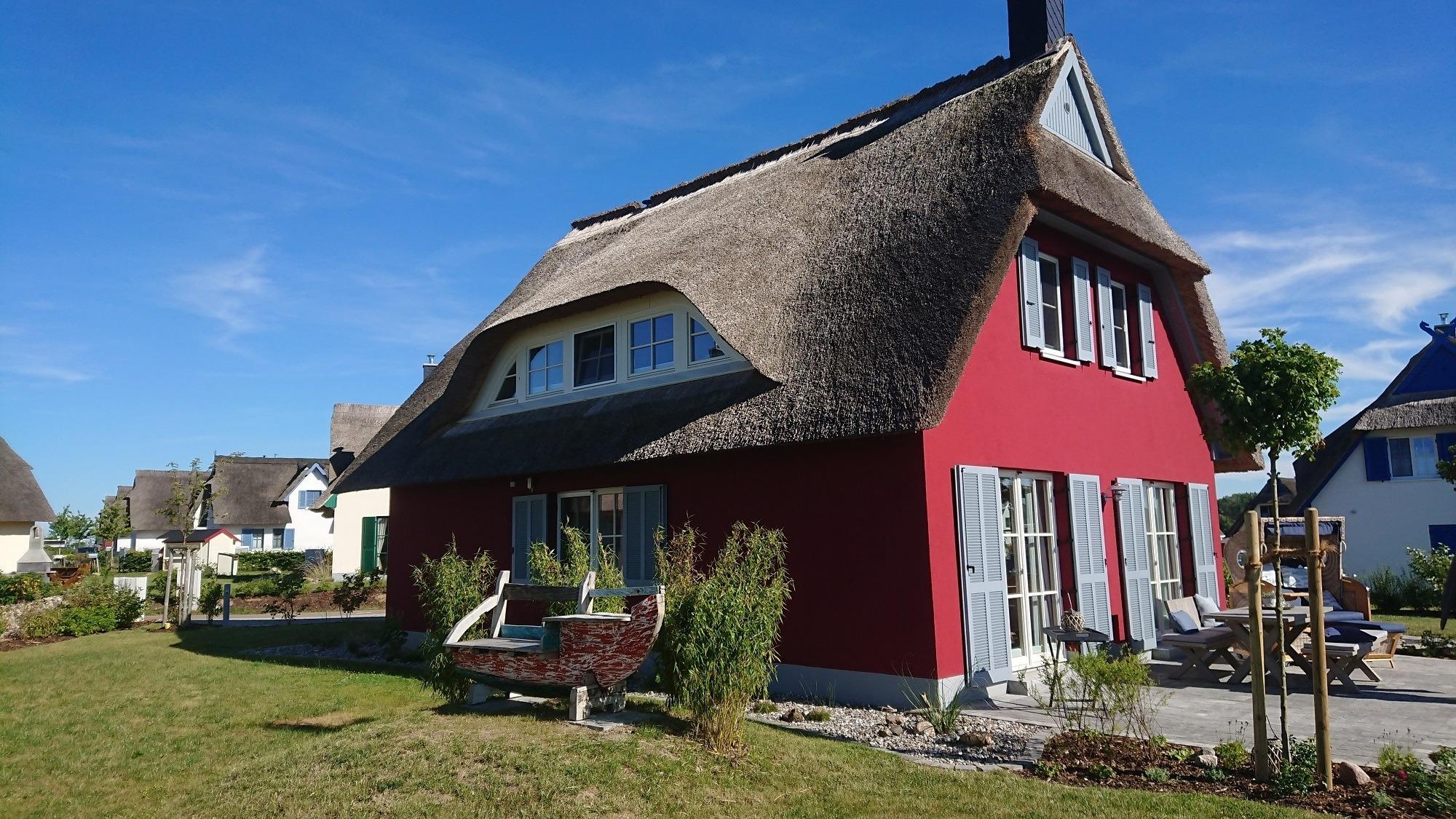 Im Hauswirtschaftsraum finden Sie Waschmaschine, Trockner, Wäscheständer, Bügeleisen, Bügelbrett, Staubsauger und Putzutensilien. Im Obergeschoss erwarten Sie zwei Schlafzimmer mit je einem Doppelbett (1,80 x 2 m) sowie ein Kinderzimmer mit zwei Einzelbetten. Alle Zimmer bieten durch die maßgefertigten Einbaumöbel ausreichend Stauraum für Ihr Gepäck und sind außerdem durch Plissees oder Vorhänge abzudunkeln. Von einem Schlafzimmer aus haben Sie einen schönen Blick auf die Ostsee. Ein weiteres Zimmer mit Schlafcouch kann als Rückzugsmöglichkeit zum Entspannen, Fernsehen, Arbeiten oder Lesen genutzt werden. Hier steht ein Schreibtisch mit Blick auf die Ostsee für Sie bereit. W-LAN ist frei verfügbar. Das sehr hochwertig eingerichtete Vollbad mit freistehender Badewanne rundet dieses besondere Feriendomizil ab. Beim Duschen können Sie den Ausblick auf Felder und das dahinterliegende Meer genießen. Die im ganzen Haus verlegte Fußbodenheizung sorgt für ein angenehmes Raumklima. Auf dem großen Grundstück befindet sich ein Gartenhaus, in dem Sie den hauseigenen Gasgrill und Ihre mitgebrachten Fahrräder gerne unterstellen können. Ein Bollerwagen steht für Ihren Strandbesuch bereit. Der hochwertige Strandkorb und die Sonnenliegen laden zu Sonnenstunden auf der Terrasse ein. Die Vollholzmöbel bieten genügend Platz für gemütliche Grillabende mit Blick auf die Ostsee. Vor dem Haus sind zwei Stellplätze für Ihre PKW angelegt.