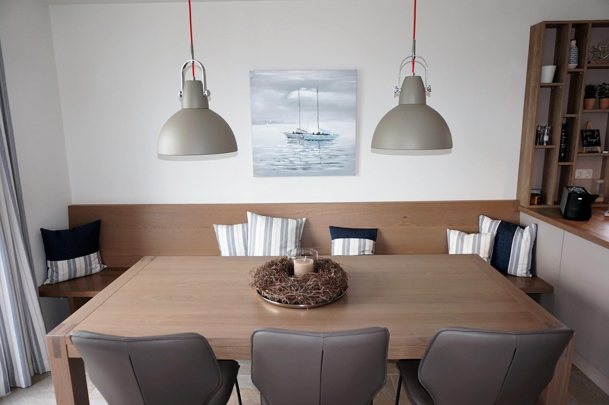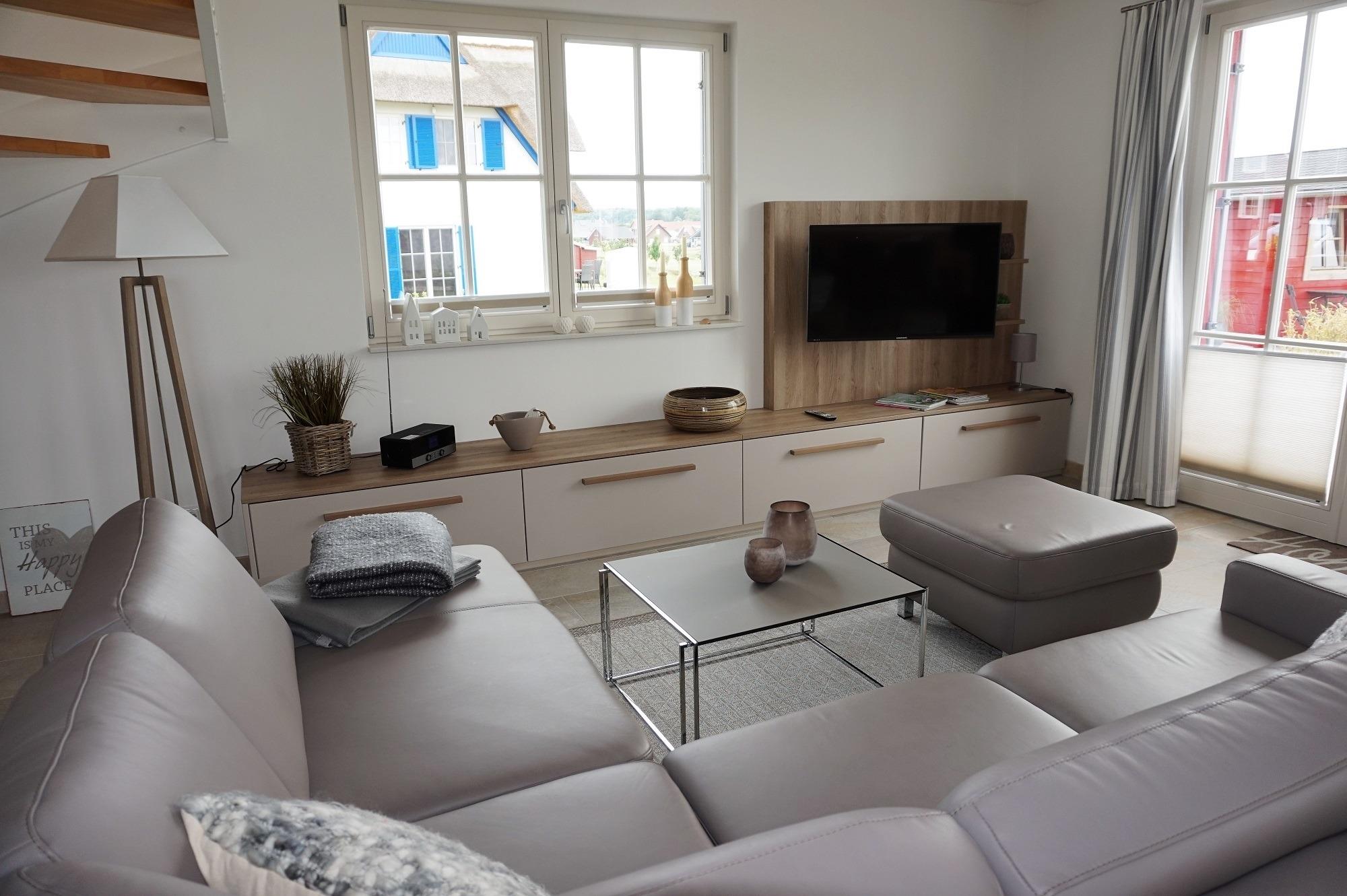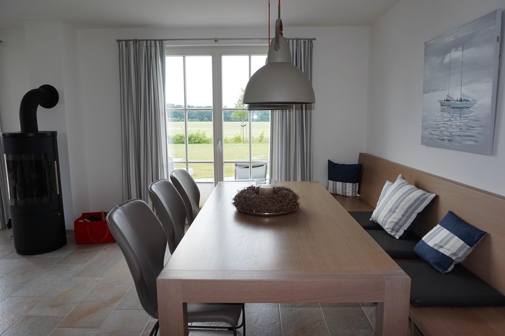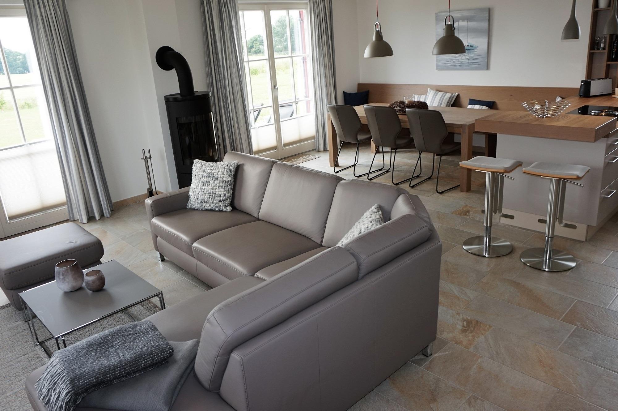 ....können Sie zu jeder Jahreszeit in diesem hochwertig und mit viel Liebe zum Detail ausgestatteten Ferienhaus mit Meerblick. Es wurde 2016 neu erbaut, bietet auf 126 qm ausreichend Platz für bis zu 6 Personen und ist sowohl für Familien als auch für 2-3 Ehepaare ideal geeignet. Es liegt direkt am Strandweg, ist umgeben von einem 1300 qm großen Grundstück und bietet einen phantastischen Blick auf die Ostsee – bis hin zur Insel Poel. Im Erdgeschoss erwartet Sie ein geräumiger, heller Wohnbereich (48 qm) mit offener Küche, Kamin, einem gemütlichen Ecksofa und einer großen Sitzlounge für die ganze Familie. Er bildet das kommunikative Herzstück dieses Hauses. In der maßgeschneiderten und mit viel Komfort ausgestatteten Küche (Induktionskochfeld, Backofen, Mikrowelle, Kühlschrank mit Gefrierfach, Geschirrspüler, Kaffeemaschine, Toaster, Wasserkocher, Mixer, Entsafter) wird das gemeinsame Kochen zu einem schönen Urlaubserlebnis. Von einem Platz an der Küchentheke können Sie Ihren Blick über die Wismarer Bucht schweifen lassen. Der große Familientisch lädt zu gemeinsamen Essen und zu langen Spieleabenden in gemütlicher Runde ein. An kühleren Tagen können Sie vor dem knisternden Kaminofen entspannen. Die Farbgestaltung der gesamten Einrichtung ist in Naturtönen gehalten und wirkt dadurch sehr harmonisch. Vom Wohnbereich aus haben Sie einen direkten Zugang zur Westterrasse. Sie ist mit Gartenmöbeln und Sonnenliegen sowie Sonnenschirm ausgestattet. Im Strandkorb können Sie den Sonnenuntergang genießen. Ein großes Duschbad mit Wellnessdusche und geräumiger Sauna steigert zusätzlich den Wohlfühlcharakter dieses besonderen Reetdachhauses. Ein separates Gäste-WC ist ebenfalls im Erdgeschoss vorhanden.